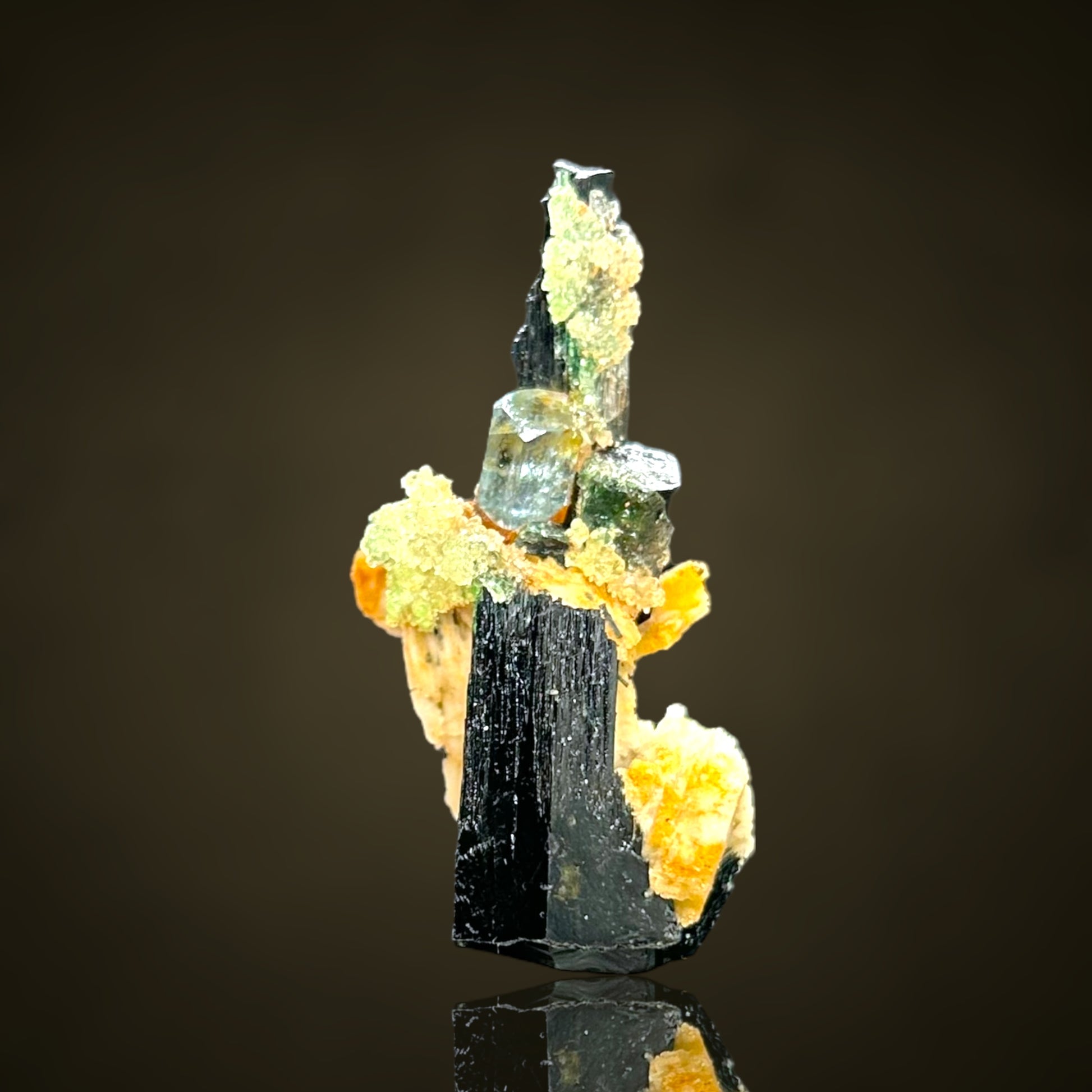 🇩🇪 Total brillianter Aquamarin mit edler Endfläche, auf einem Schörl Turmalin sitzend und von Hyalit gewissermassen ummantelt.