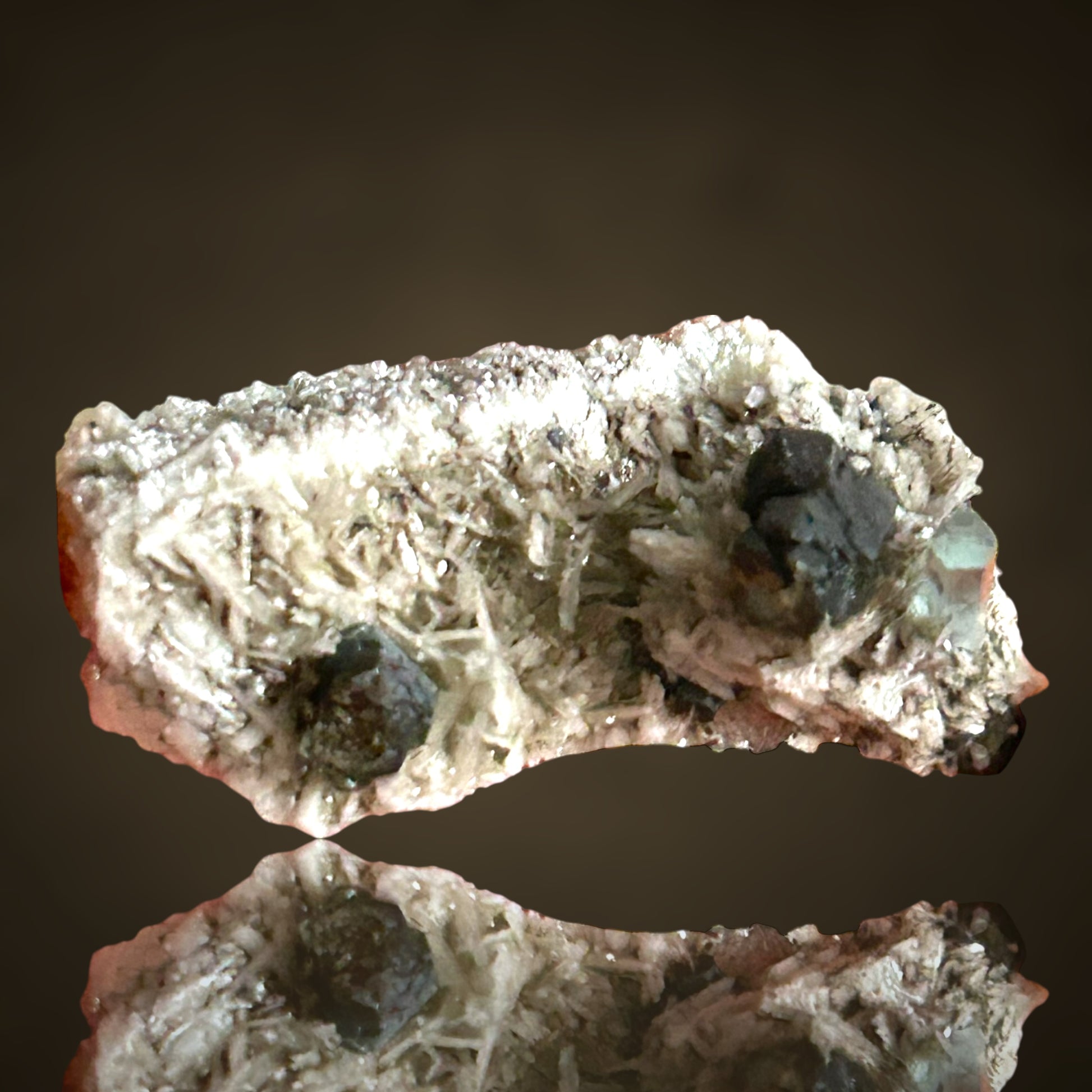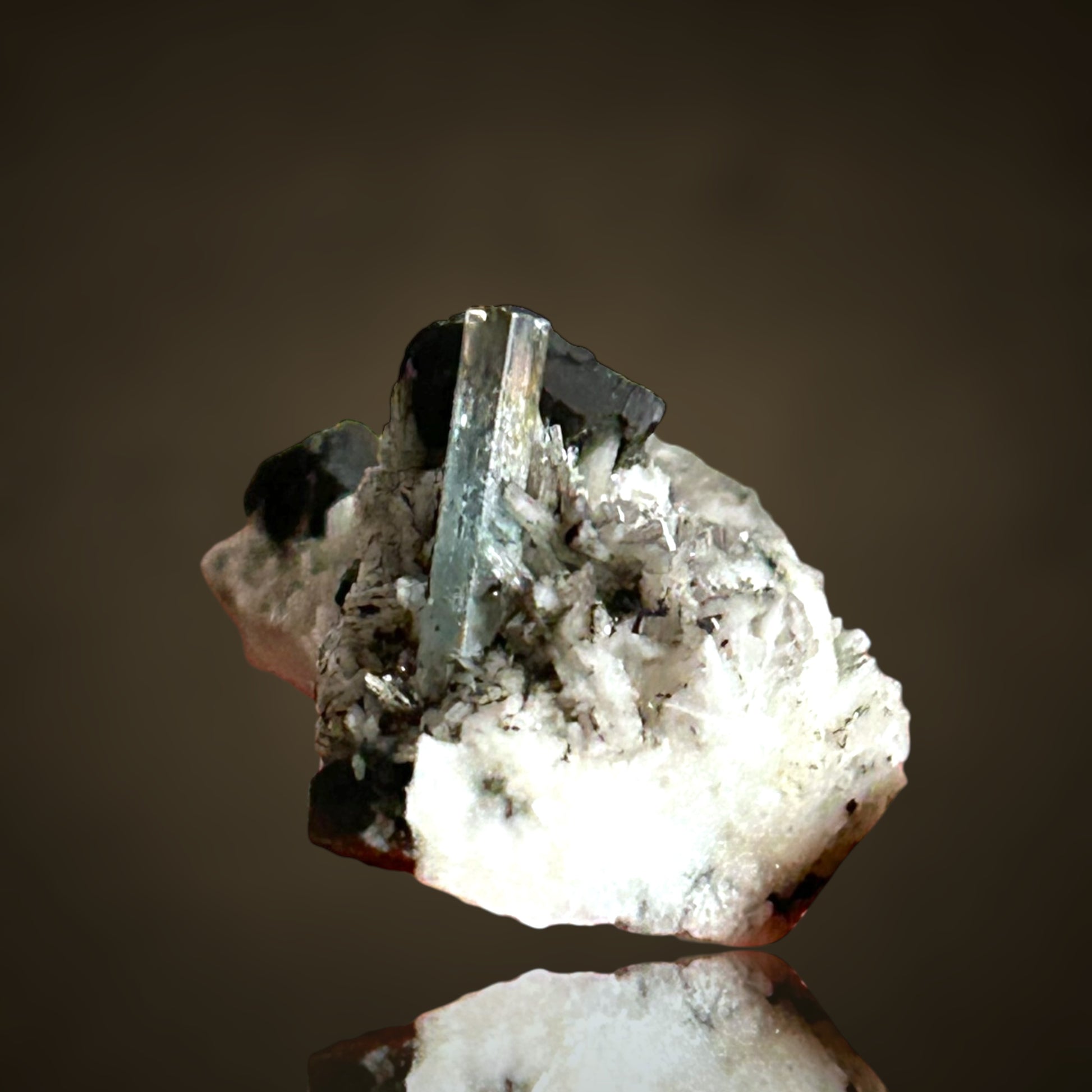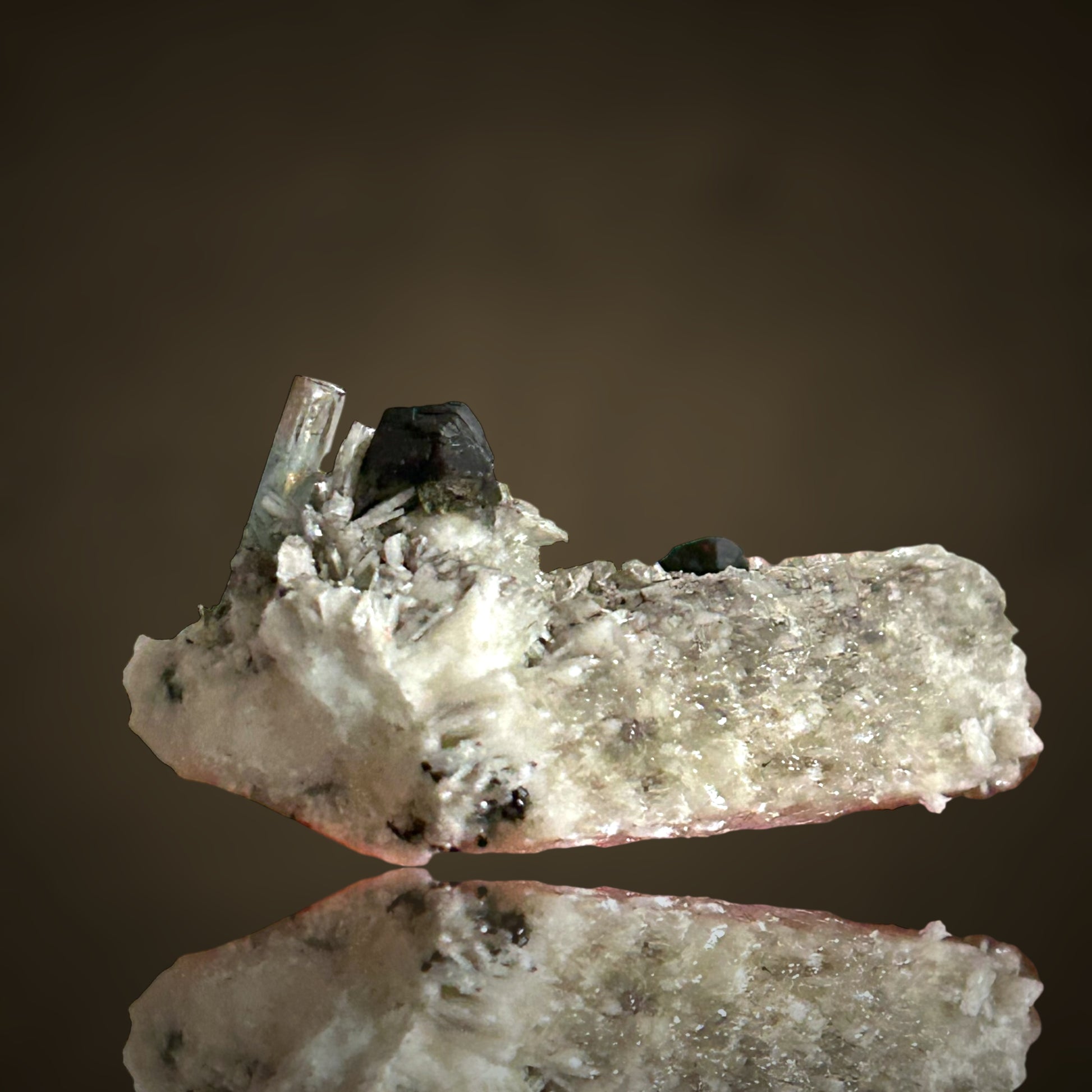 Ein klarer, scharfkantiger Aquamarinkristall erhebt sich stolz auf cremefarbenem Feldspat und zeigt eine ungewöhnlich feine und filigrane Oberflächenkristallisation entlang seiner Prismenflächen. Ergänzt wird das Schmuckstück durch prächtigen, gut ausgebildeten stapeligen Phlogopit – glänzend, geschichtet und ideal angeordnet, um die Präsenz des Aquamarins zu unterstreichen, ohne mit ihm zu konkurrieren.