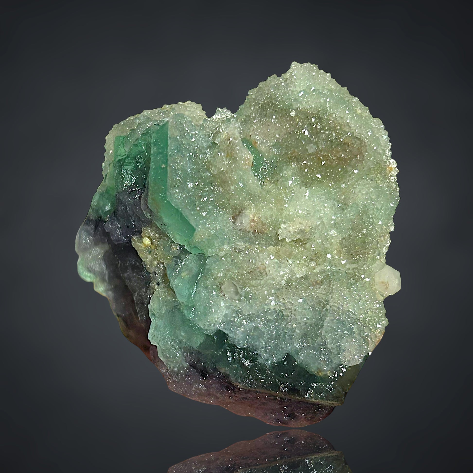 The octahedral fluorite crystals are further enhanced by a brilliant druse like coating of sparkling quartz, which adds depth, contrast, and intense light reflection to the entire specimen. Scattered on top of the quartz is minor hyalite, introducing an elegant yellow accent that contrasts beautifully uv reacting with the underlying fluorite.
