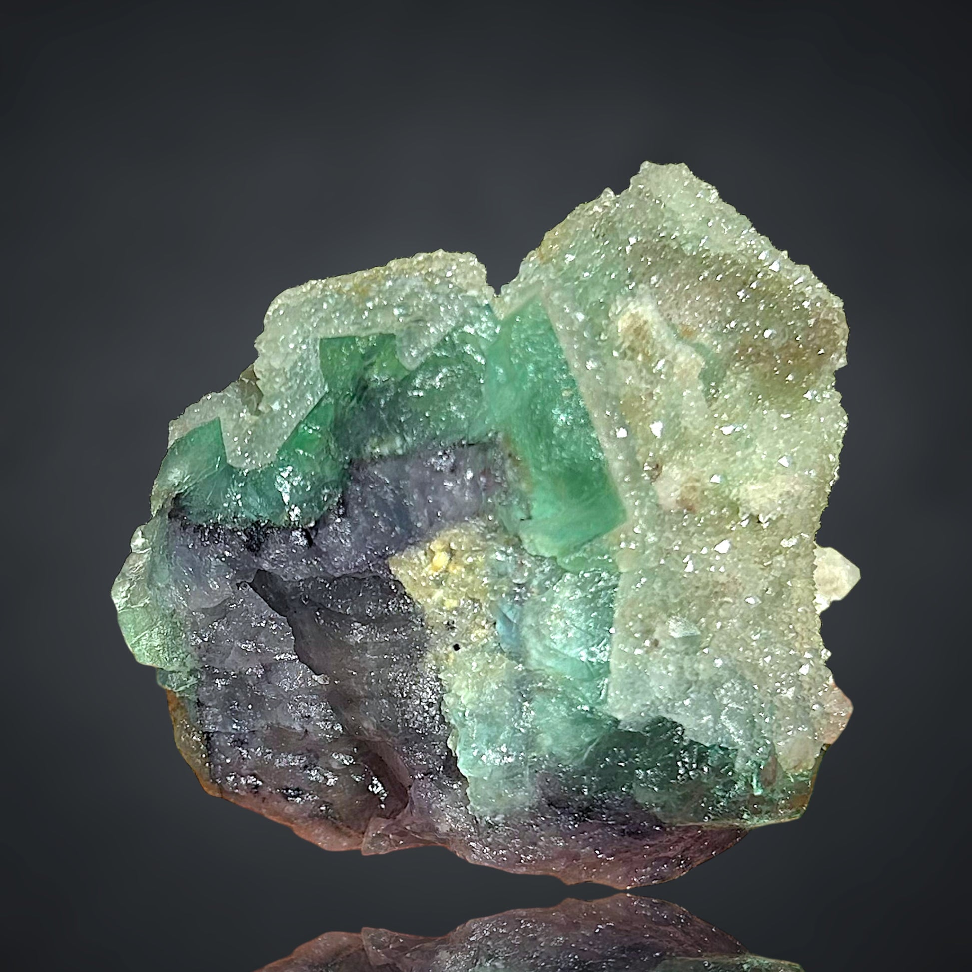 This exceptional and rare fluorite specimen from the Riemvasmaak area, South Africa, displays a striking natural color zoning that makes it highly desirable for advanced collectors. Well-formed green fluorite octahedrons are composed of a distinct violet fluorite core, clearly visible as a sharp phantom, overgrown by the famous apple-green fluorite for which Riemvasmaak is renowned.