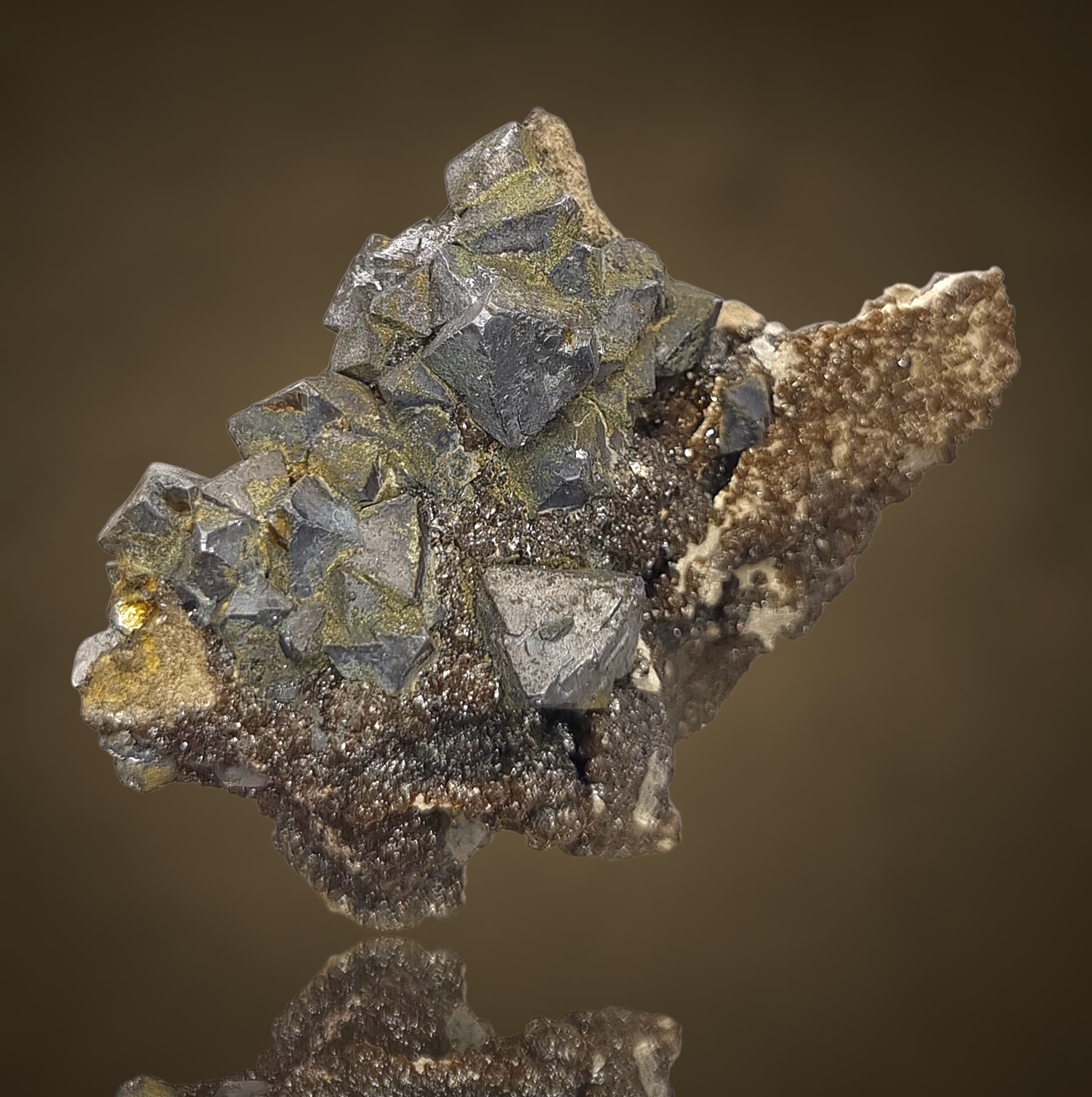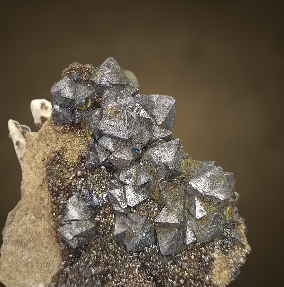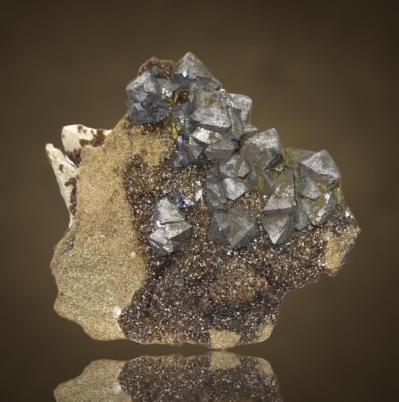 Fantastische Gruppe oktaedrischer Galenitkristalle mit sehr gut definierten Flächen und Kanten, einige mit Markasit bestäubt, auf einem Teppich aus winzigen braunen Sphaleritkügelchen auf Matrix aus der klassischen, aber weniger bekannten Pb-Zn-Lagerstätte in Polen.