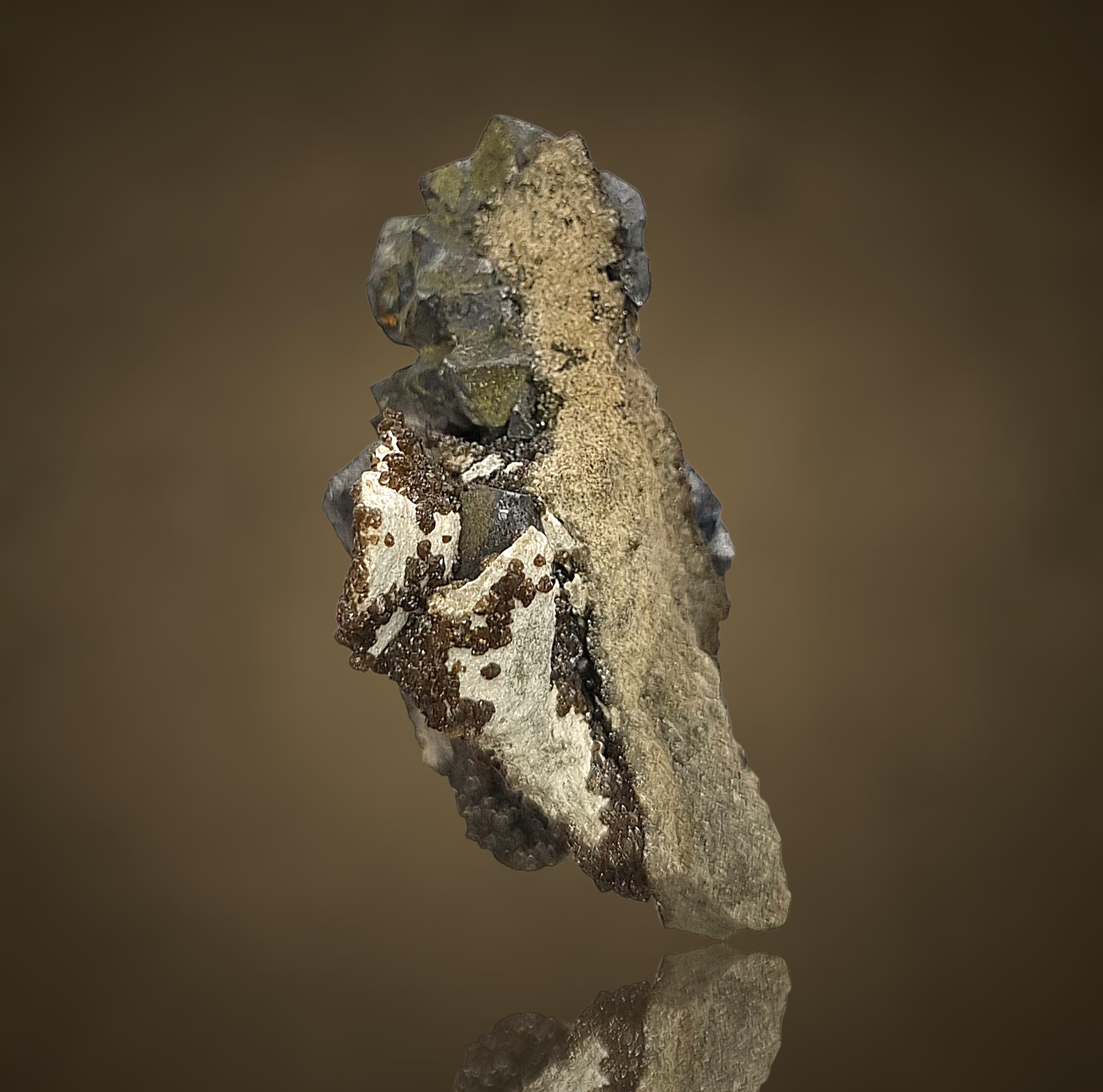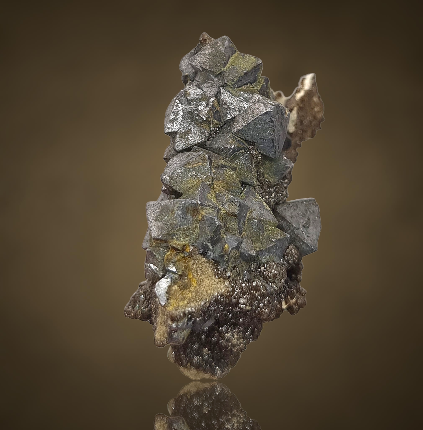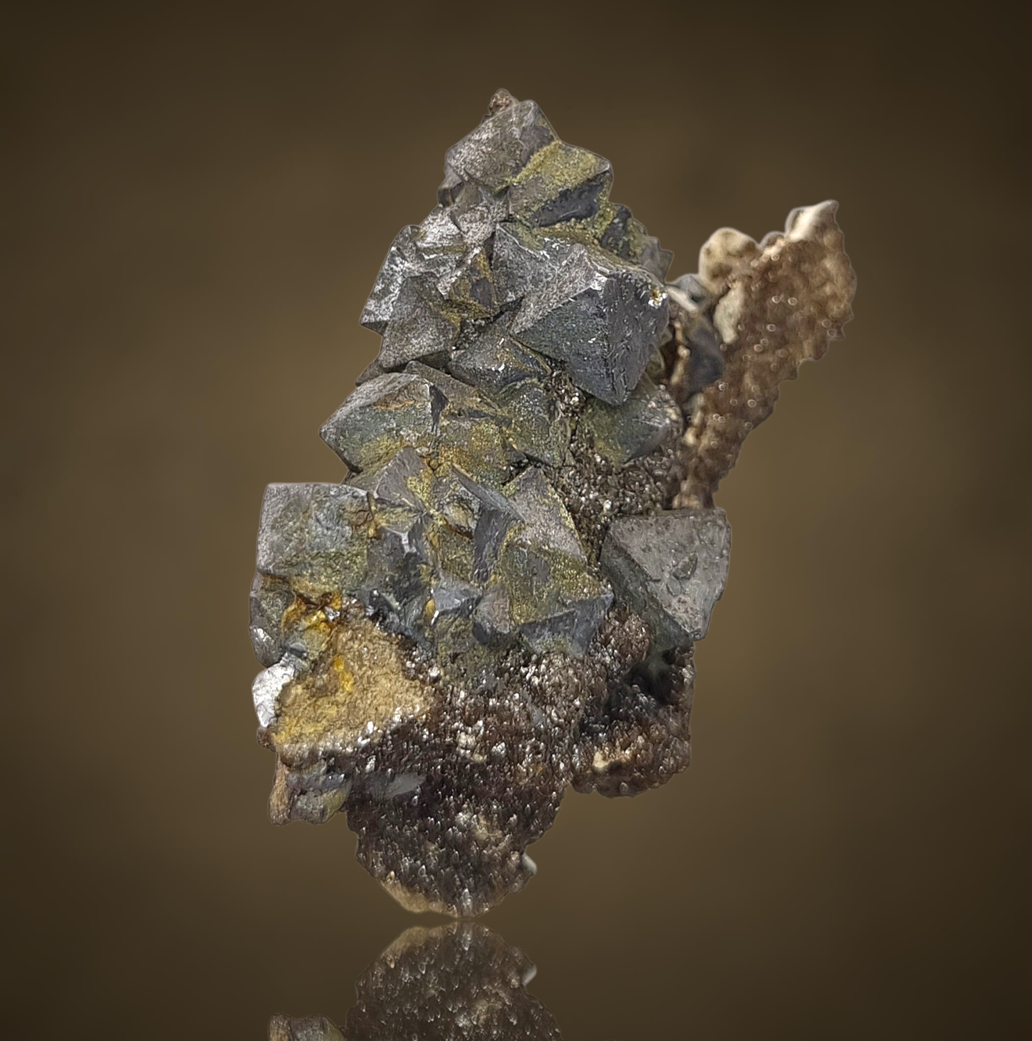 Fantastische Gruppe oktaedrischer Galenitkristalle mit sehr gut definierten Flächen und Kanten, einige mit Markasit bestäubt, auf einem Teppich aus winzigen braunen Sphaleritkügelchen auf Matrix aus der klassischen, aber weniger bekannten Pb-Zn-Lagerstätte in Polen.