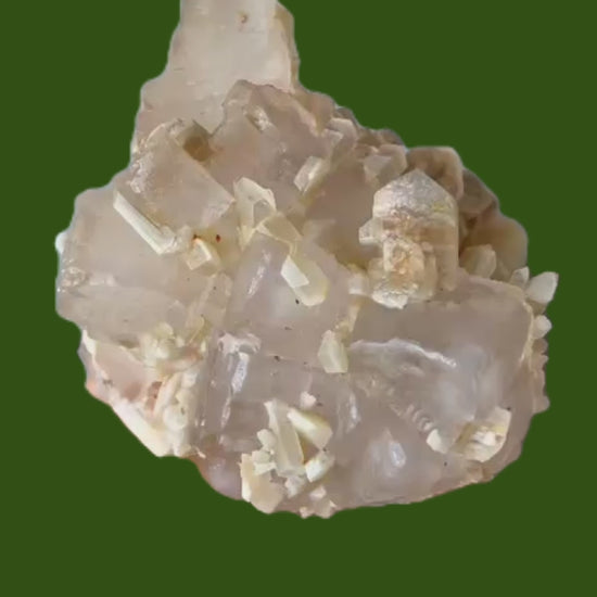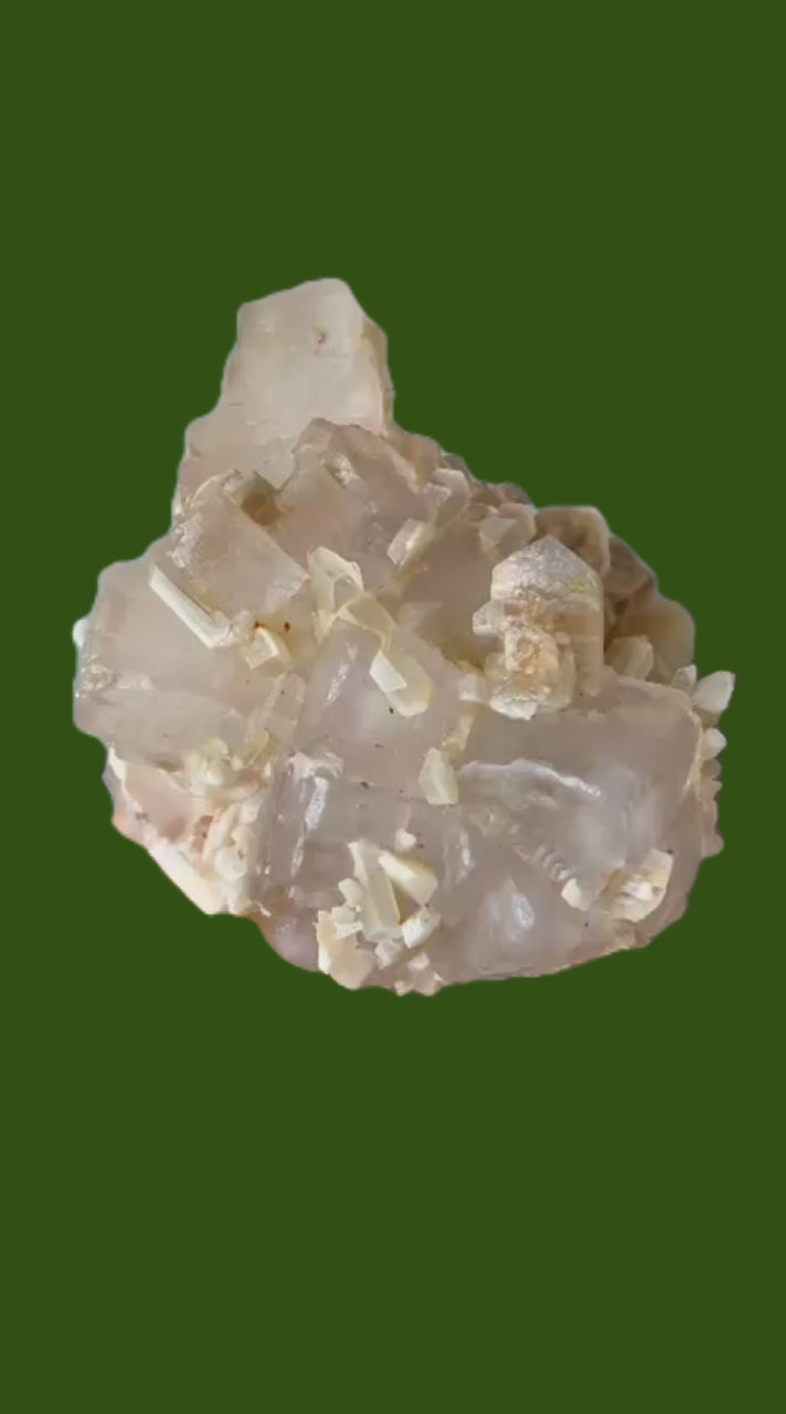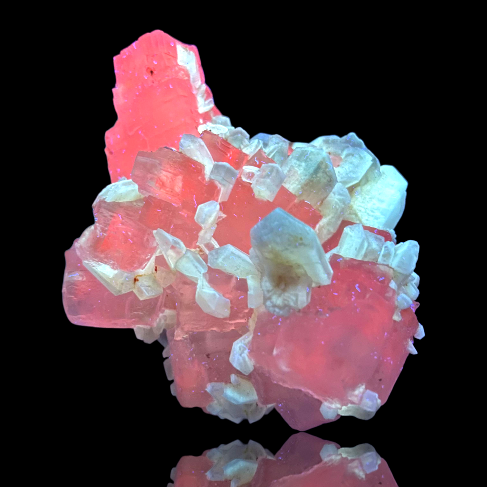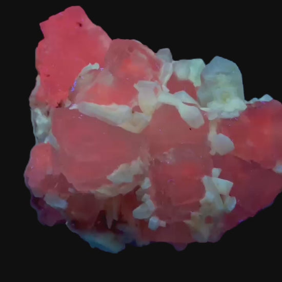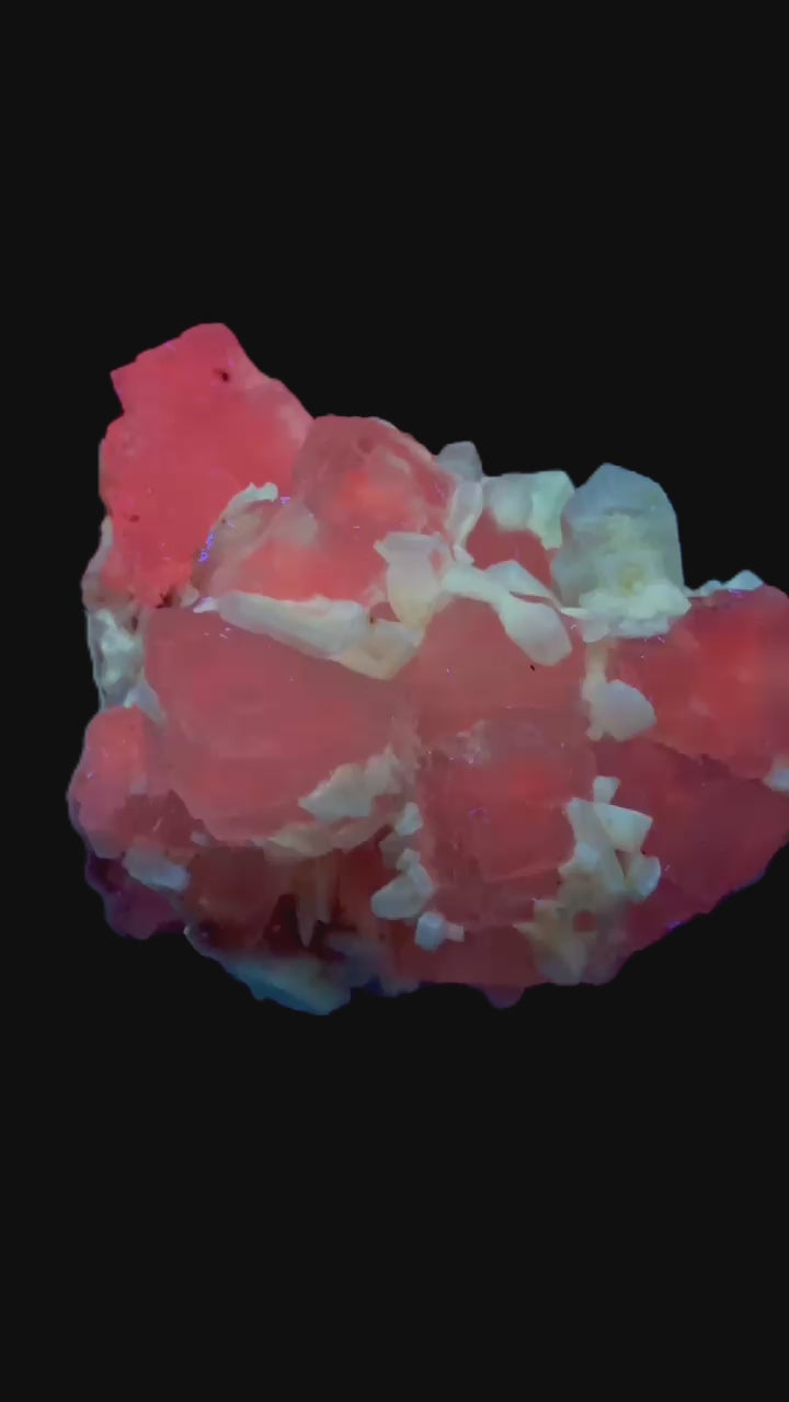 Mangangehalte im Halit verursachen unter UV-Licht eine intensive rot-orange Fluoreszenz, die durch die honigfarbenen Gips-Kristalle auf der Halit-Matrix noch verstärkt wird. Dadurch sind diese seltenen Stufen aus der versiegelten Kristallkammer bei Sammlern sehr begehrt.
