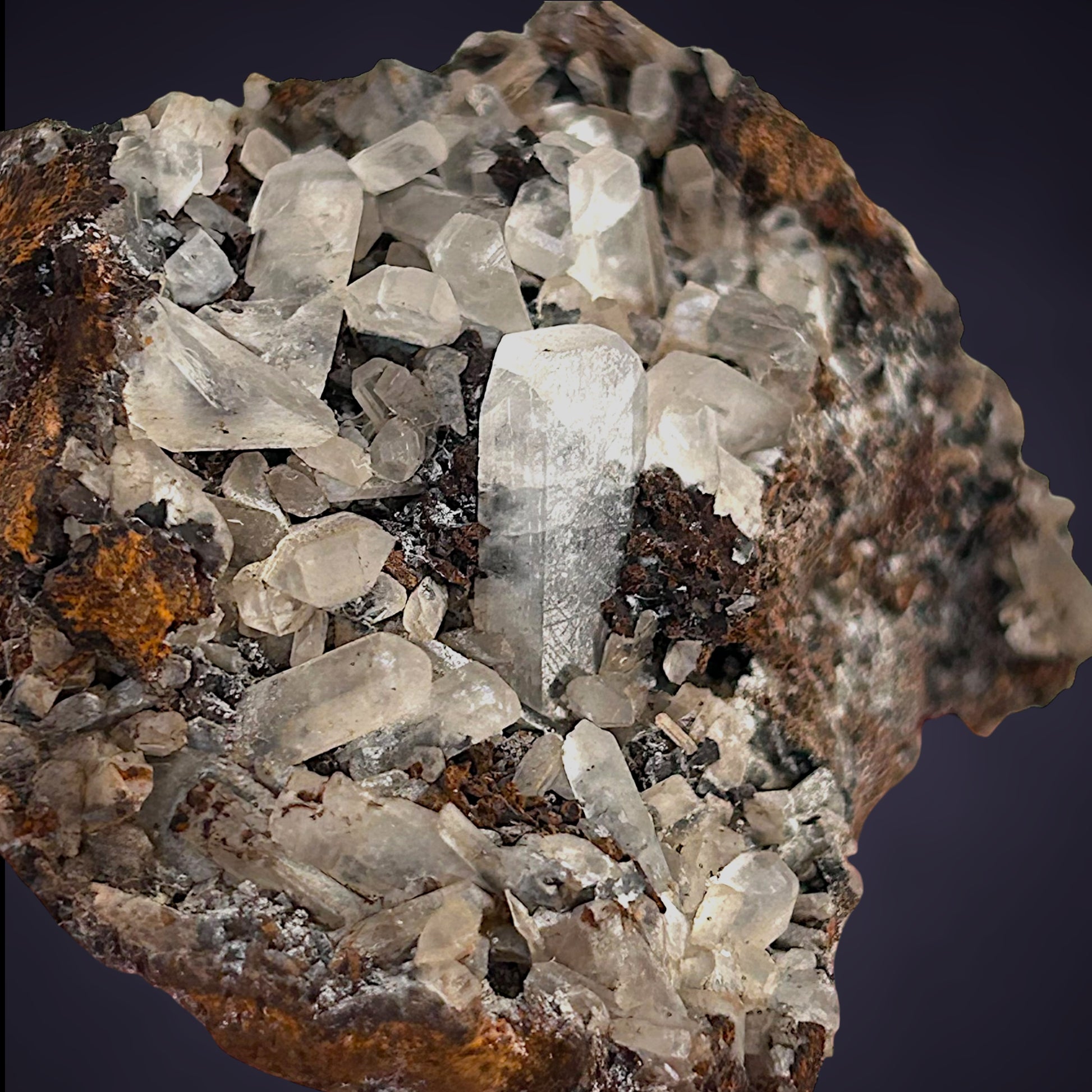 Das Schmuckstück wird von einem spektakulären zentralen Hauptkristall von außergewöhnlicher Größe dominiert, der die umgebenden Kristalle bei weitem übertrifft und perfekt ausgebildete und äußerst ästhetische Endflächen aufweist.