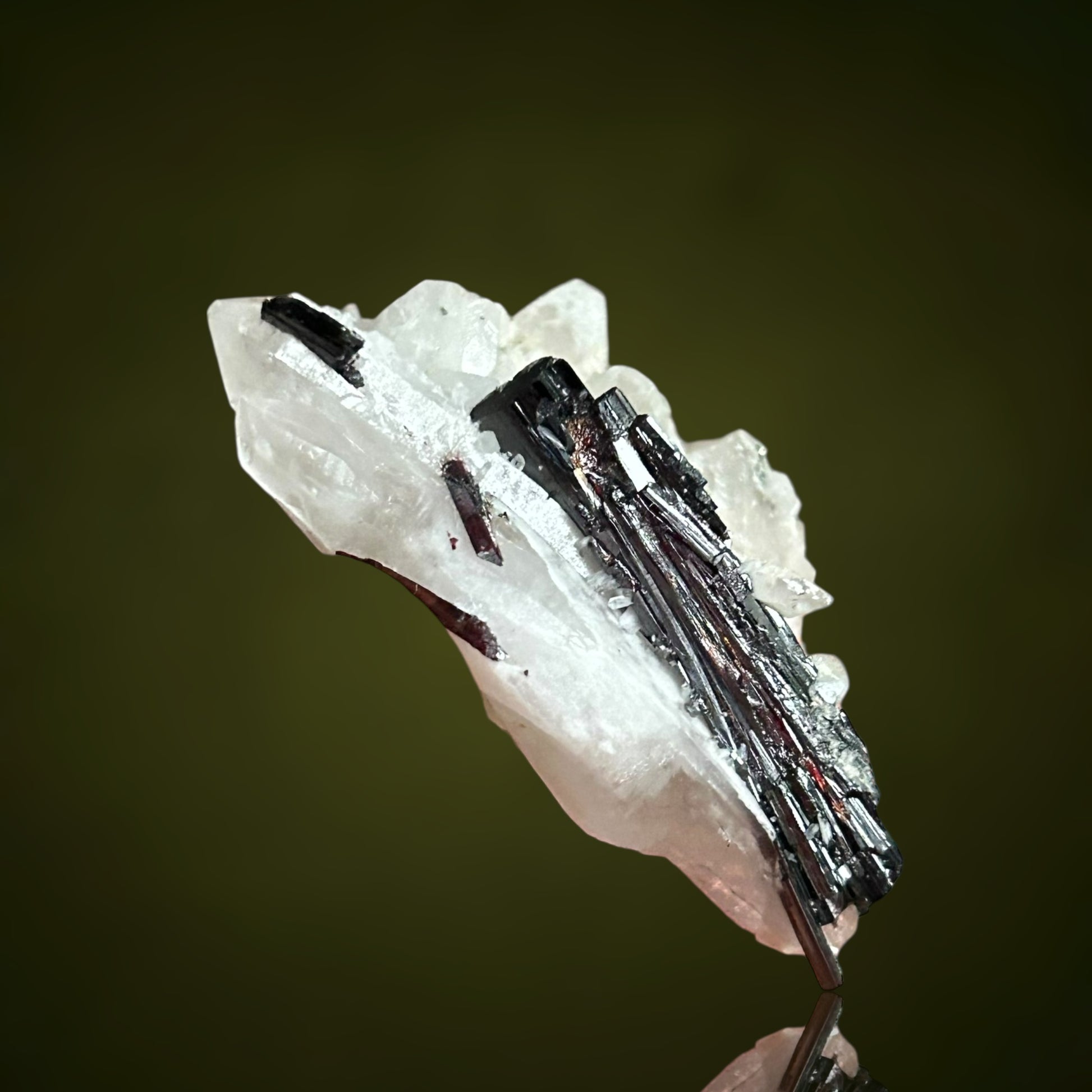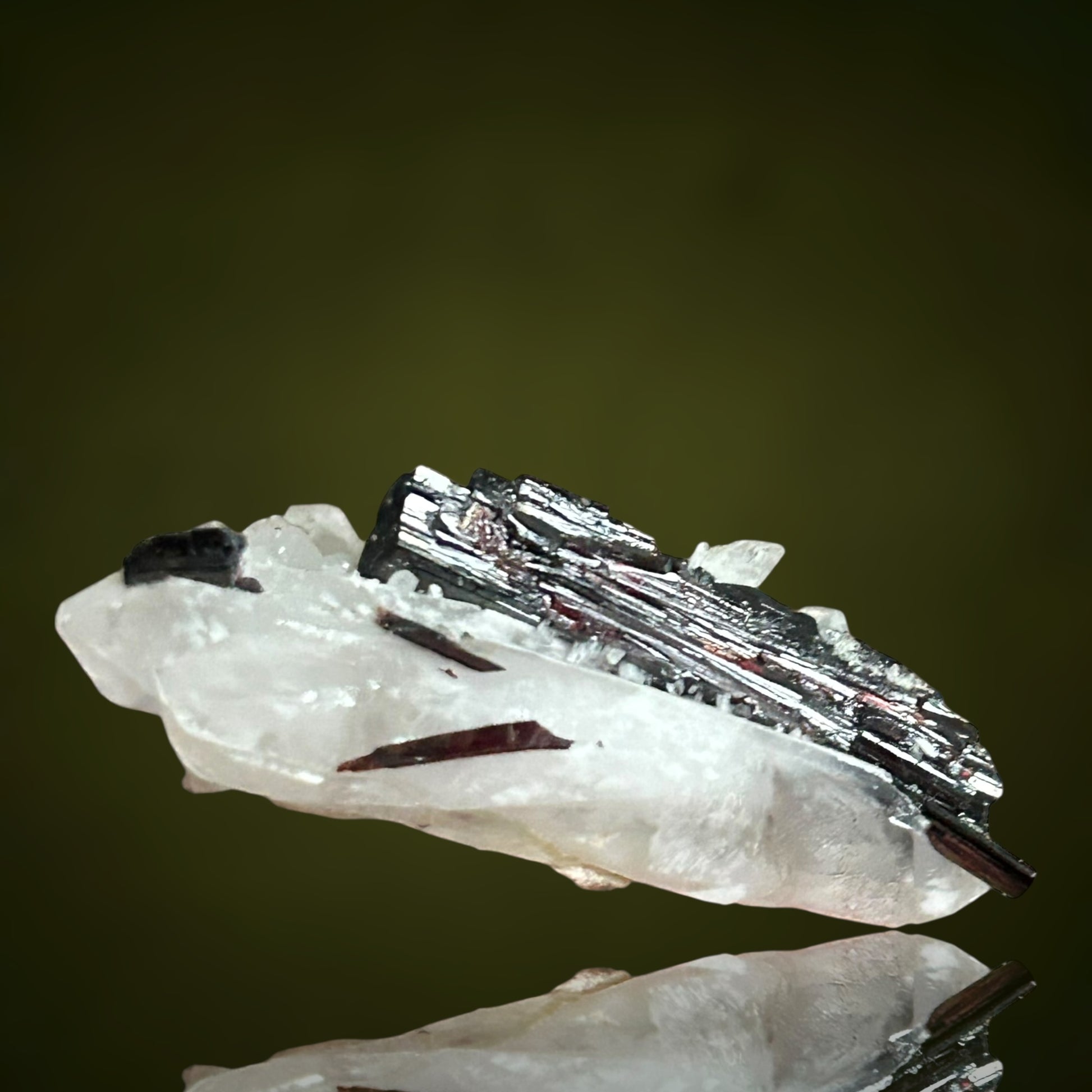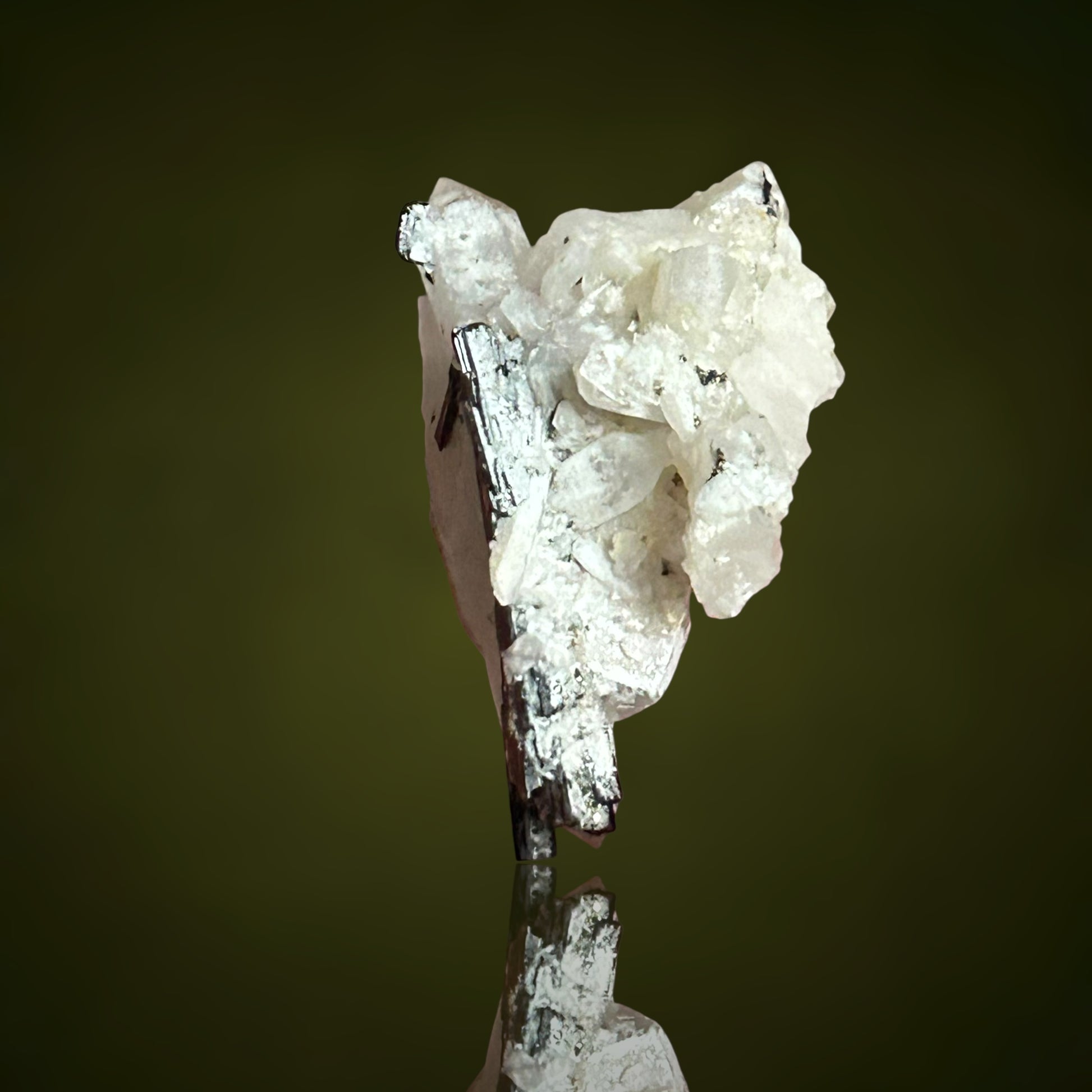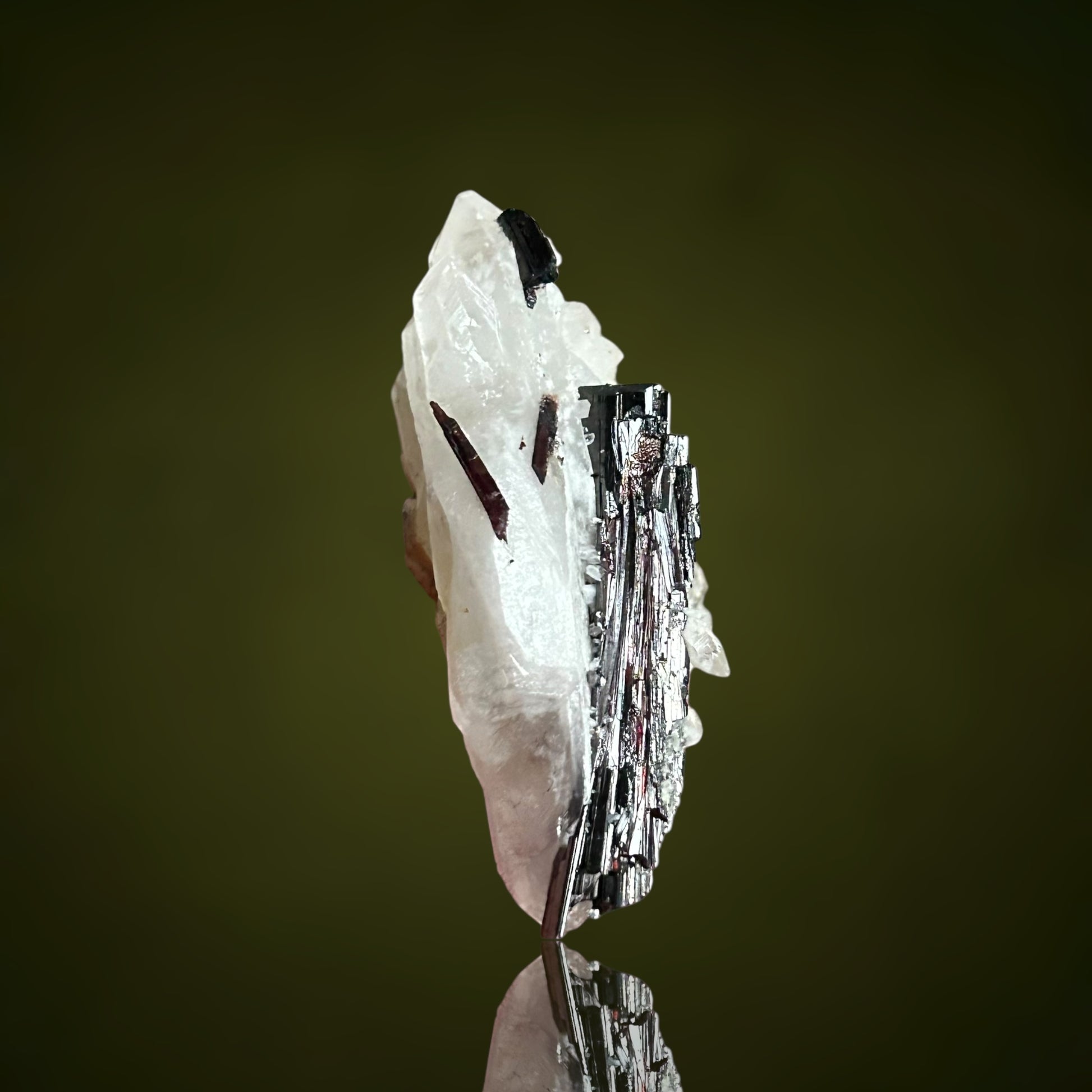 Der Hübnerit besticht durch außergewöhnlichen metallischen Glanz mit subtilen rötlichen Reflexionen und vollständig intakten Kristallendflächen – Eigenschaften, die in solch einer Reinheit selten anzutreffen sind. Zusammen mit dem ebenfalls doppelendig ausgebildeten Quarz zeugt dieses Exemplar von bemerkenswert stabilen Wachstumsbedingungen und ist ein äußerst begehrtes Stück für Sammler, die Wert auf erstklassige Kristallographie und Ästhetik legen.