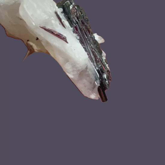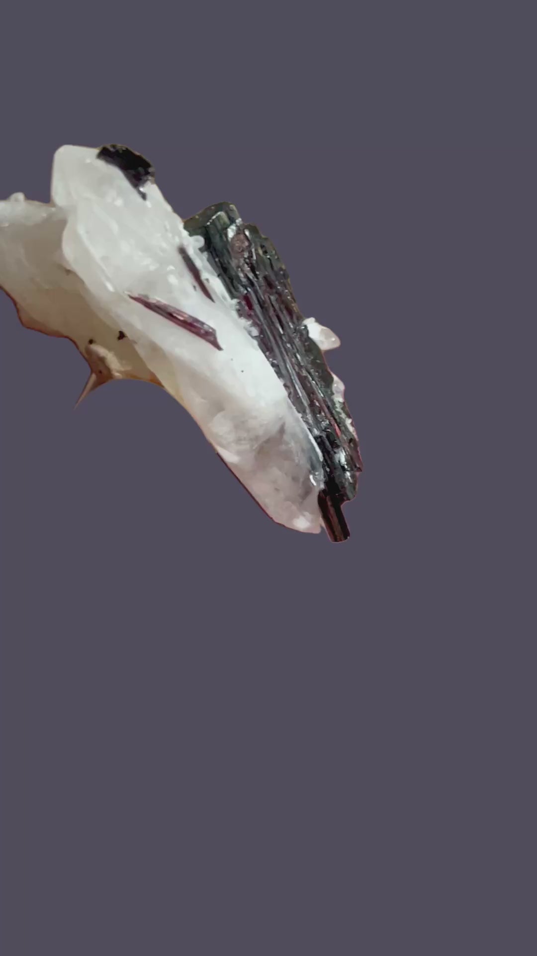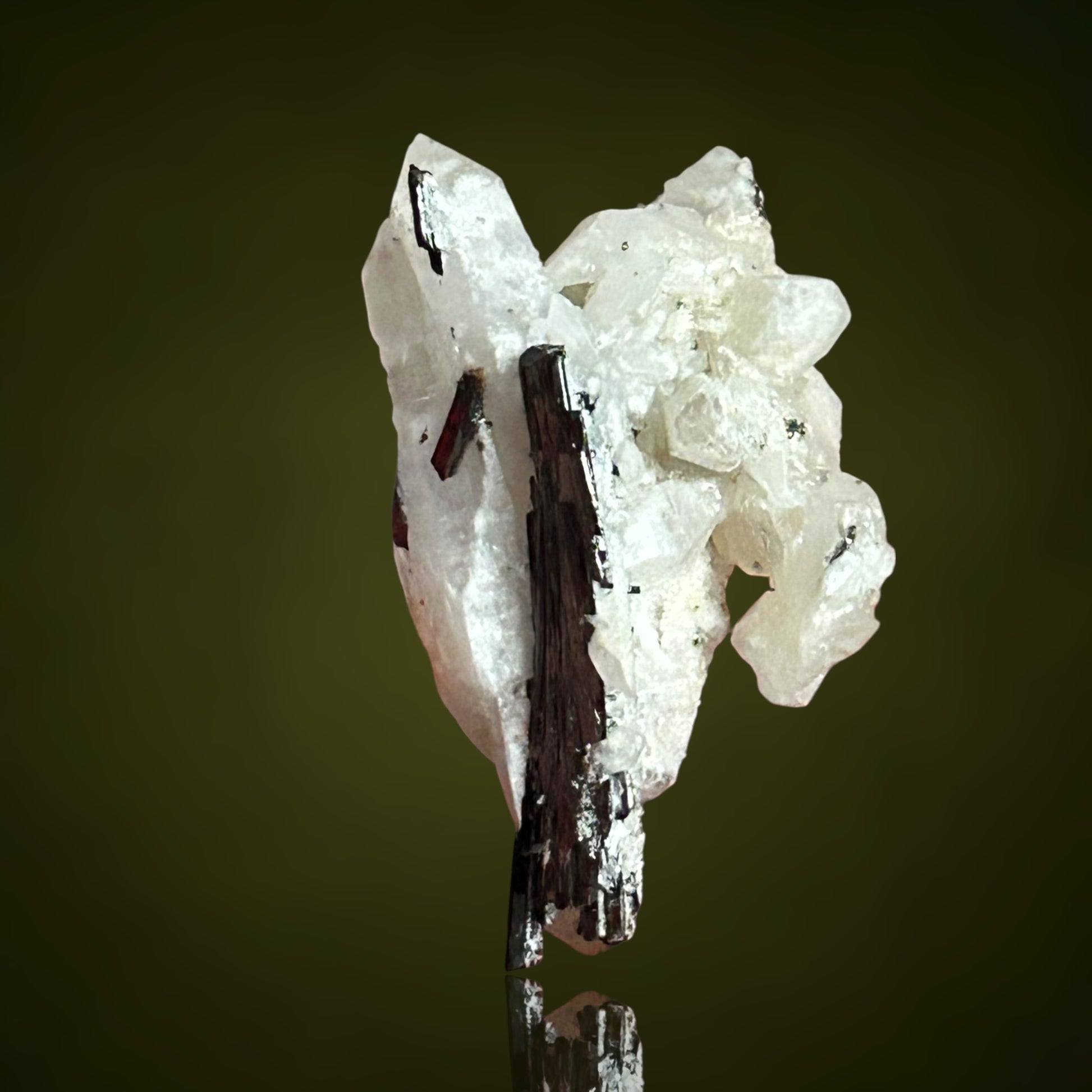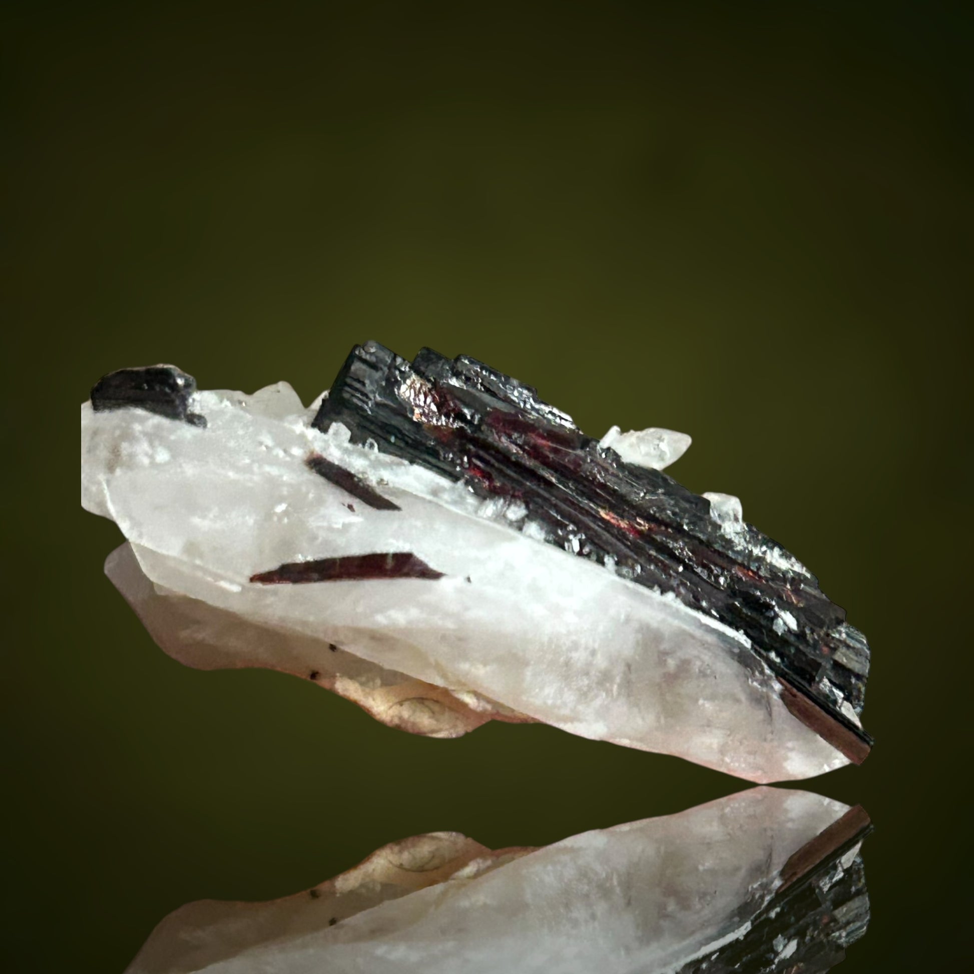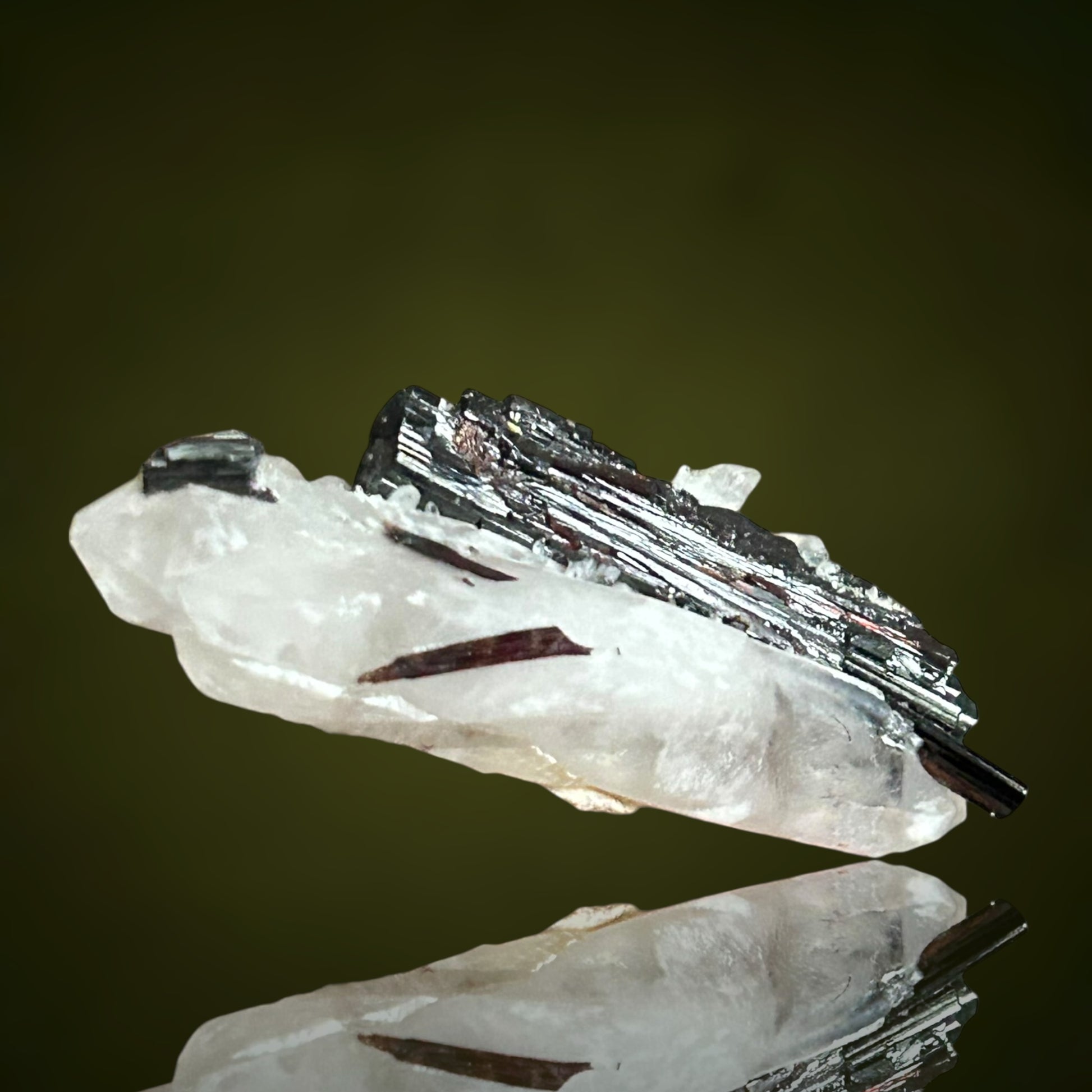 Der Hübnerit besticht durch außergewöhnlichen metallischen Glanz mit subtilen rötlichen Reflexionen und vollständig intakten Kristallendflächen – Eigenschaften, die in solch einer Reinheit selten anzutreffen sind. Zusammen mit dem ebenfalls doppelendig ausgebildeten Quarz zeugt dieses Exemplar von bemerkenswert stabilen Wachstumsbedingungen und ist ein äußerst begehrtes Stück für Sammler, die Wert auf erstklassige Kristallographie und Ästhetik legen.