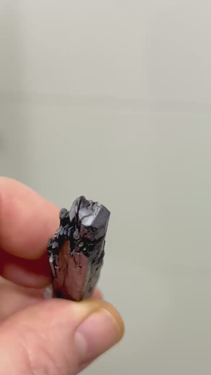 Ein beeindruckender, fingerlanger Hübneritkristall mit einer wunderschön ausgebildeten Endfläche und einem intensiven, feuerroten Glanz. Der Kristall weist scharfe, natürliche Kanten und eine klar definierte Morphologie auf, typisch für Material aus klassischen Fundorten, wo Hübnerit in eleganten prismatischen Kristallen vorkommt.