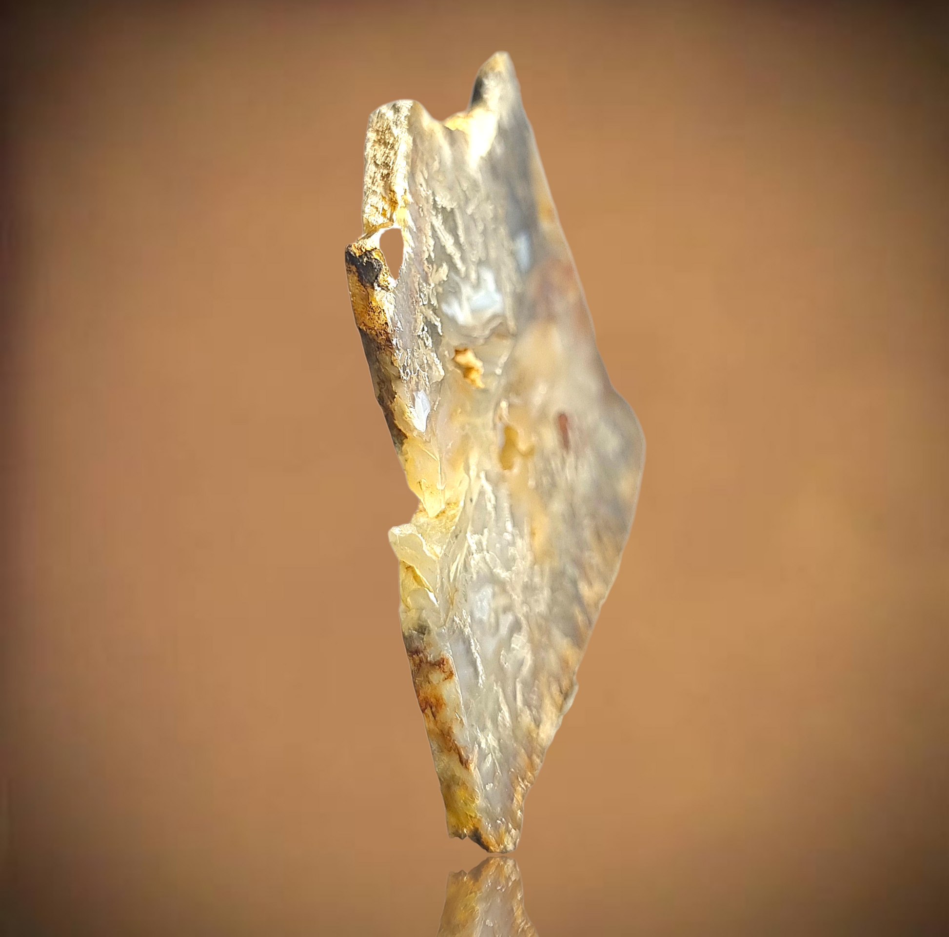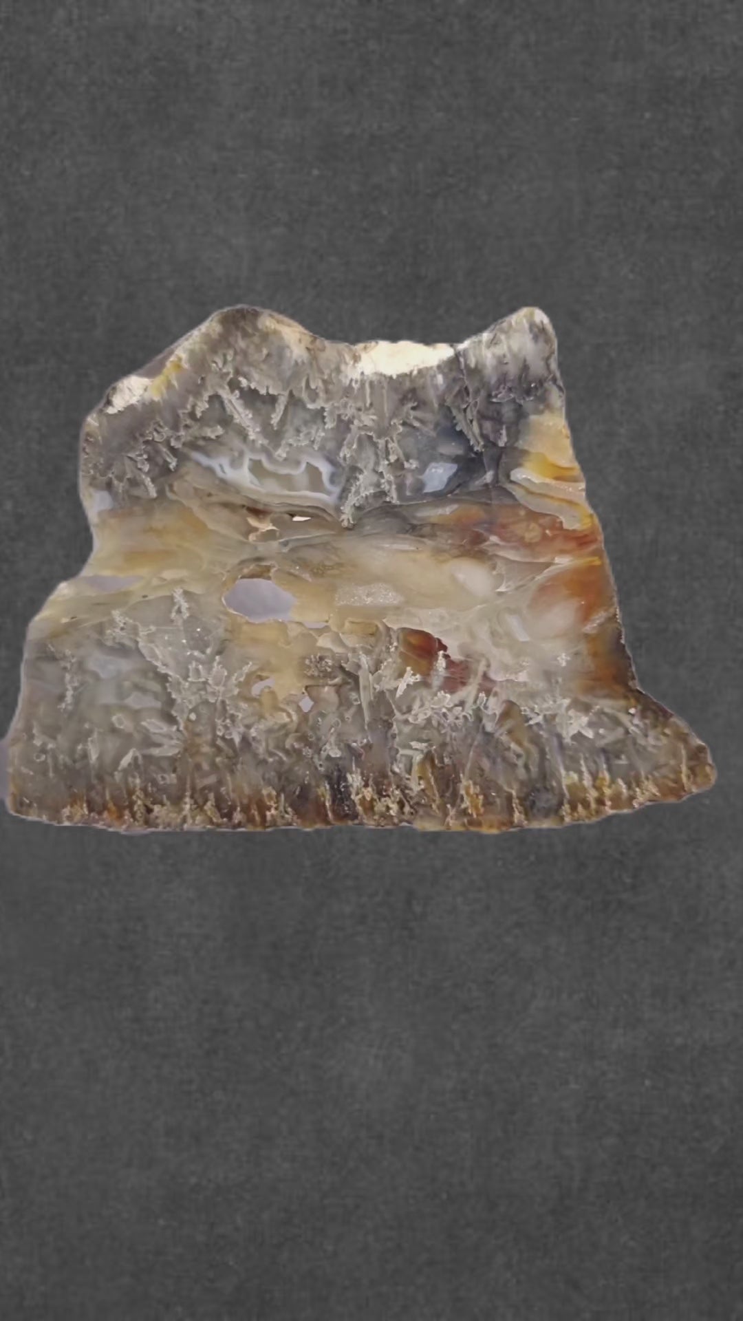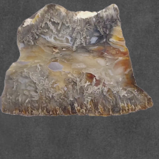 Eine spannende Rarität aus dem Nordwesten der USA aus den 1950er Jahren: Geoden, die mit schlanken Realgarkristallen ausgekleidet und mit Achat gefüllt sind. Die ziegelroten, lattigen Kristalle haben sich teilweise zu hellgelbem Auripigment und grauschwarzem, gediegenem Arsen umgewandelt, wodurch Epimorphosen und netzartige Wolken entstanden sind, darüberhinaus finden sich winzige Arsenkristalle. Der Achat weist wunderschöne Bänderungen auf. Leider wird diese Formation aufgrund des Aussehens grauer, prismatischer Kristalle oft als Stibnit in Achat angeboten, was ihre Einzigartigkeit wirklich schmälert. Einseitig poliert.