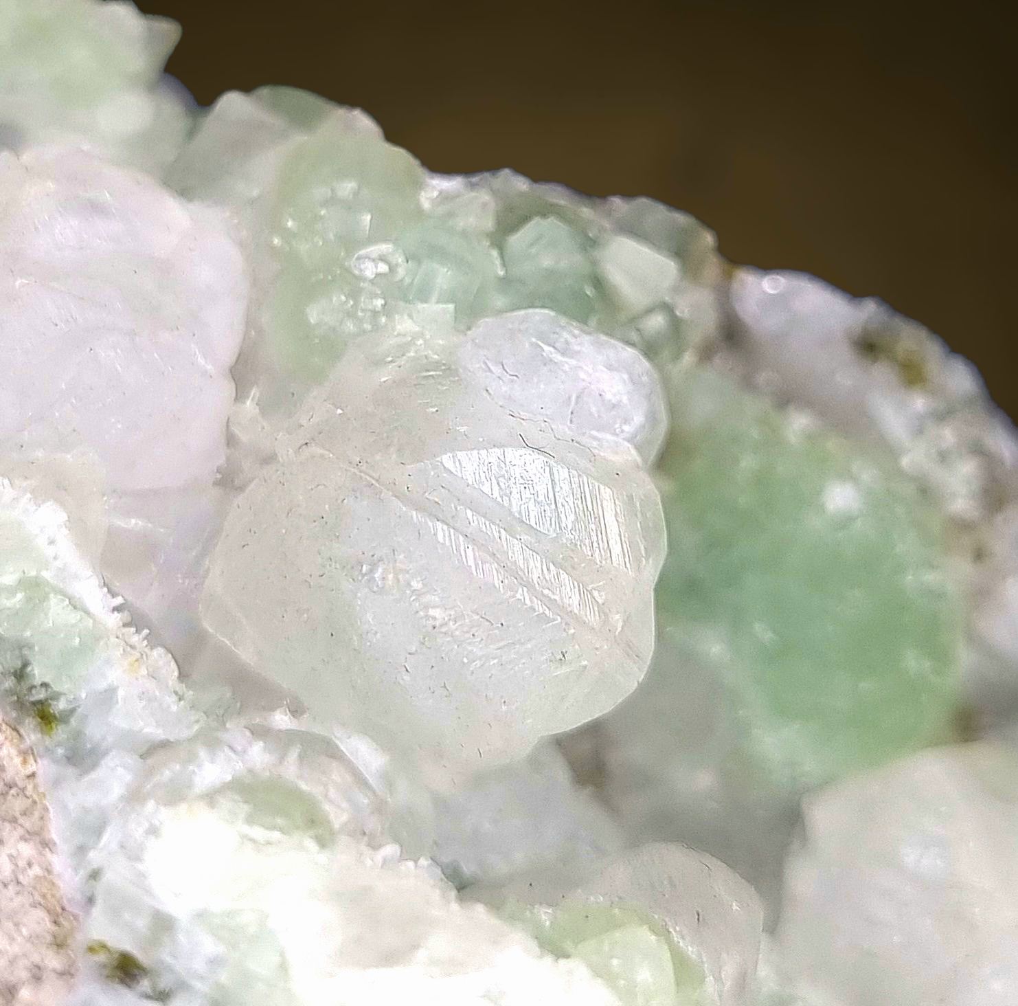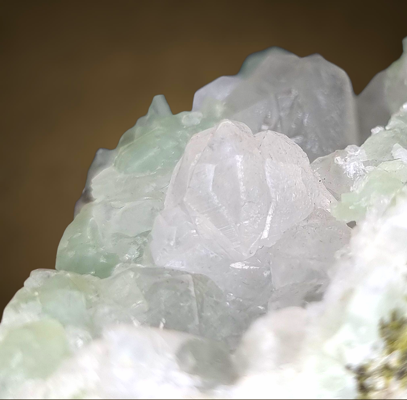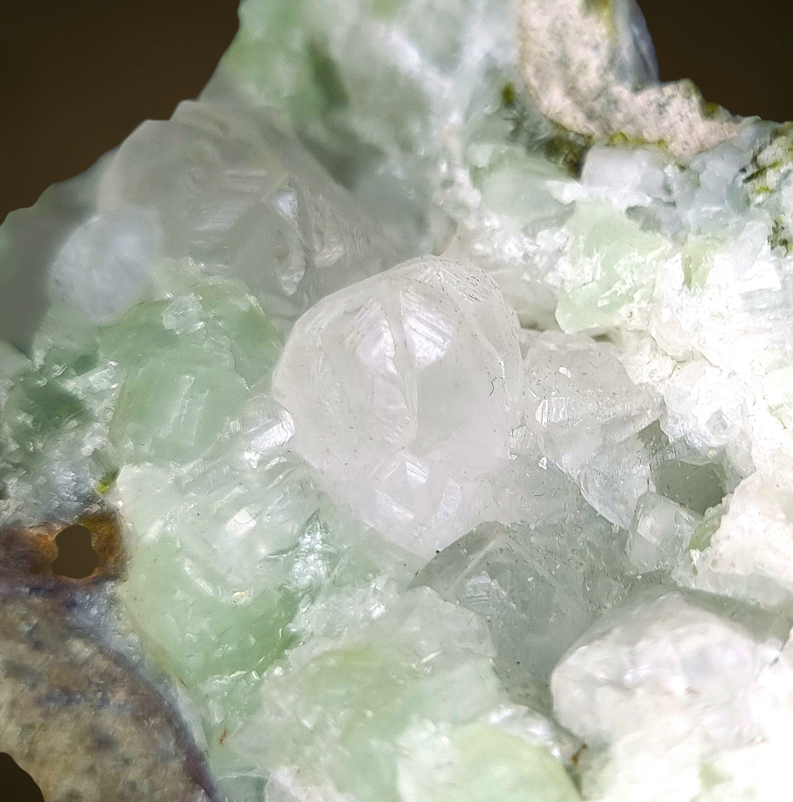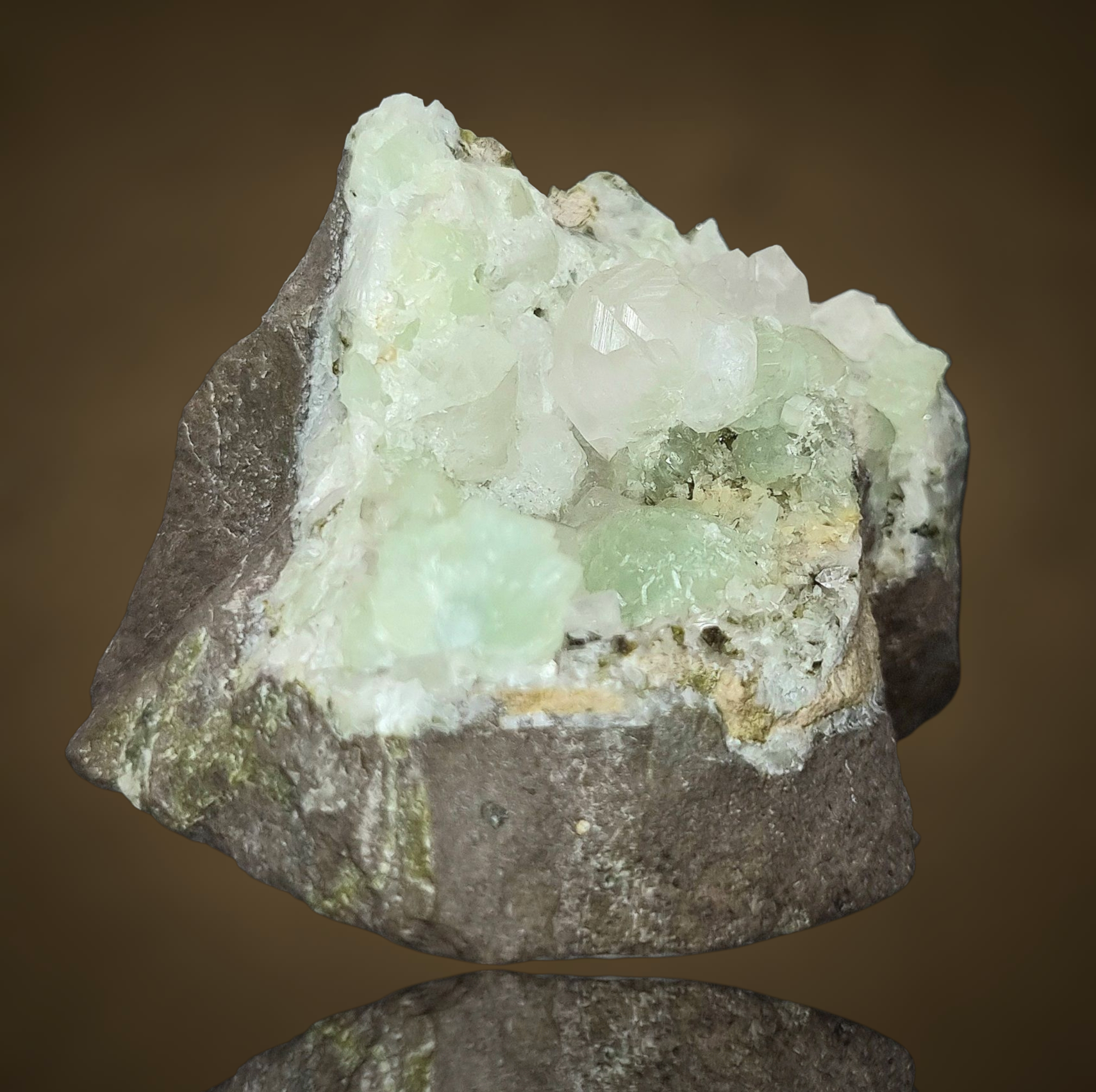 Ein sehr attraktives Stück mit wunderschön ausgebildetem Calcit und Prehnit in prächtiger Form sowie etwas Pumpellyit auf Matrix.