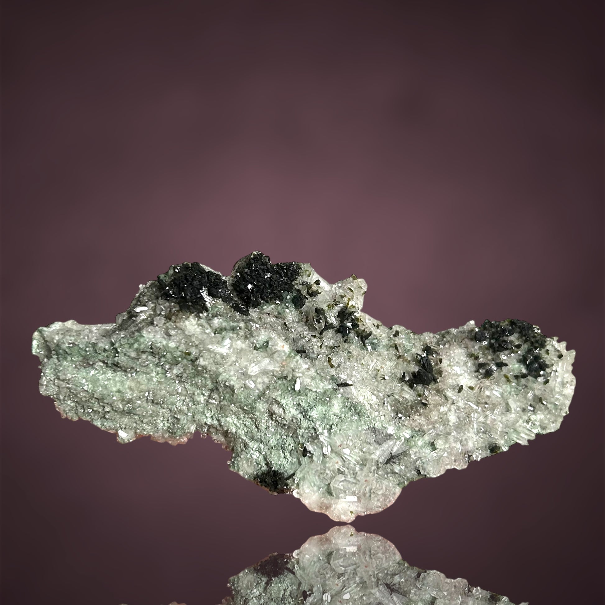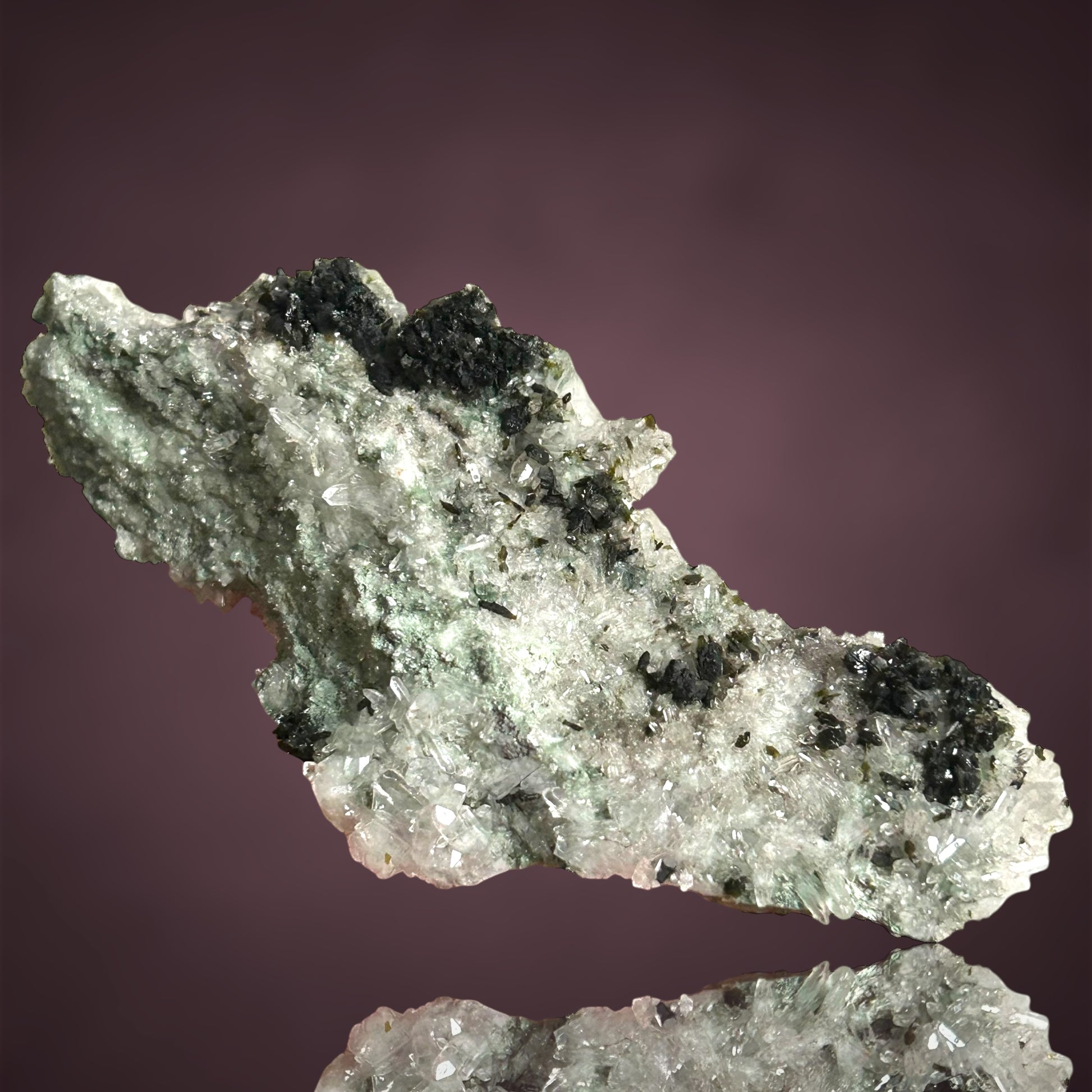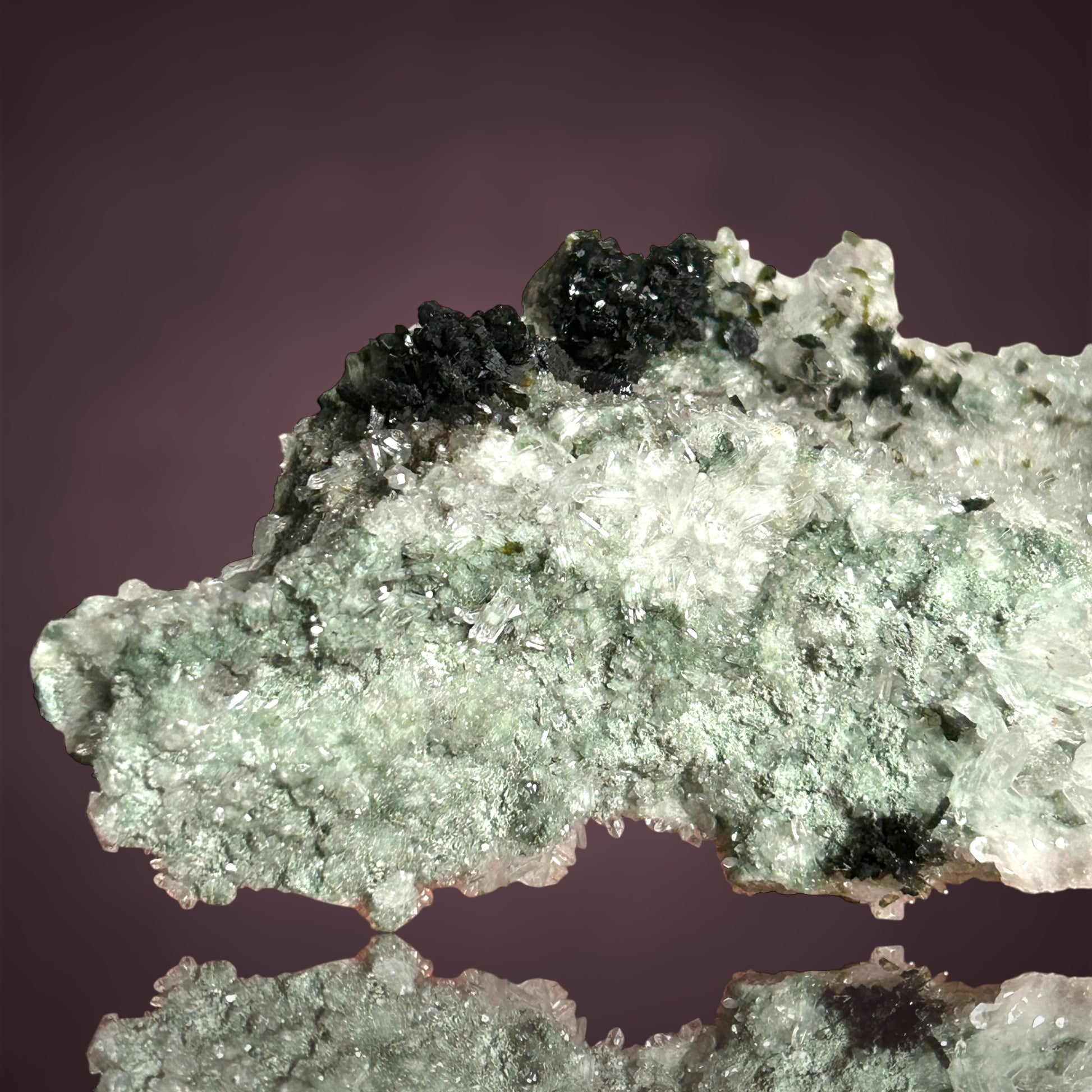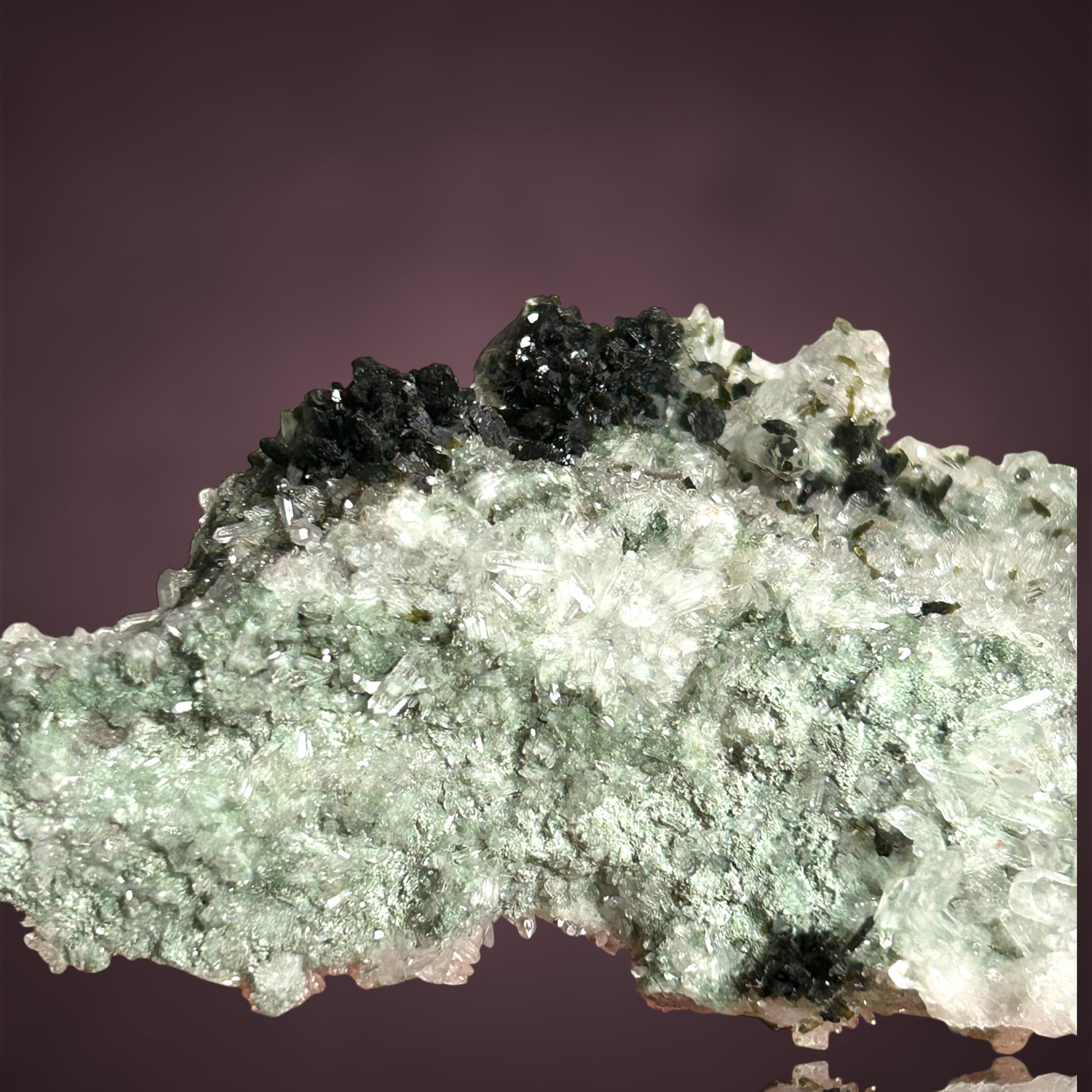 Üppige Pumpellyit-Aggregate thronen auf einem funkelnden Quarzteppich und bilden ein außergewöhnlich wohlgeformtes und ästhetisch ansprechendes Vitrinenstück aus der Tafelkop-Region, Goboboseb in Namibia.