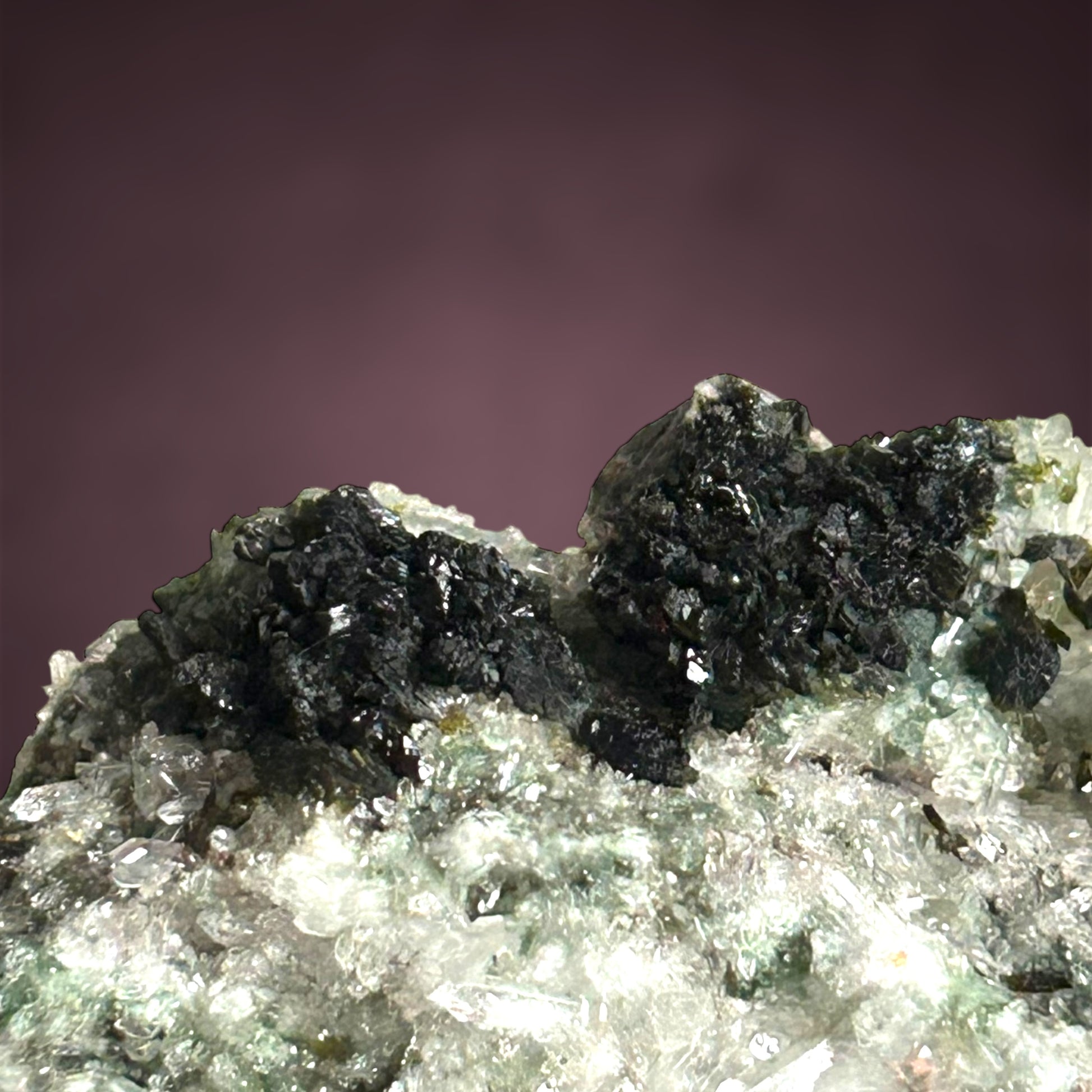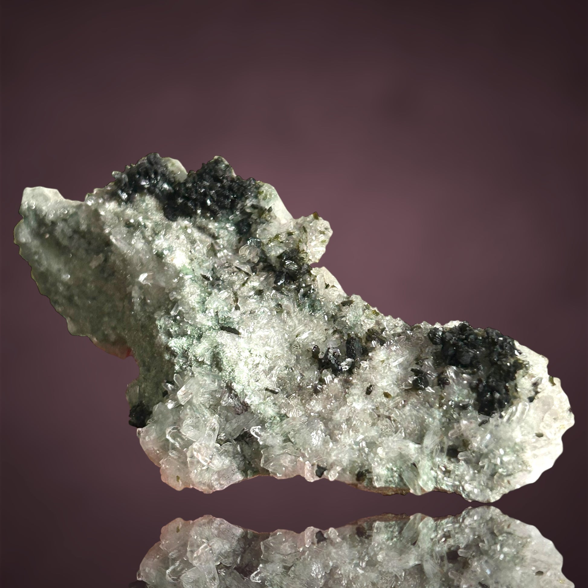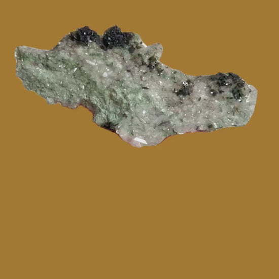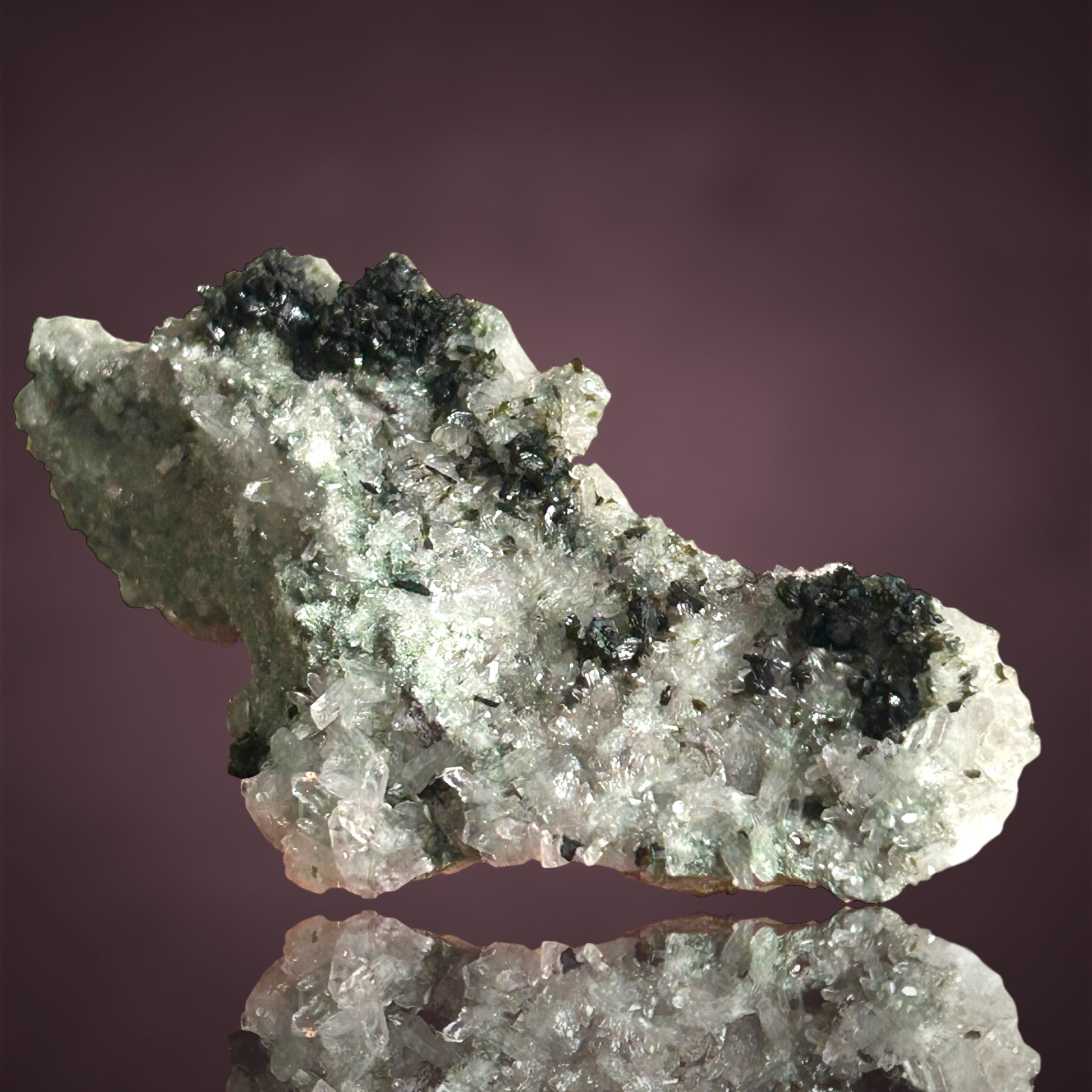 Üppige Pumpellyit-Aggregate thronen auf einem funkelnden Quarzteppich und bilden ein außergewöhnlich wohlgeformtes und ästhetisch ansprechendes Vitrinenstück aus der Tafelkop-Region, Goboboseb in Namibia.