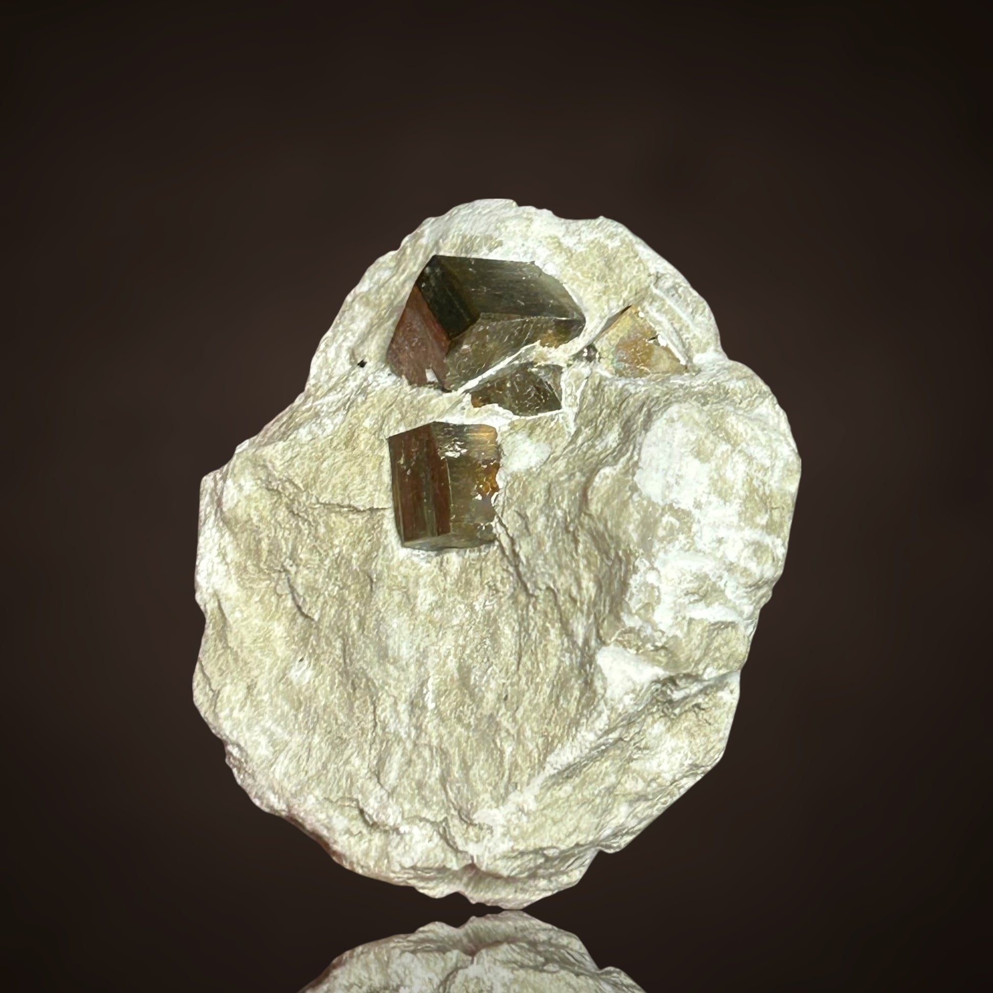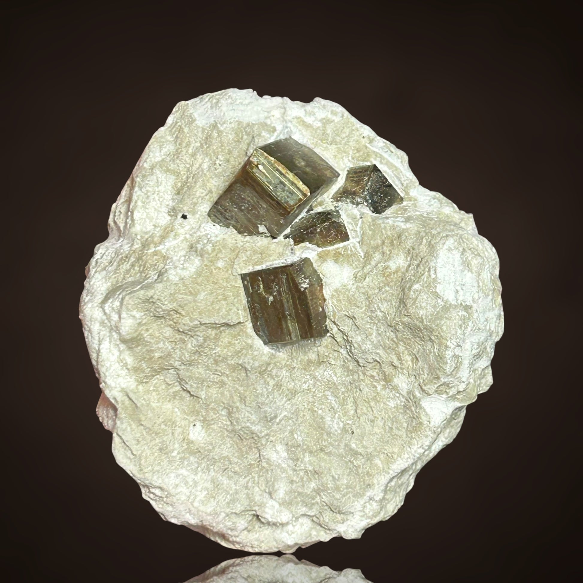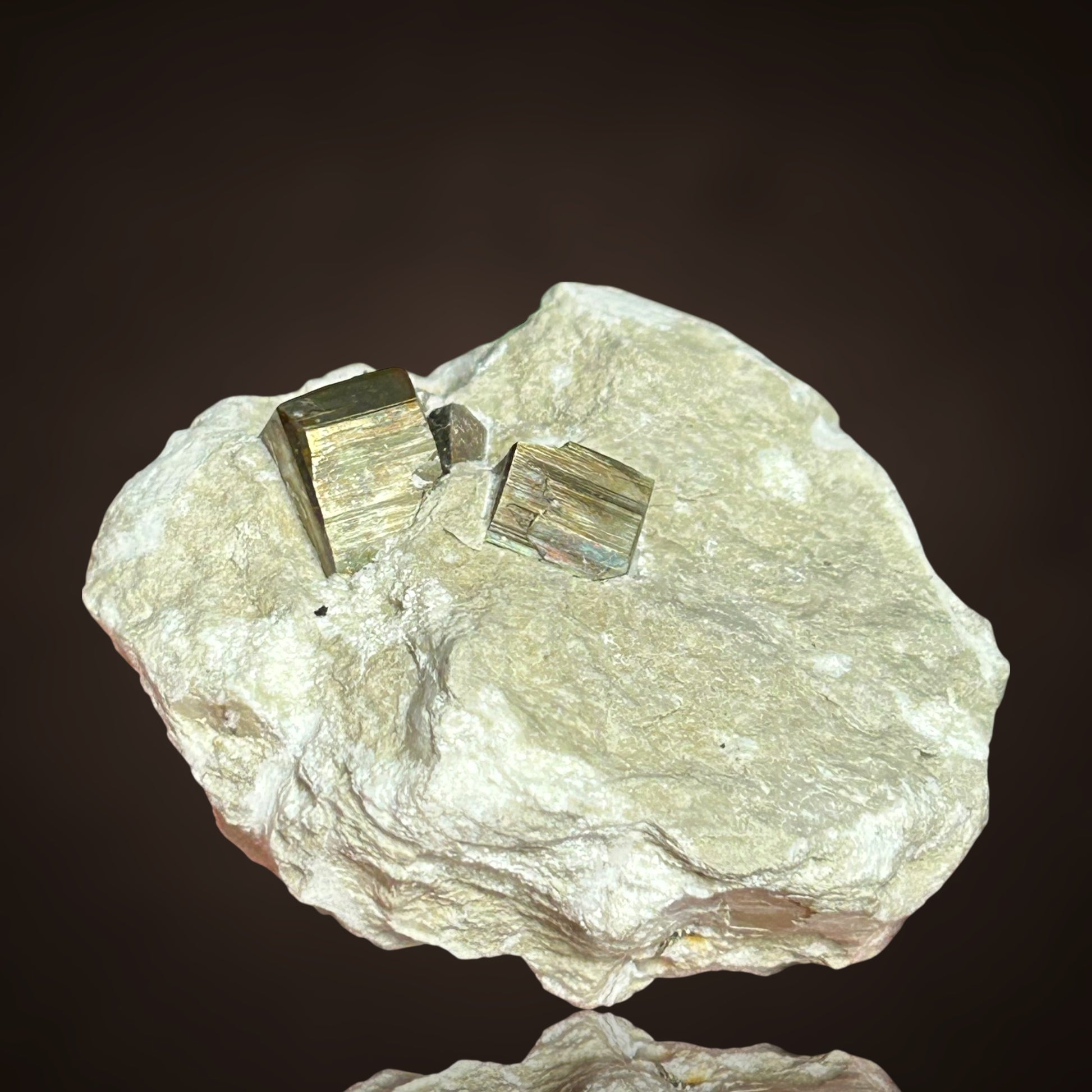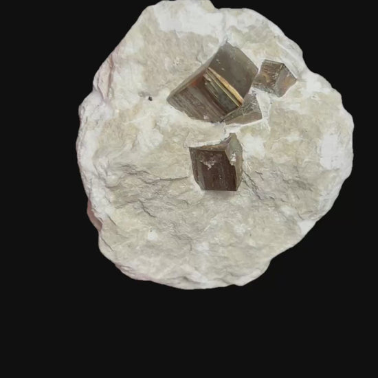🇩🇪 Mehrere irregulär gewachsene/distorted Pyritwürfel auf Muttergestein.