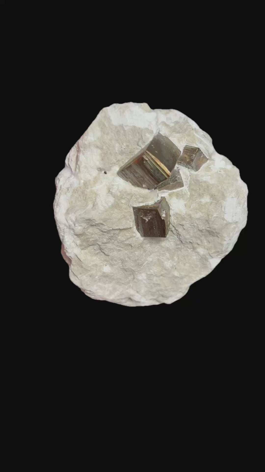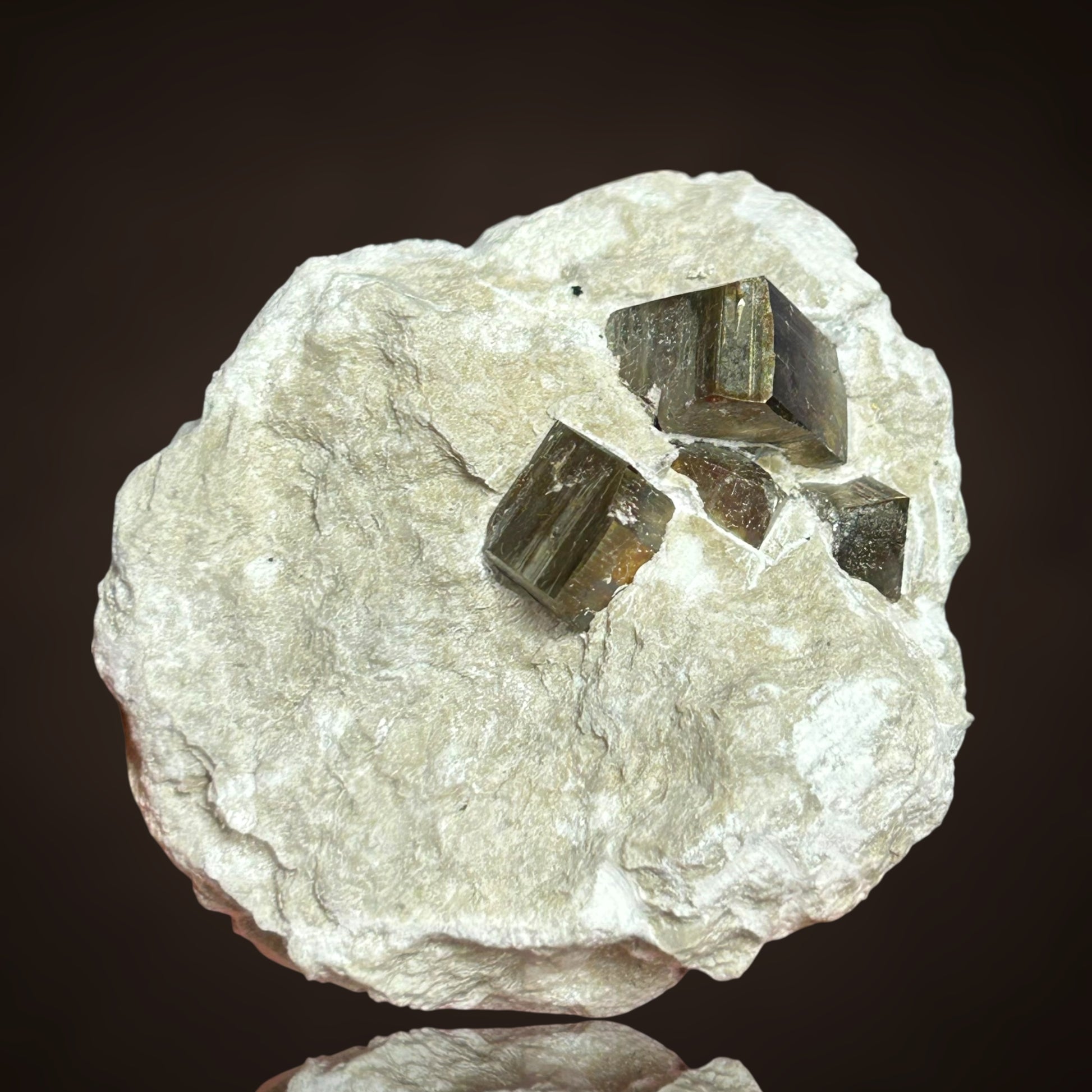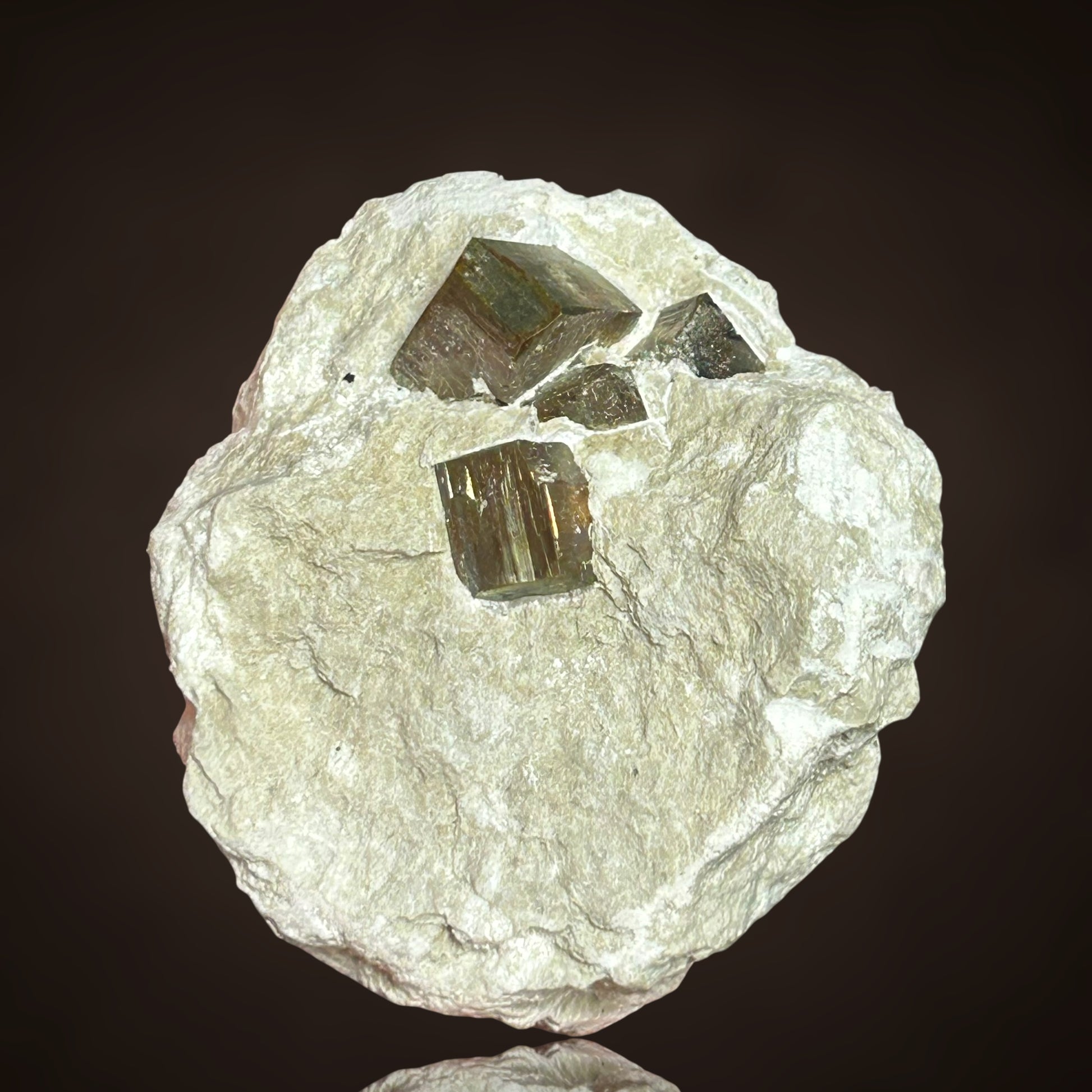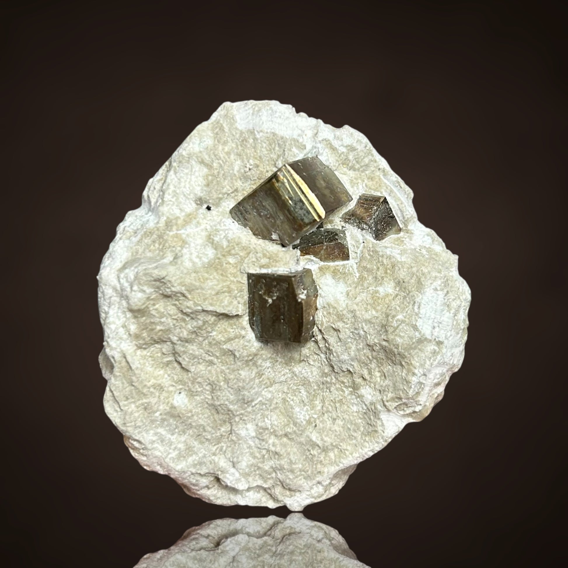 🇩🇪 Mehrere irregulär gewachsene/distorted Pyritwürfel auf Muttergestein.