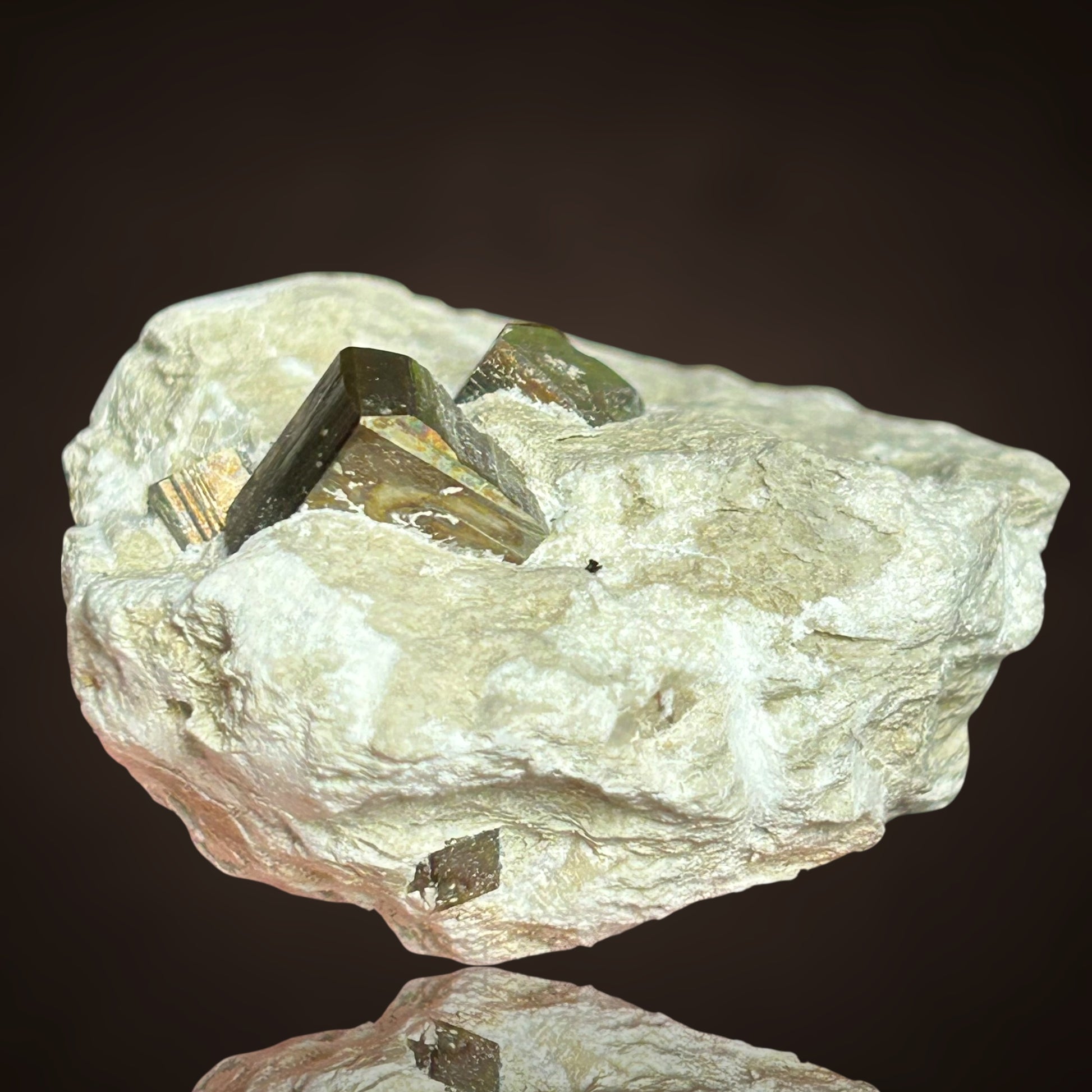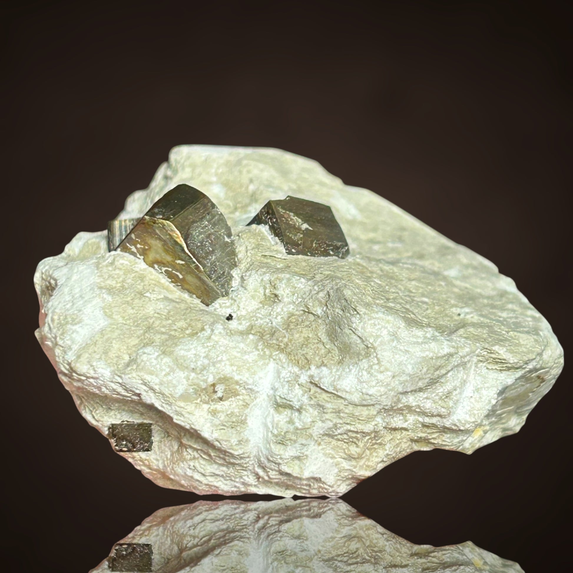 🇬🇧 Several irregularly grown/distorted pyrite cubes on host rock.