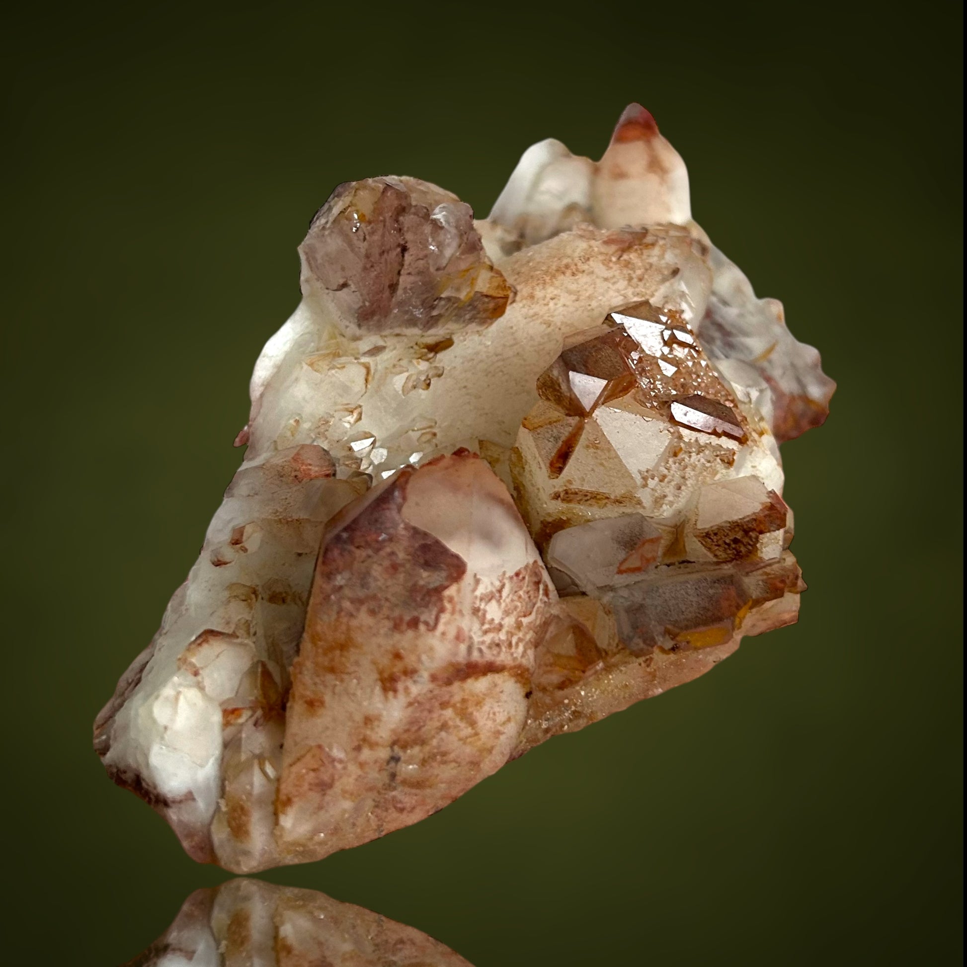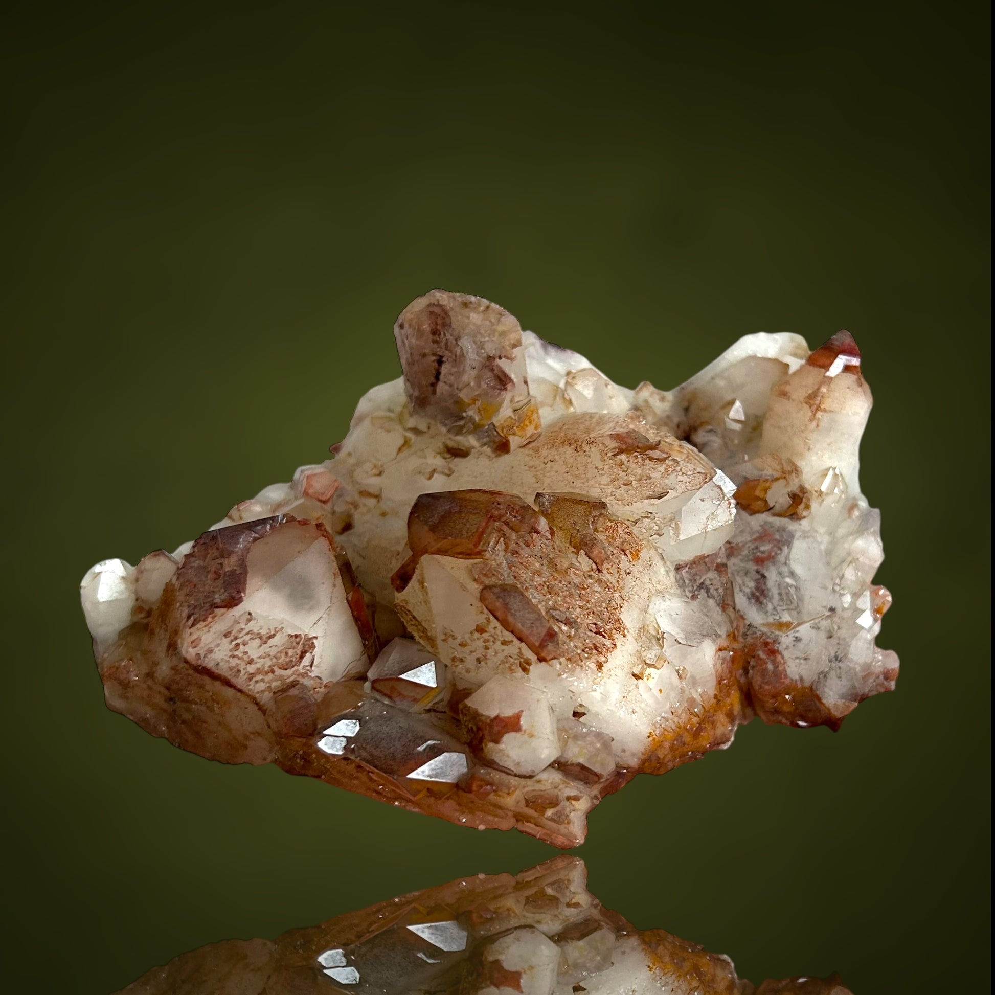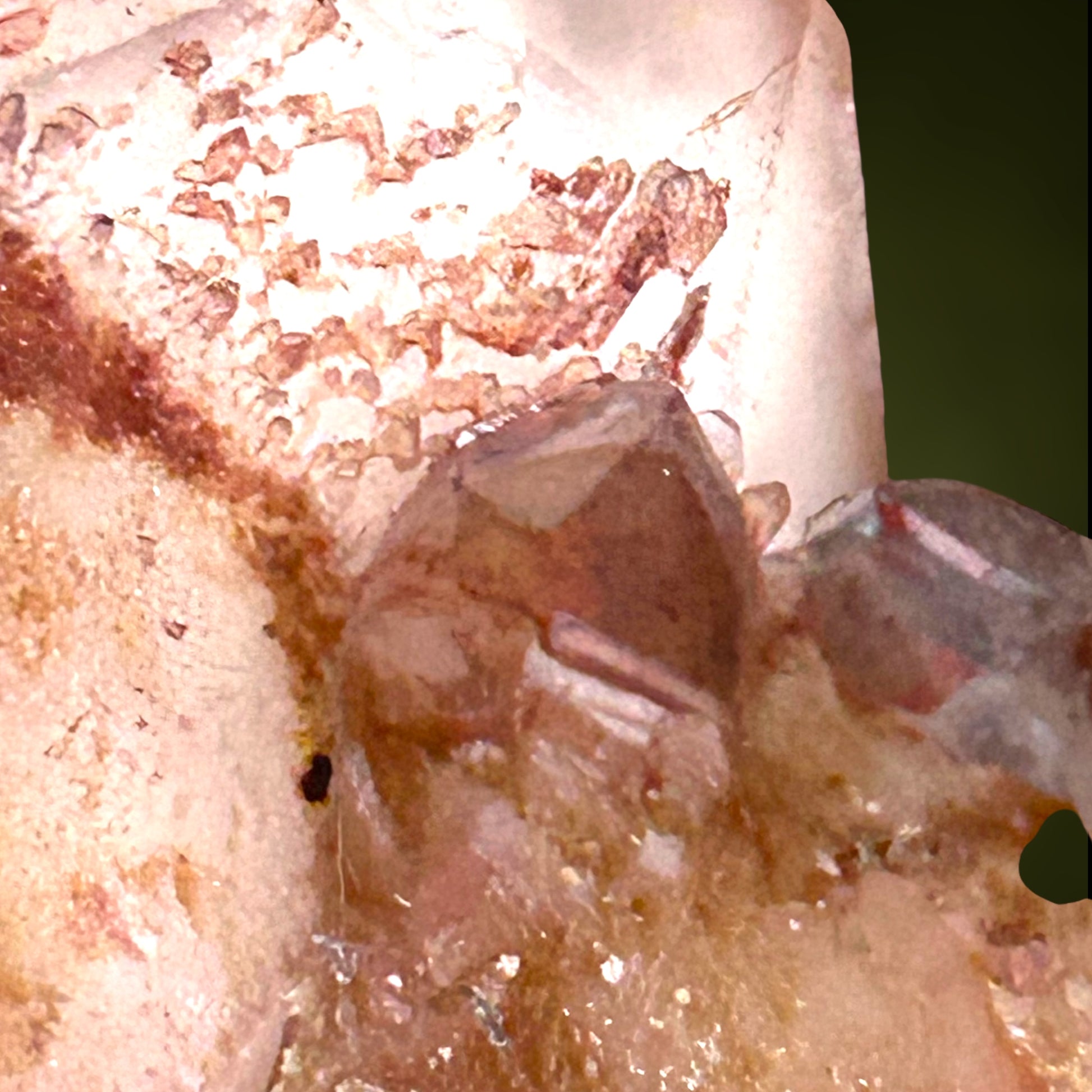 Mehrere Kristalle weisen markante Hämatit-Phantome auf, die verschiedene Wachstumsphasen dokumentieren und dem Stück eine beeindruckende visuelle Tiefe sowie wissenschaftlichen Wert verleihen. Besonders hervorzuheben sind die seltenen inversen Zepterformationen, die dieses Stück zu einem absoluten Blickfang und einem wahren Sammlerstück machen. Die Gesamtästhetik, die Kristallklarheit und die Provenienz positionieren dieses Stück eindeutig unter den hochwertigen Sammlerstücken mit bleibendem Wert.