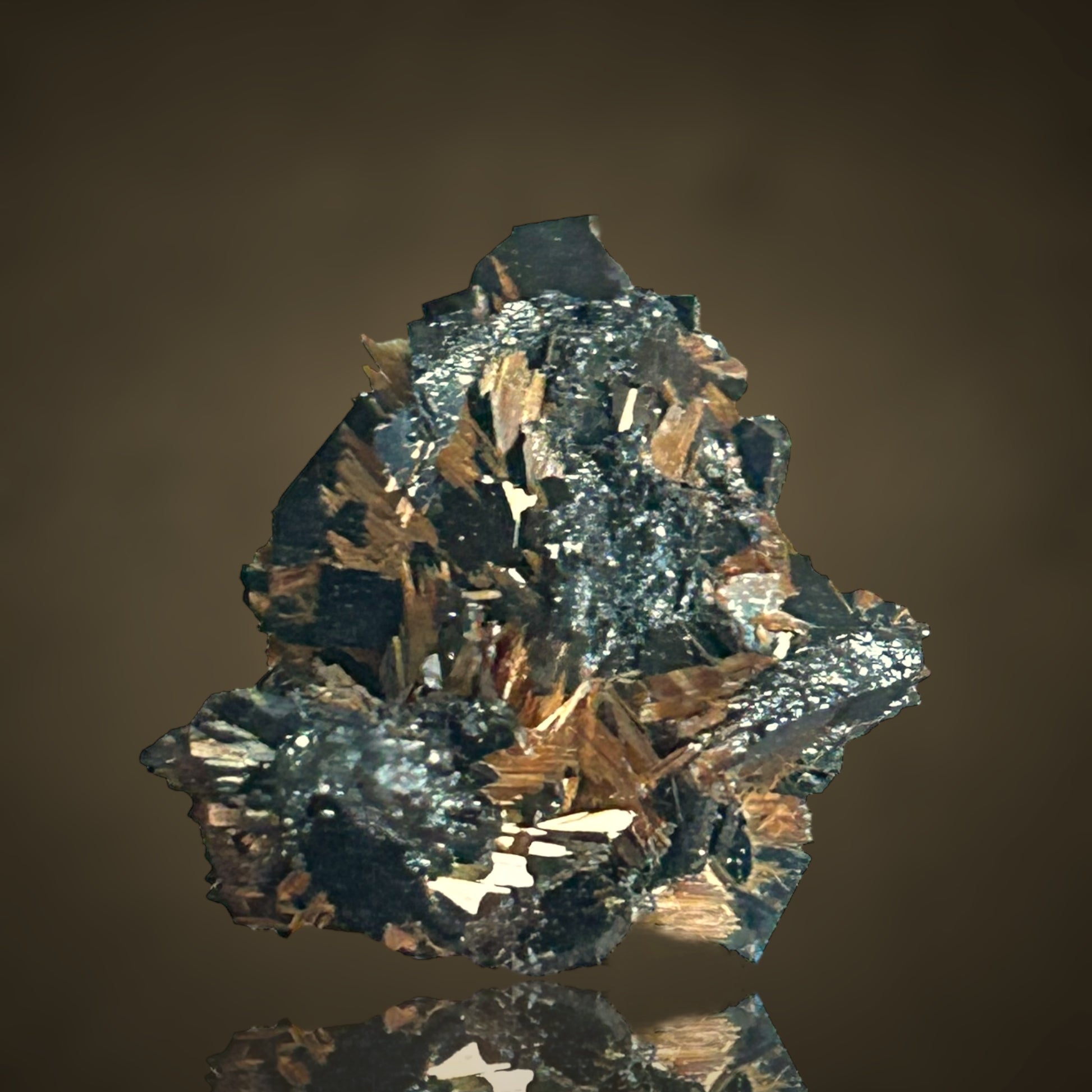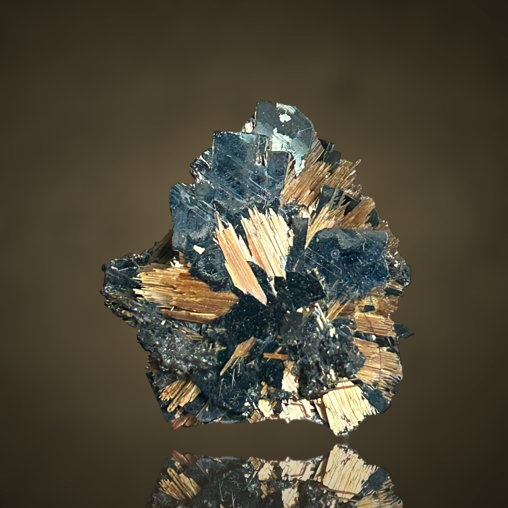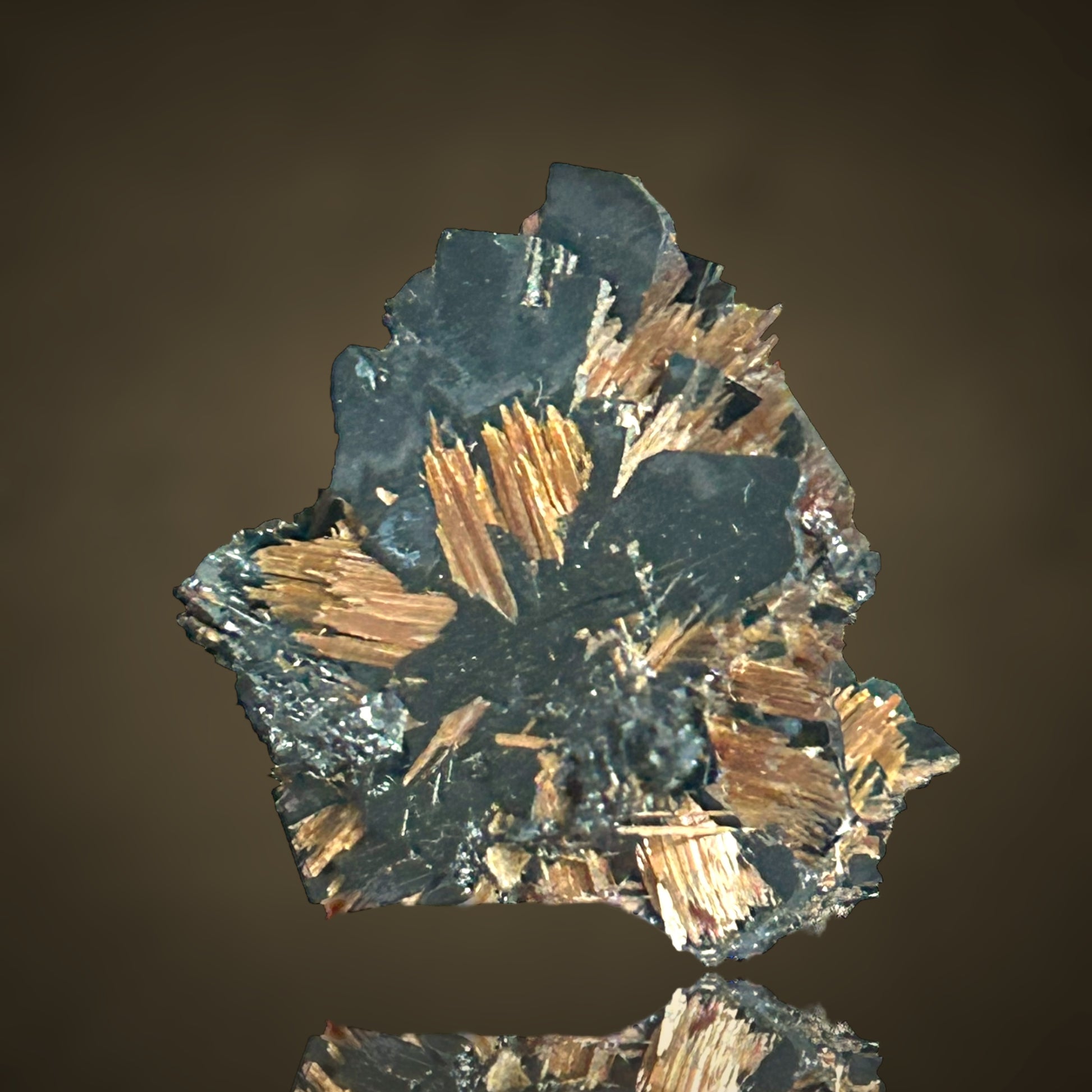 Zauberhaft verwachsene Hämatitkristalle, hochglänzend, in denen unzählige epitaktisch verwachsene, goldglänzende Rutilkristalle spielerisch die begehrten Rutilsterne bilden. Tolles Stück!