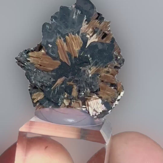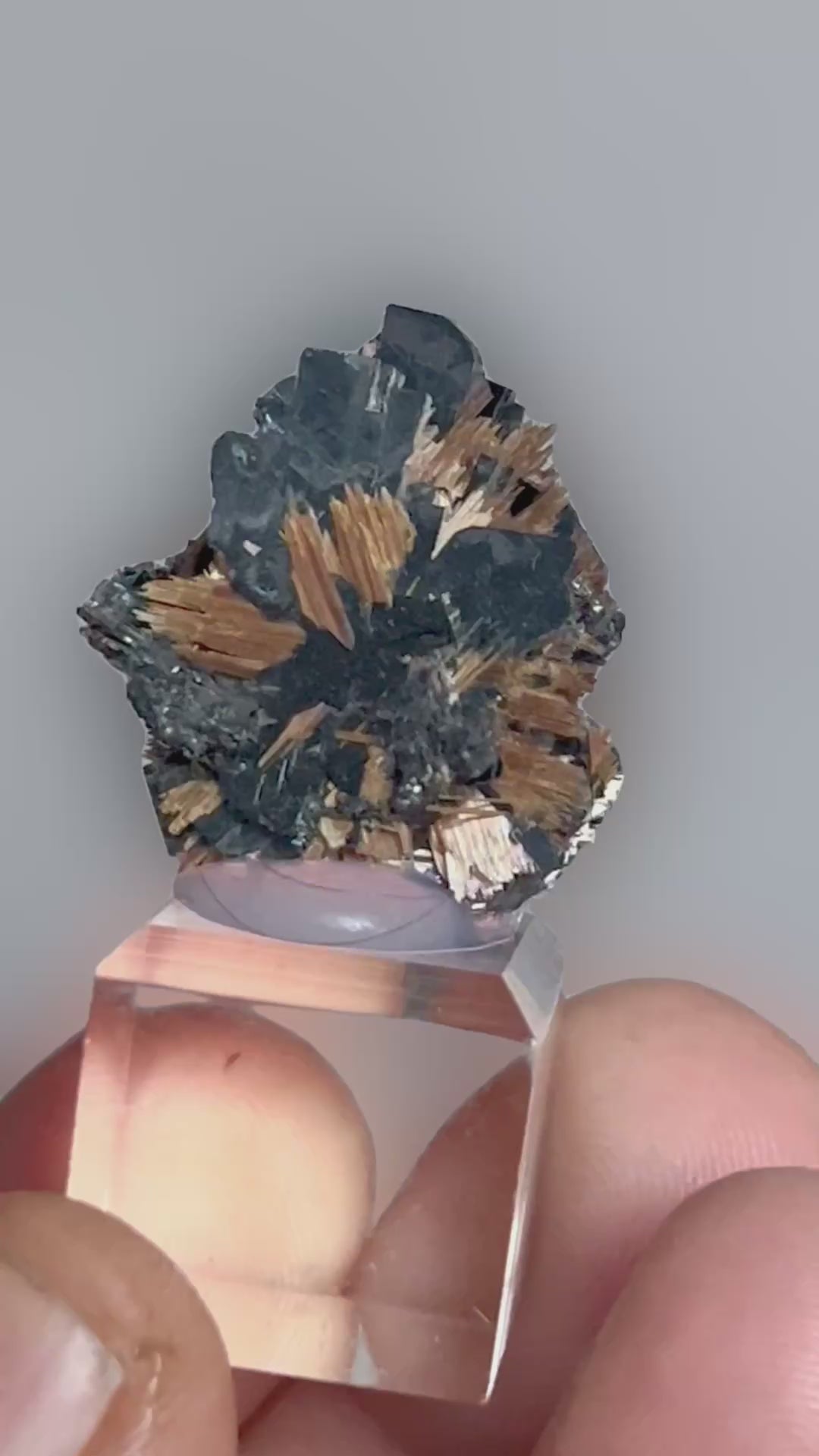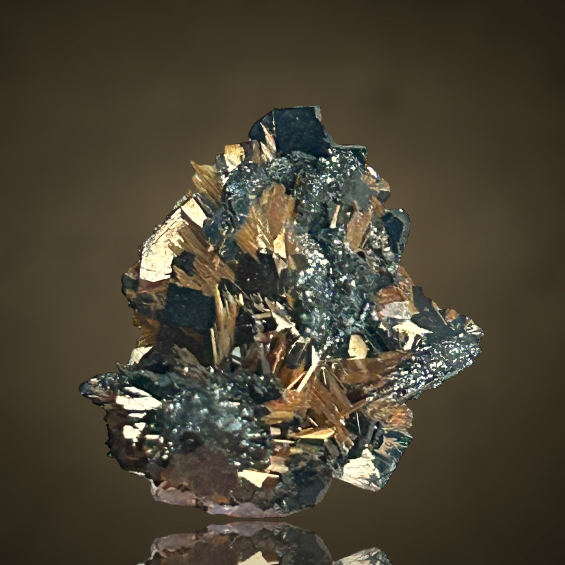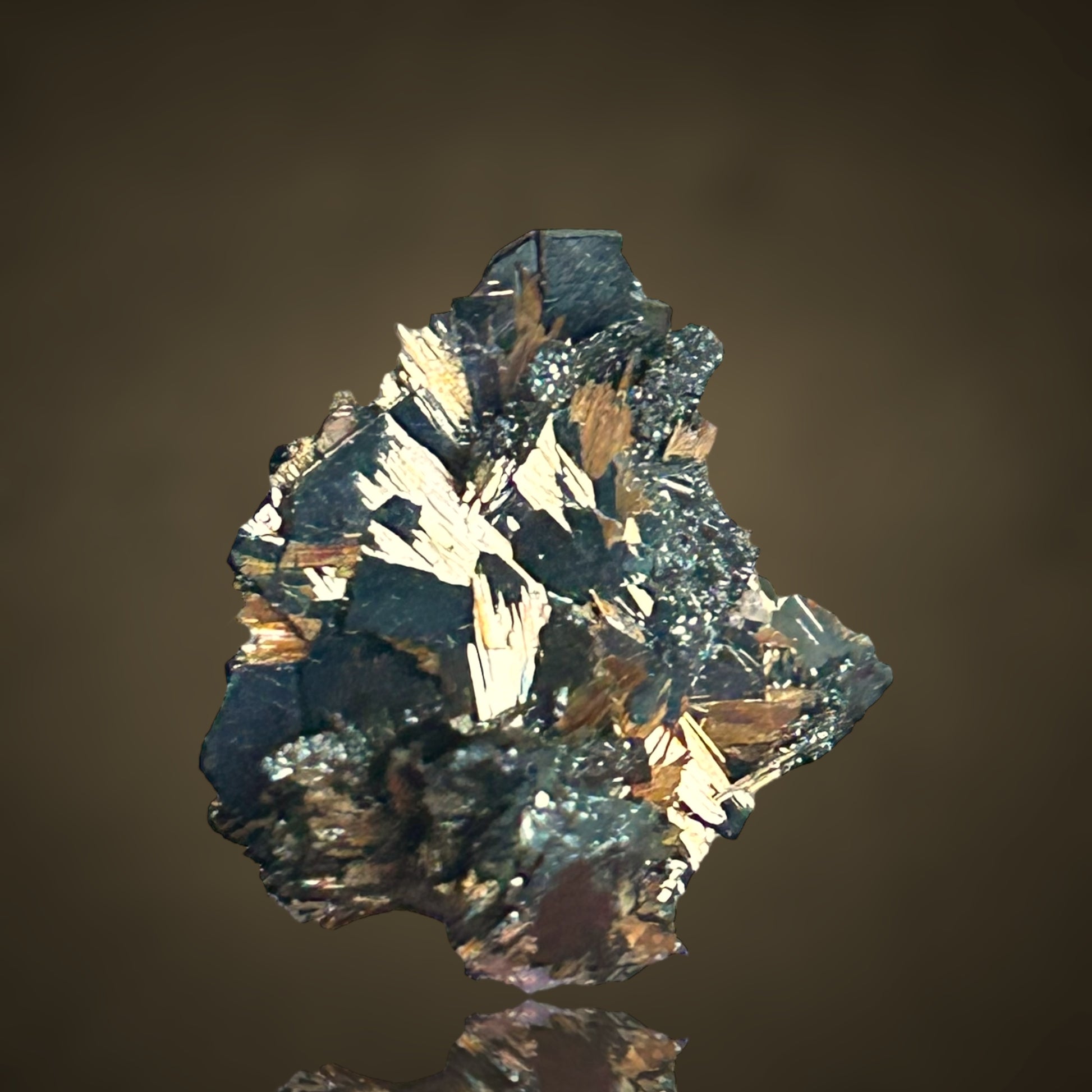Zauberhaft verwachsene Hämatitkristalle, hochglänzend, in denen unzählige epitaktisch verwachsene, goldglänzende Rutilkristalle spielerisch die begehrten Rutilsterne bilden. Tolles Stück!