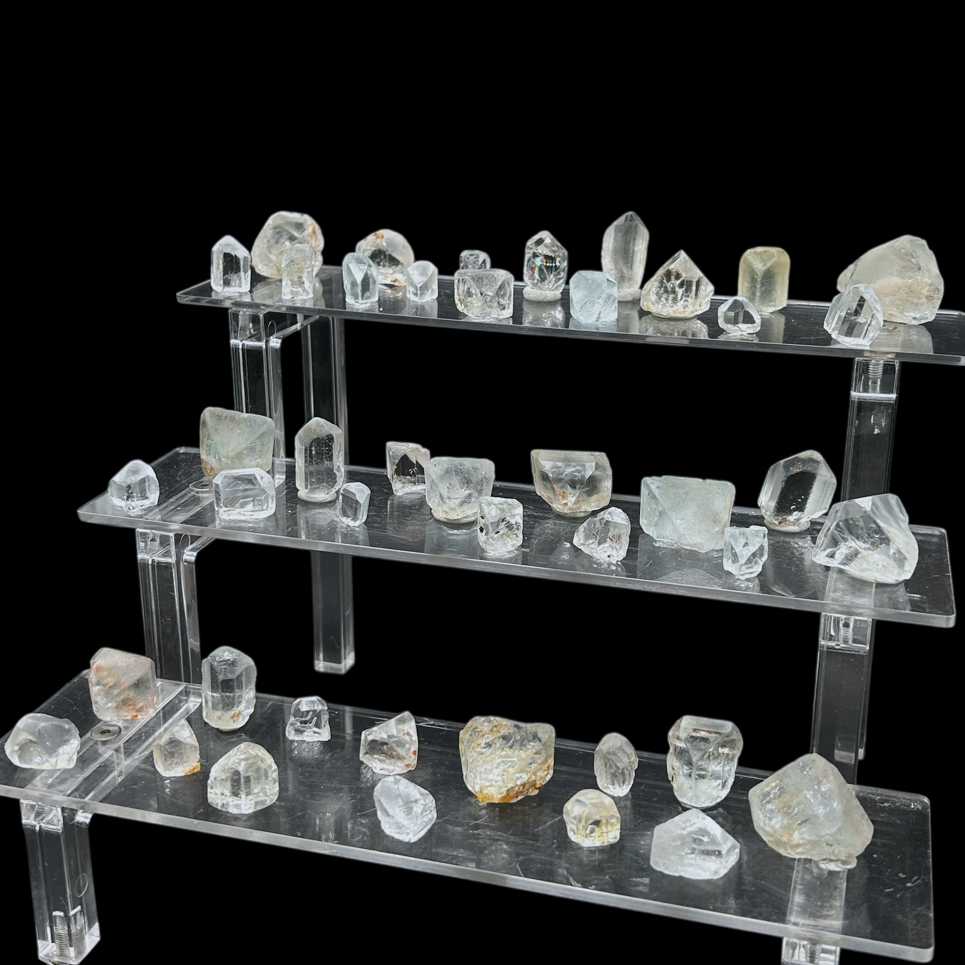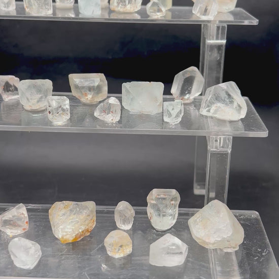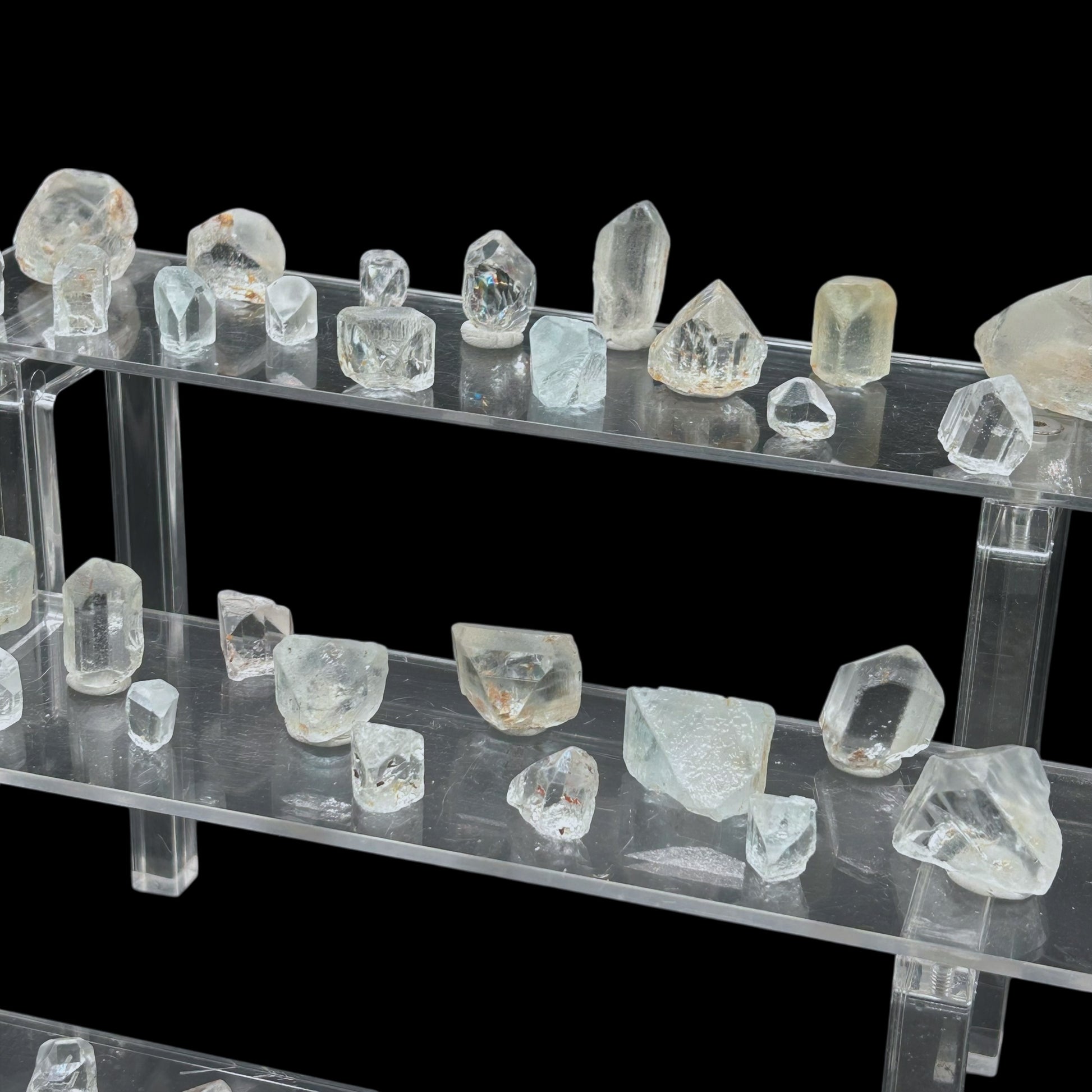 Here we offer 44 pristine topaz crystals, ranging from 1.5 to 4 cm, often eye-clean to flawless, with magnificent terminations and colors from colorless to blue — a truly exceptional selection for collectors and energy practitioners alike.