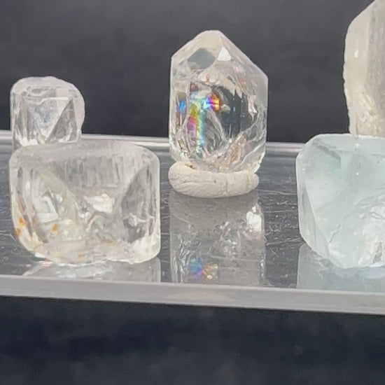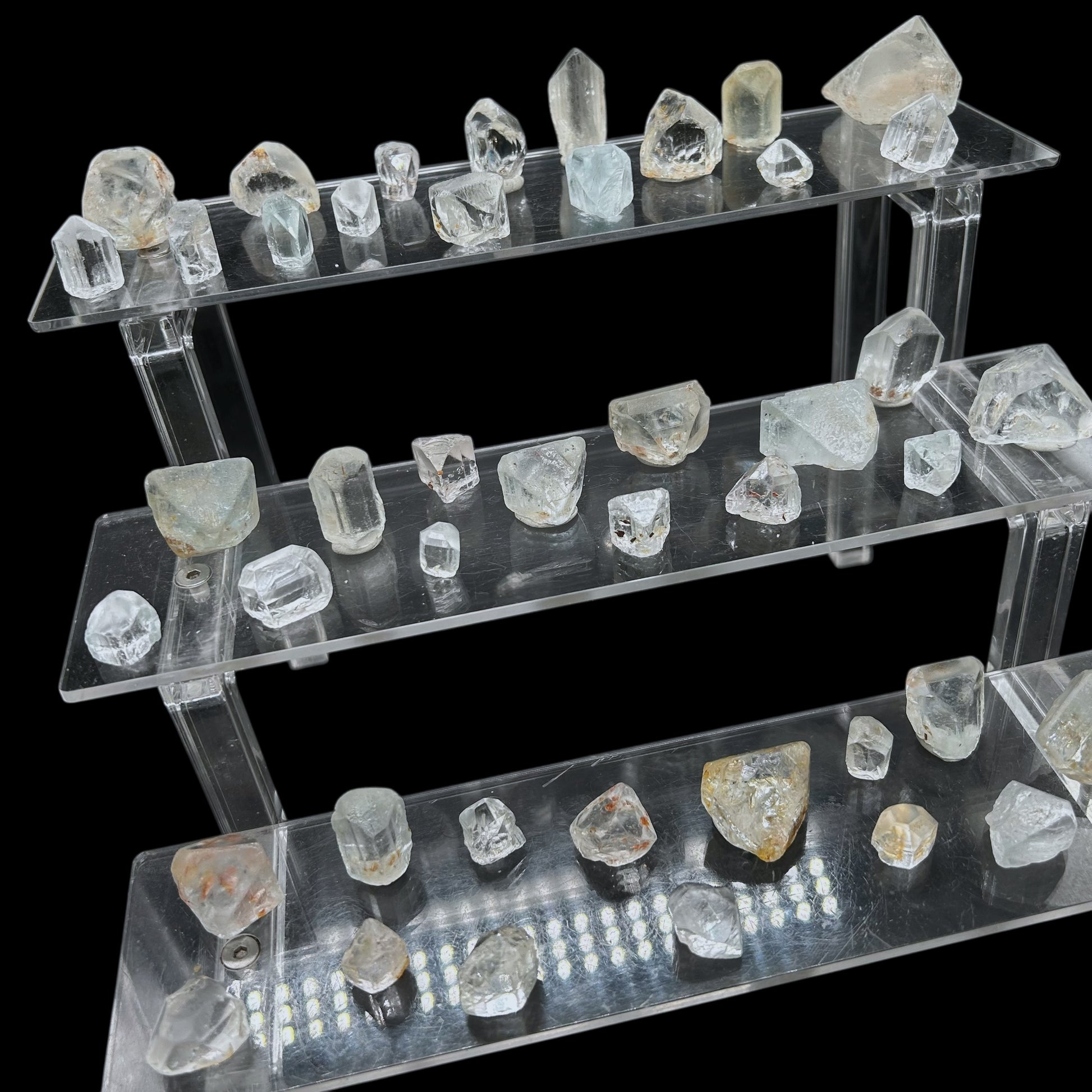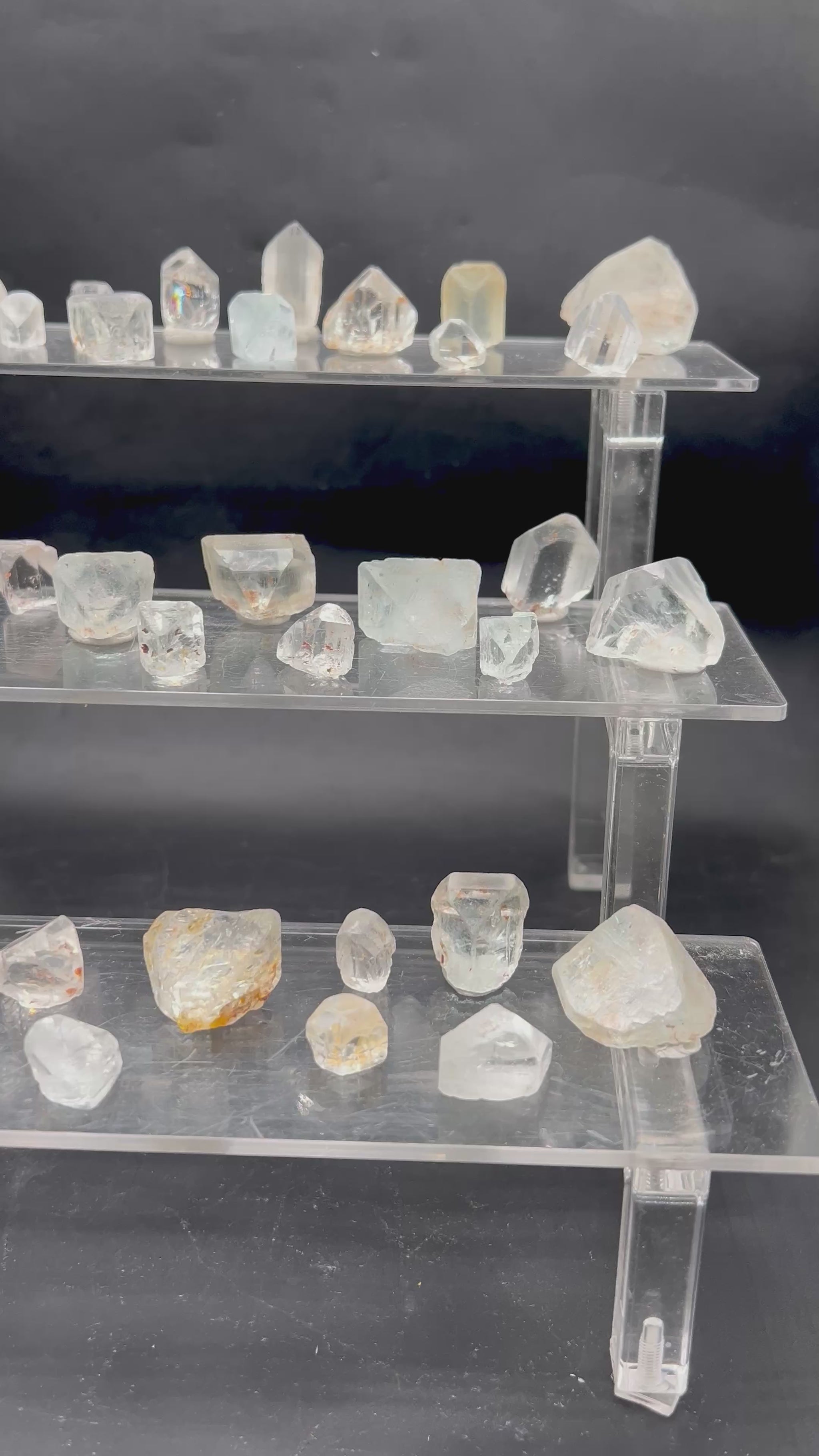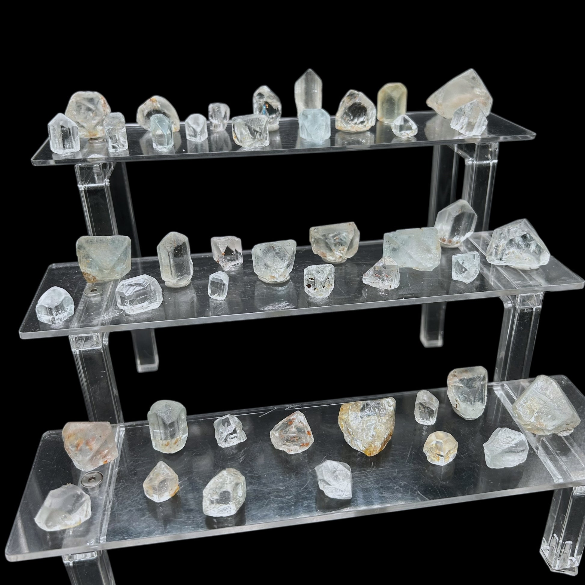 Here we offer 44 pristine topaz crystals, ranging from 1.5 to 4 cm, often eye-clean to flawless, with magnificent terminations and colors from colorless to blue — a truly exceptional selection for collectors and energy practitioners alike.