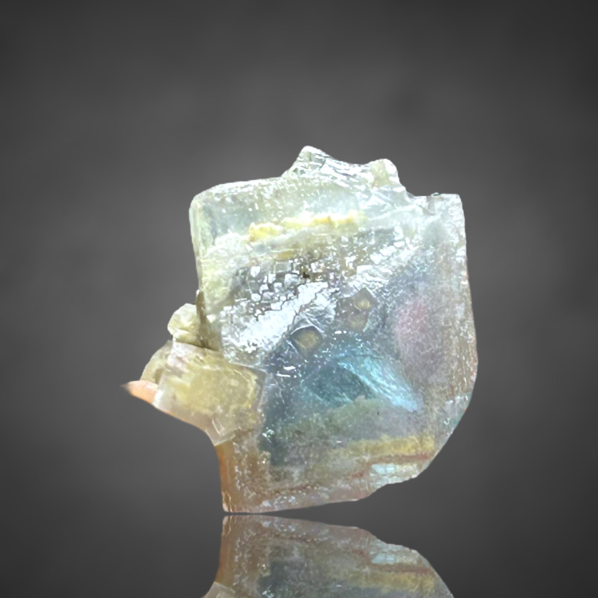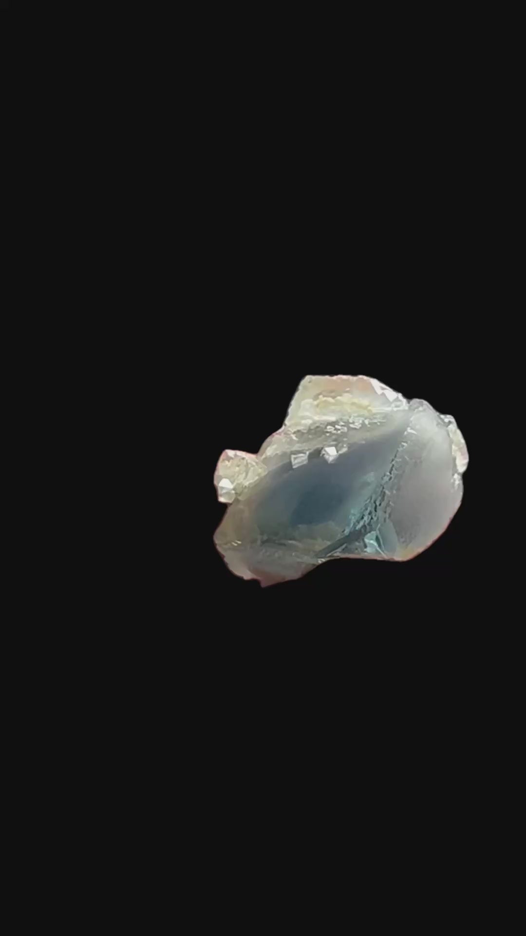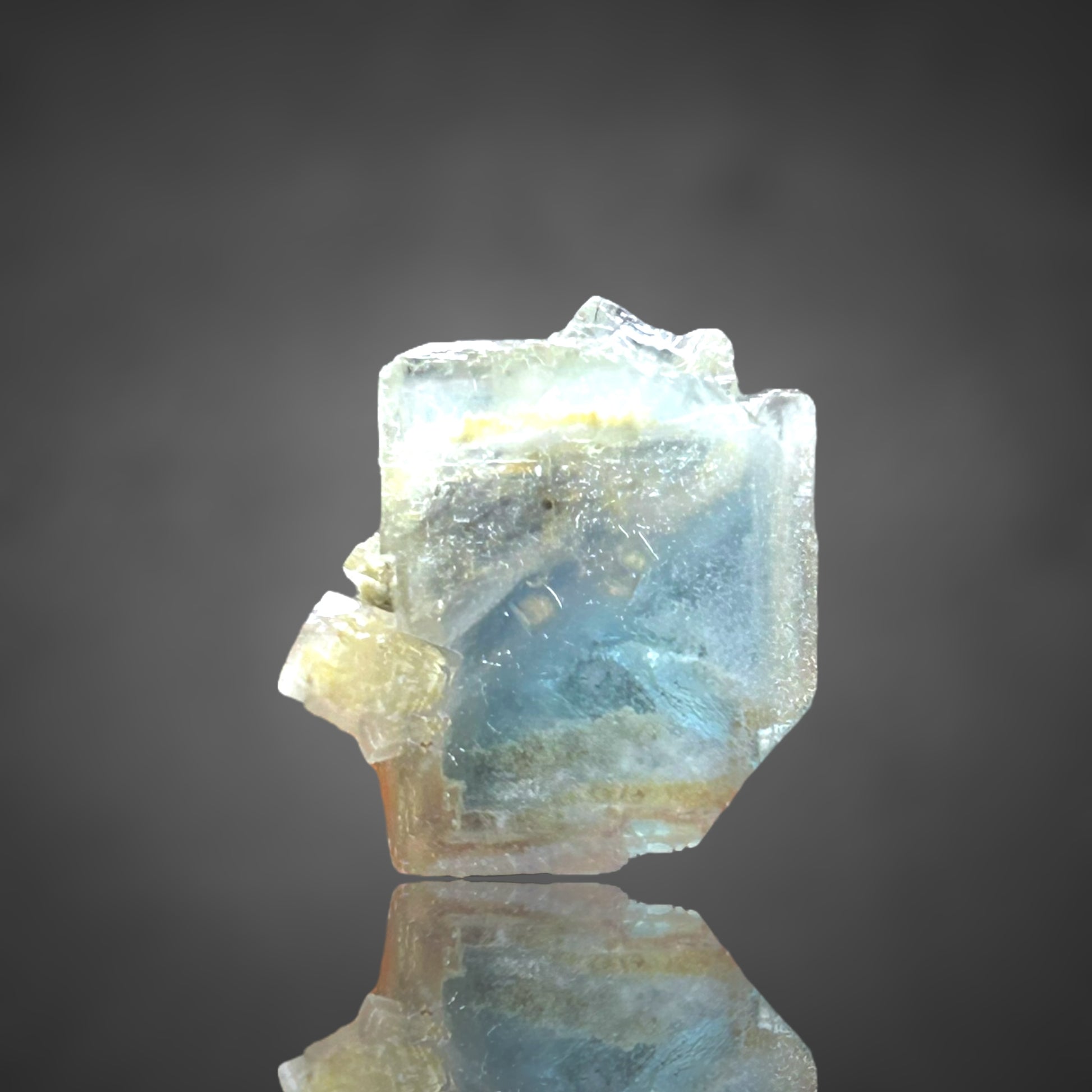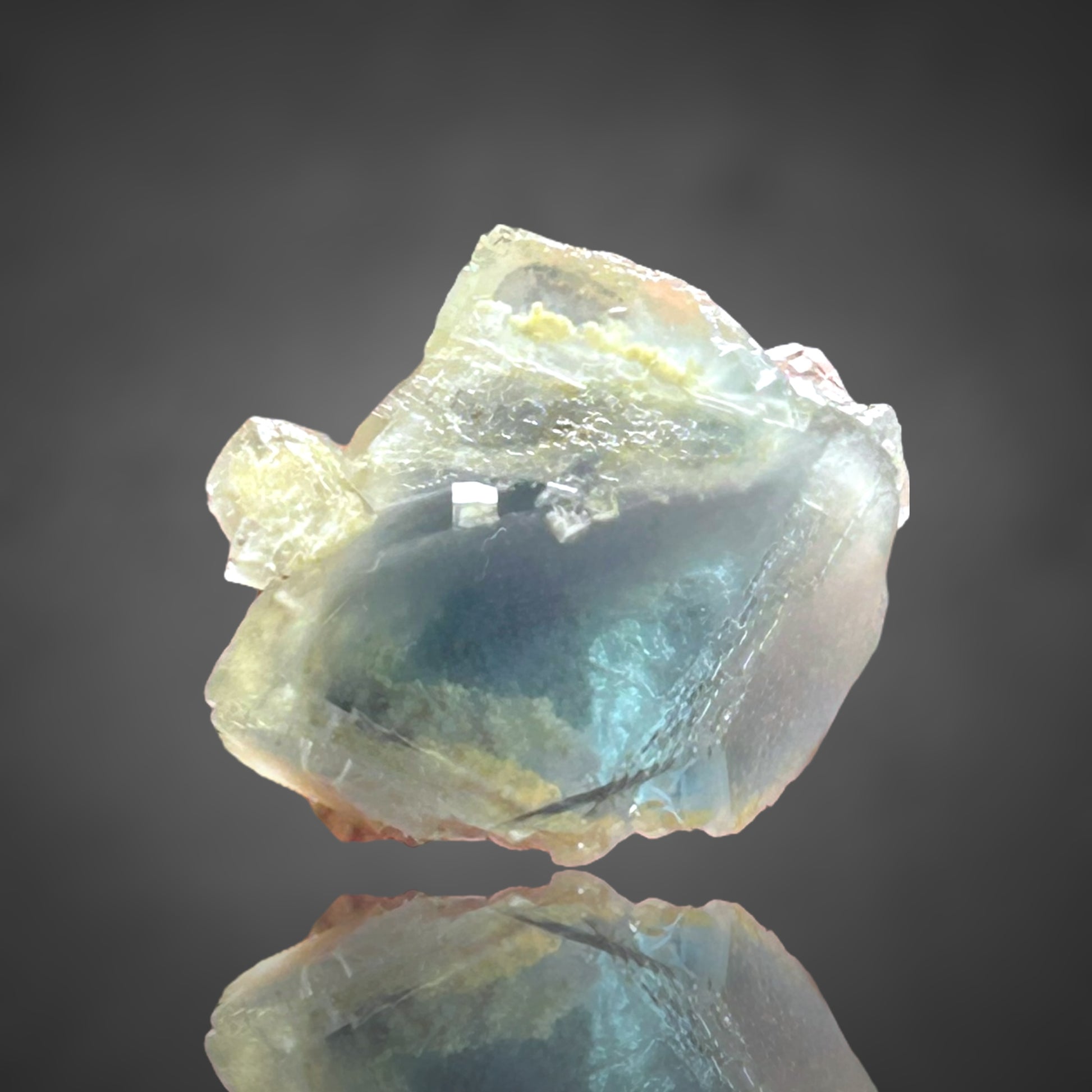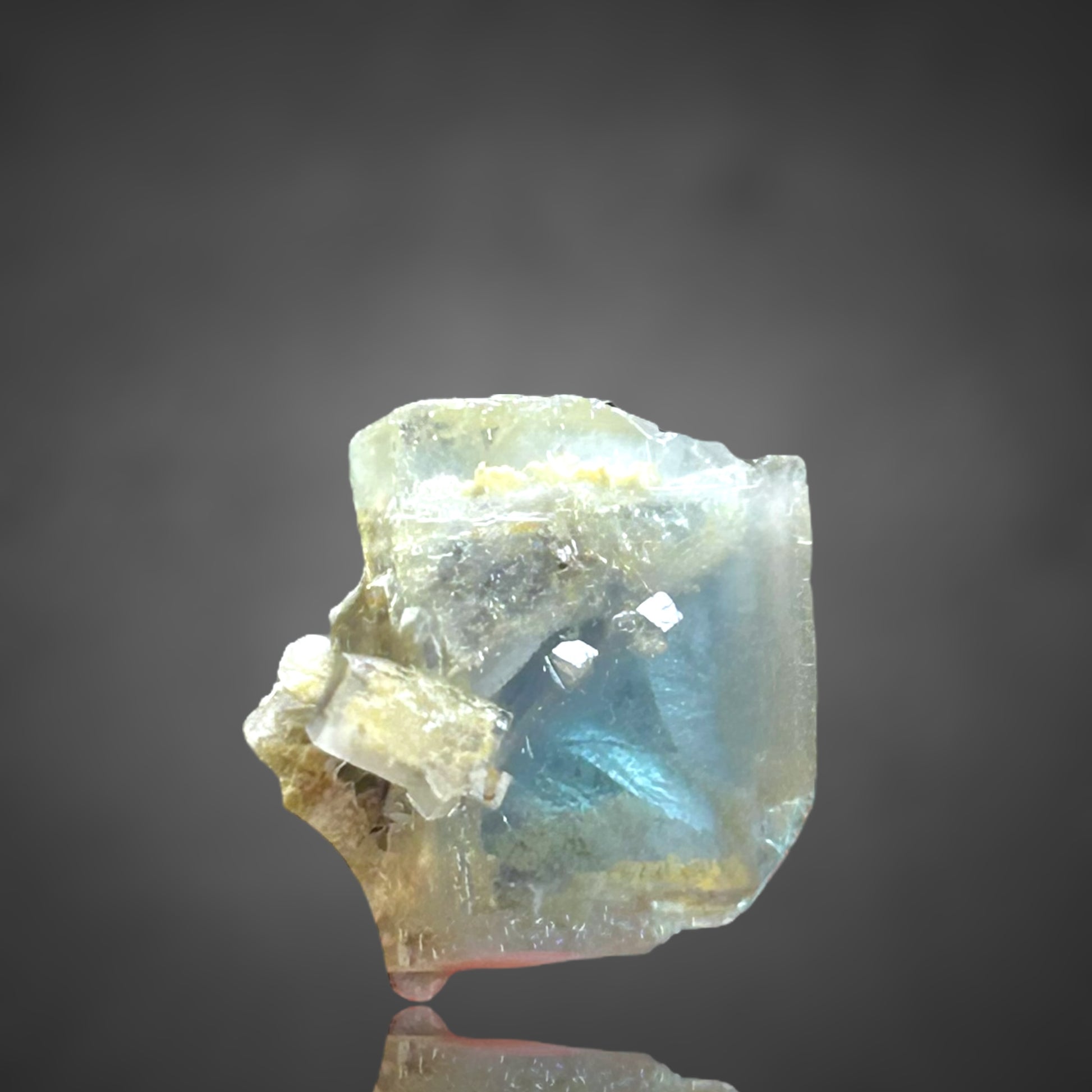 🇩🇪 Leuchtend blauer, aussen parkettierter und innen transparenter, Einzelkristall vom Südhang.Kleine Fluorite sitzen auf ihm.