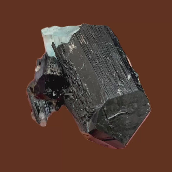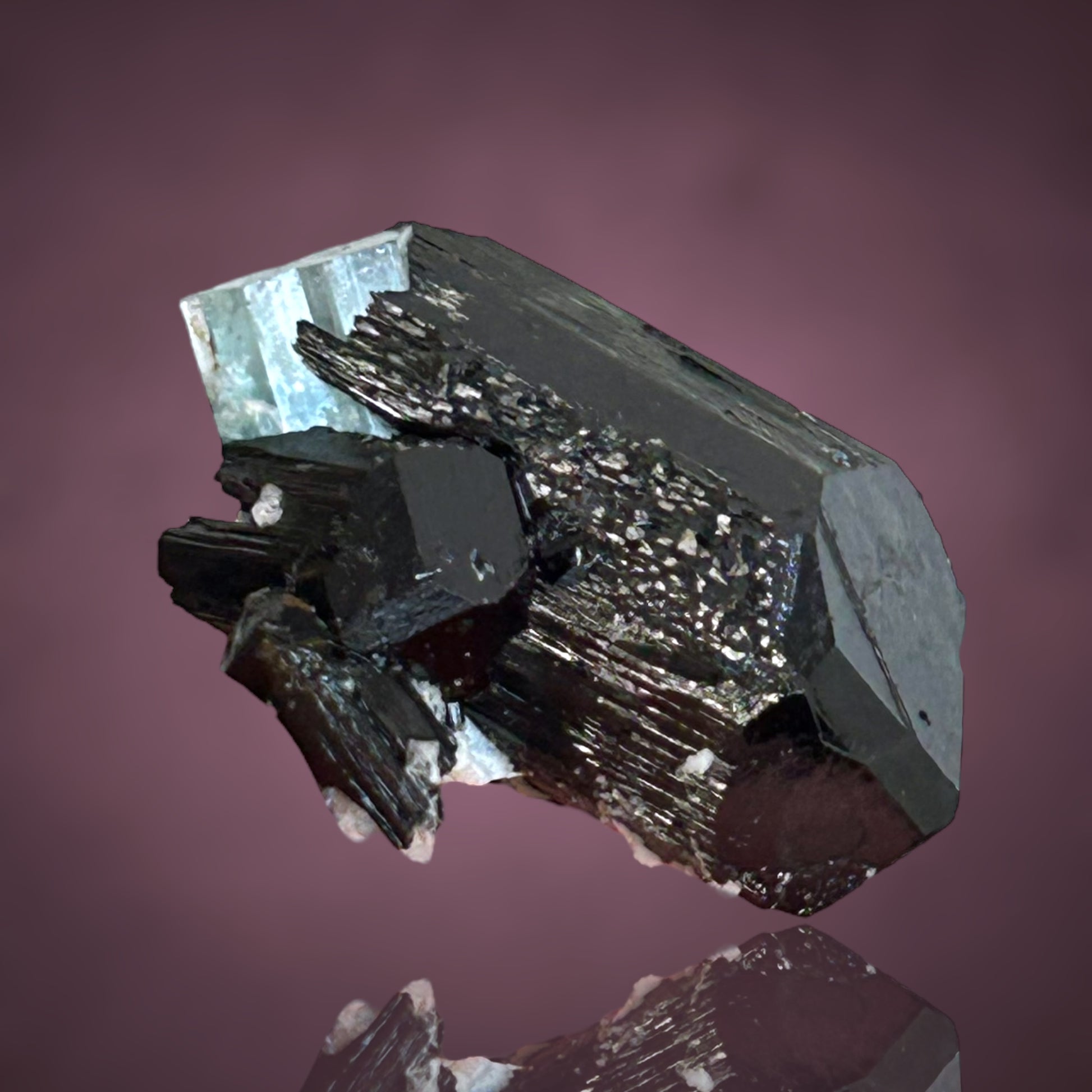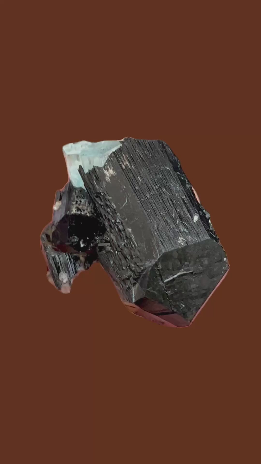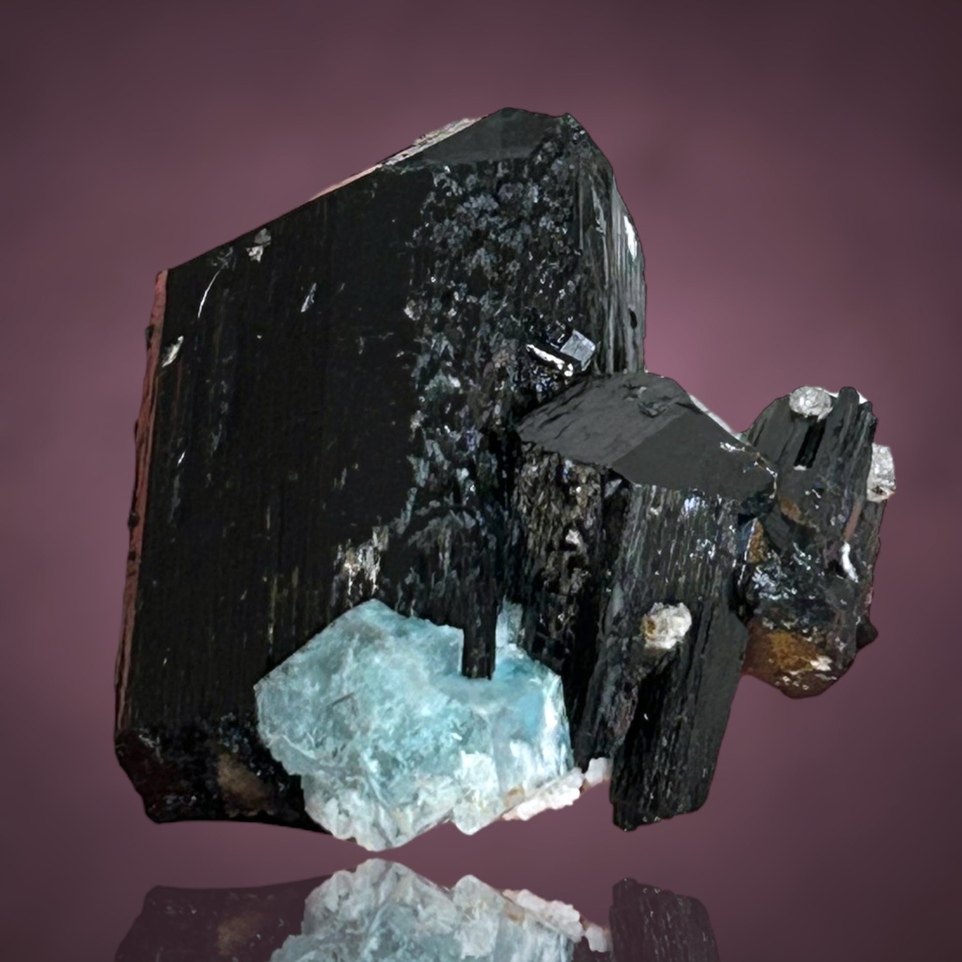 Large, perfectly terminated aquamarine, beautiful color, embedded in a high-luster schorl tourmaline cluster with beautiful crystal faces. A superb specimen.