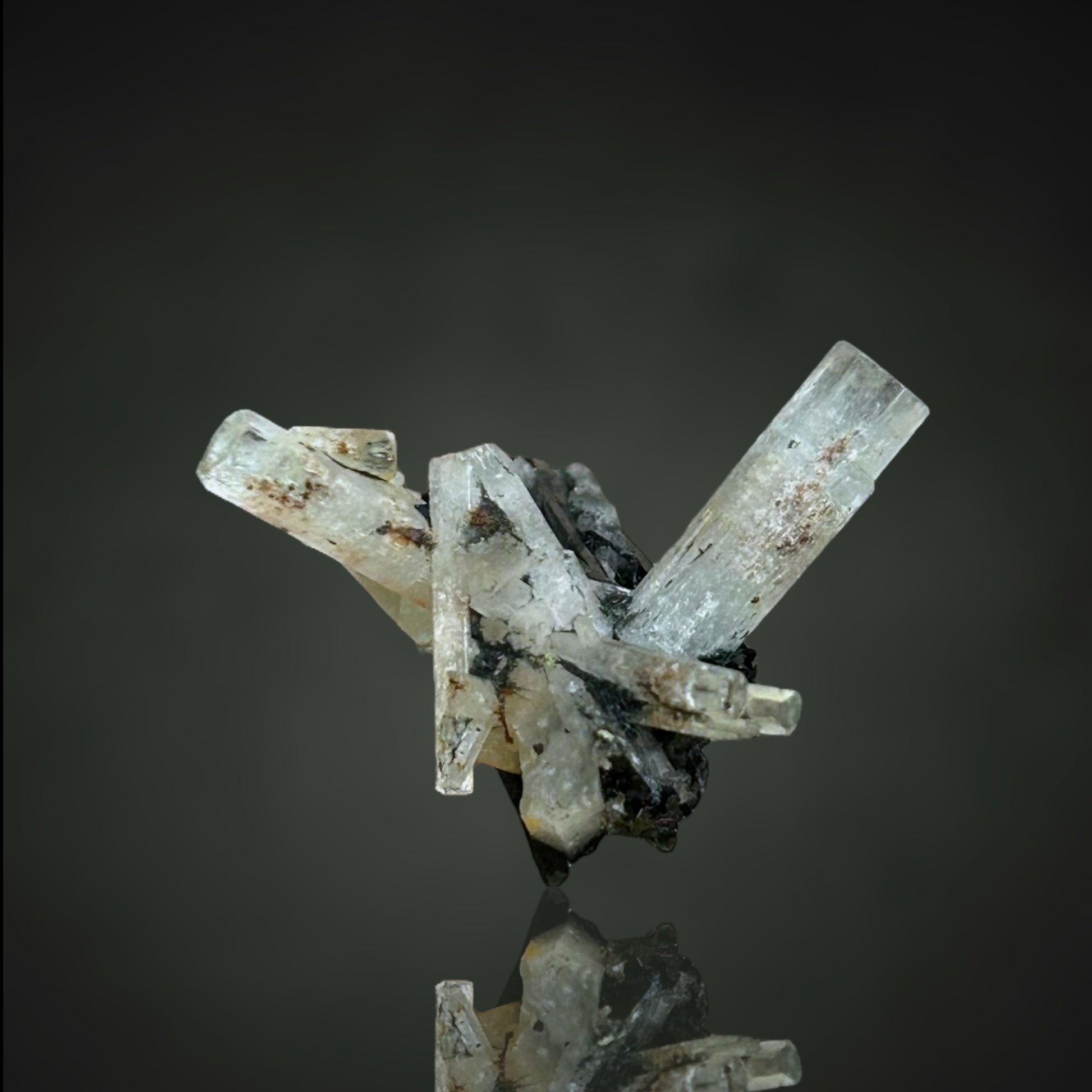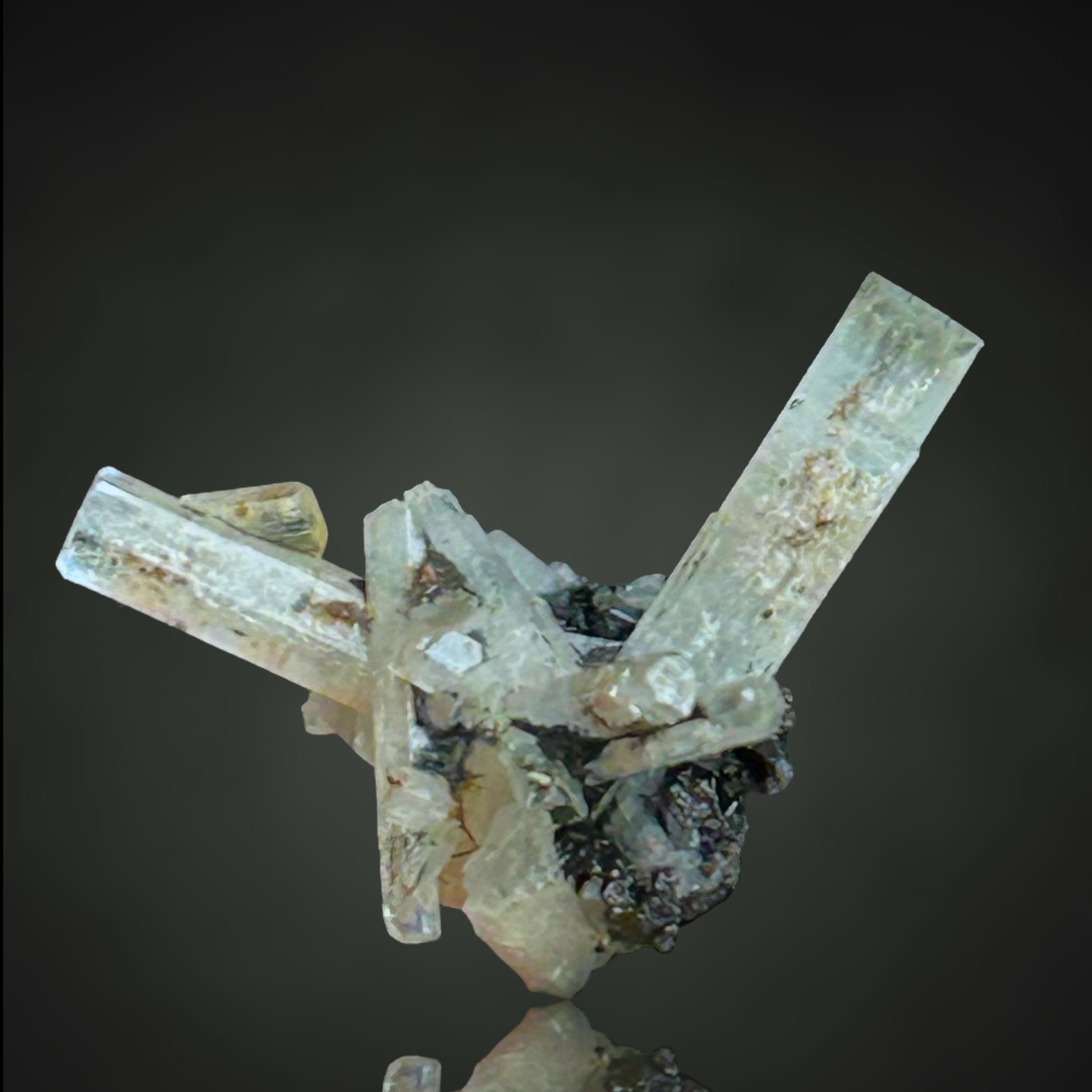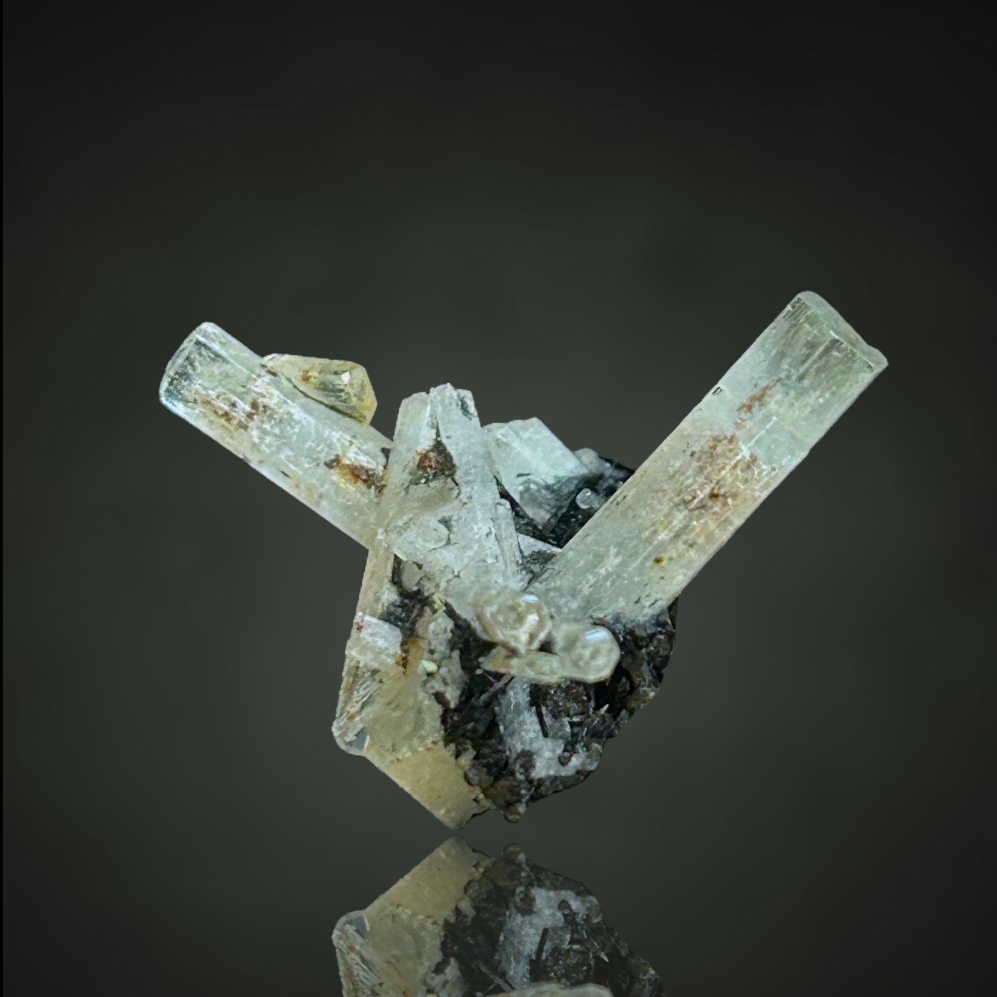 🇬🇧 Several beautifully terminatef aquamarines rise from a schorl tourmaline.