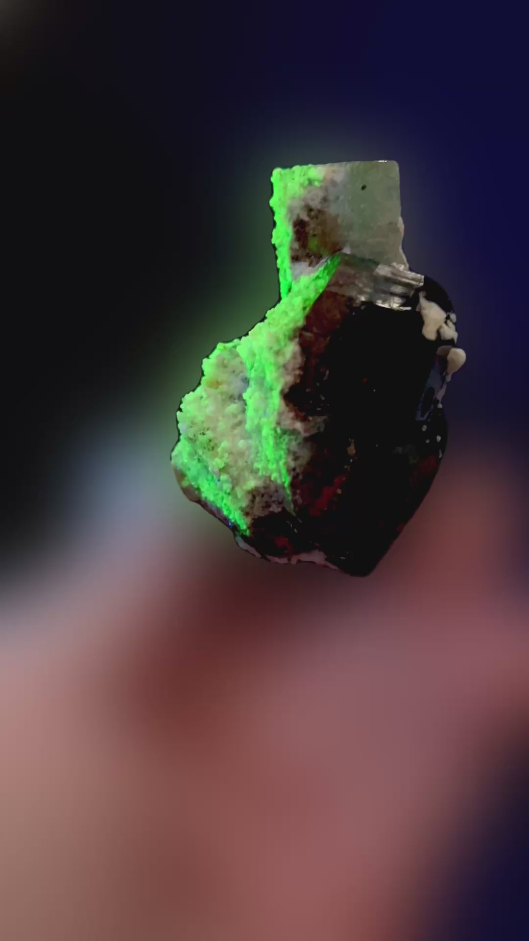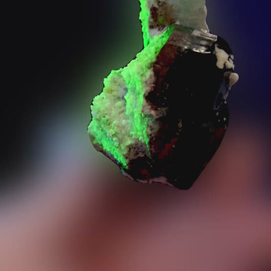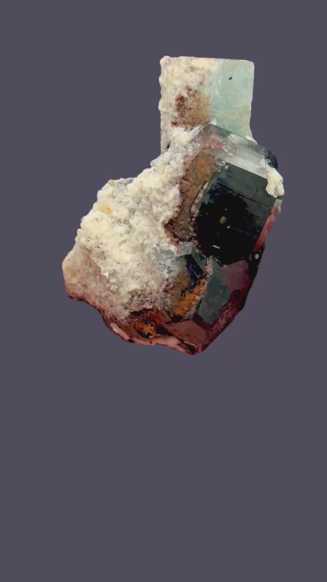 A thumb-thick aquamarine, good color and intact terminal face, set on two schorl tourmalines with excellent, multifaceted faces. This fine collector's piece is topped with bright UV-reactive hyalite.