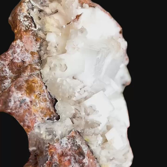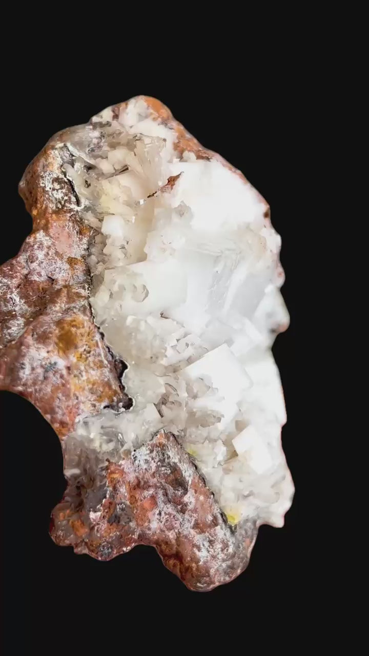 A beautiful classic association specimen featuring very sharp and well-formed, chalk-white colored rhombs of calcite which are associated with thin, gemmy, colorless to reddish-brown crystals of hemimorphite and minor areas of pale yellow mimetite.