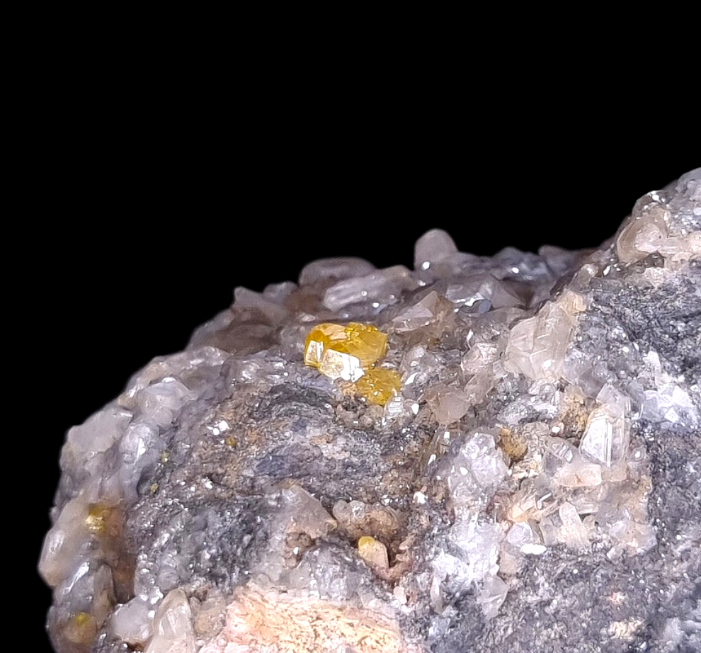 a heart-shaped cerussite crystal aggregate hid in the vug and wulfenite crystals. Wulfenite is not uncommon from Mibladen but rare in combination with cerussite. The crystals are intense dark yellow and blocky, not the typical tabular habit.