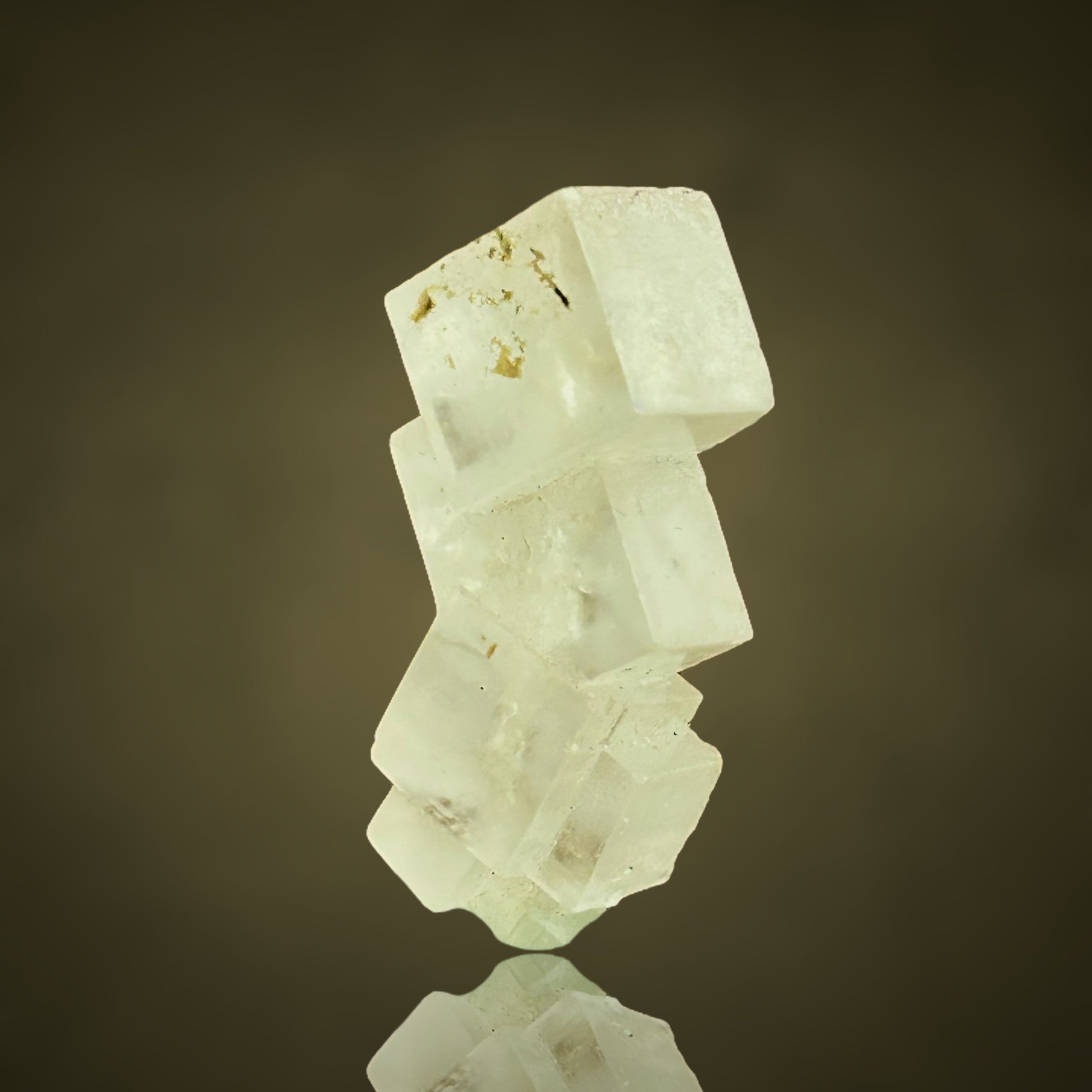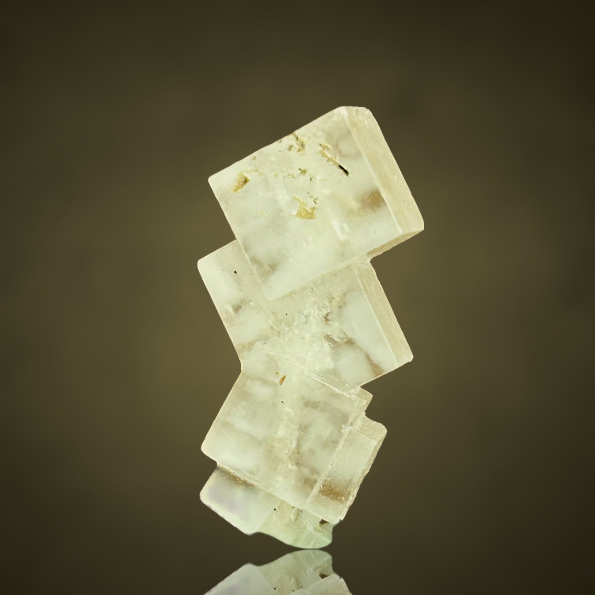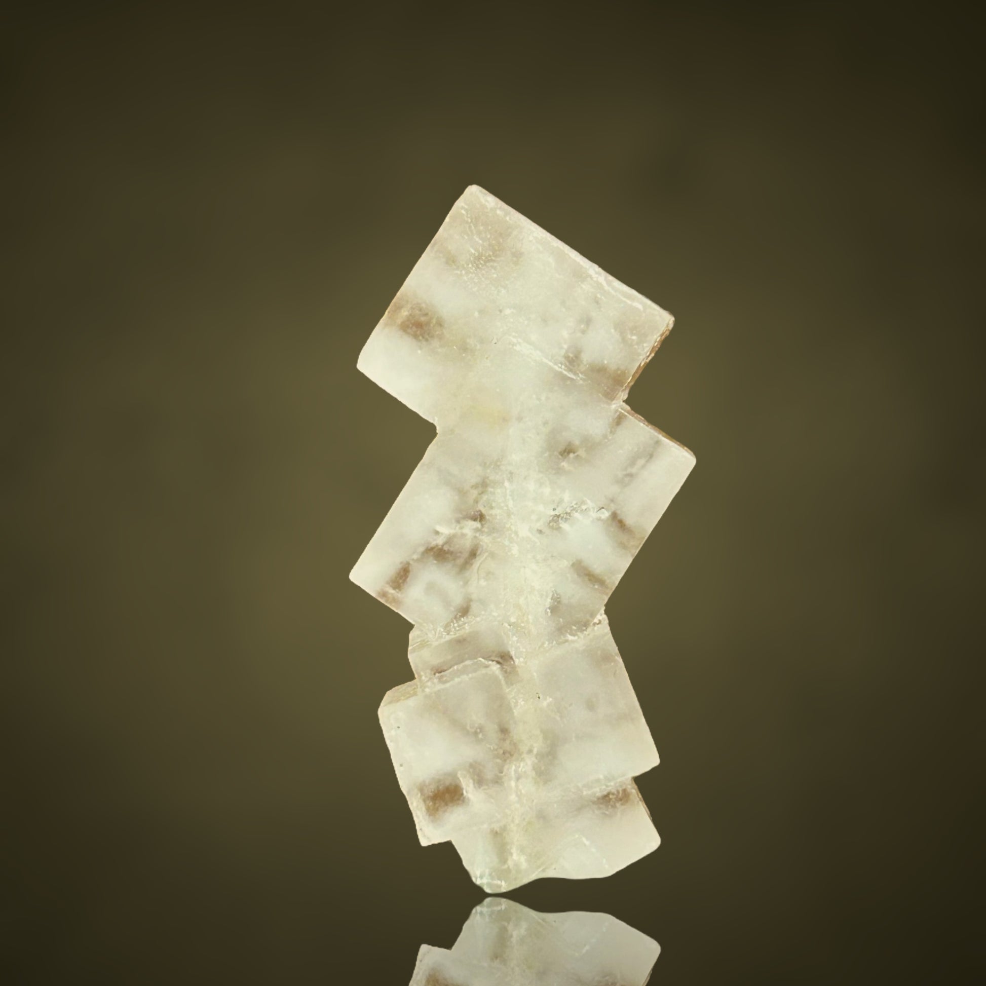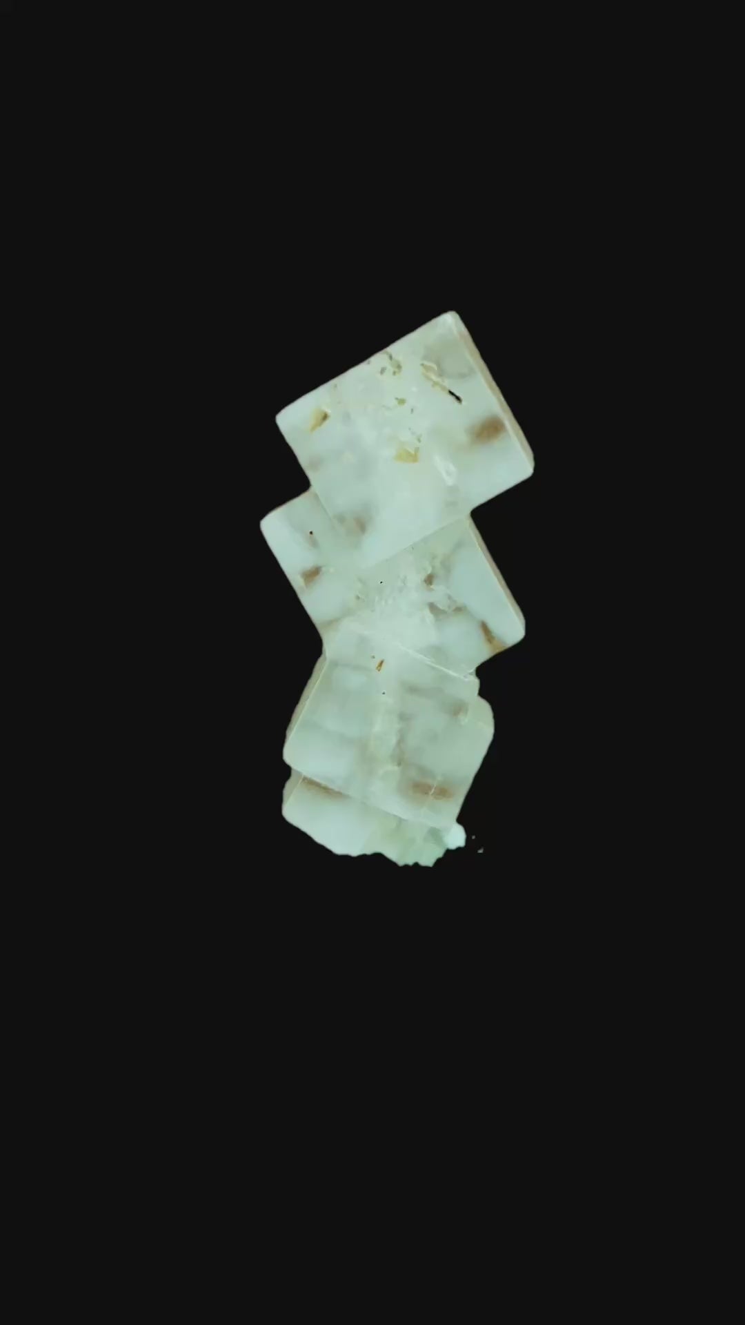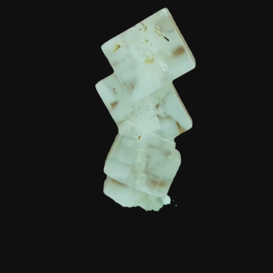 Sharp-edged halite crystals, stacked into a small sculptural formation, featuring a clearly visible continuous thread running through the piece.