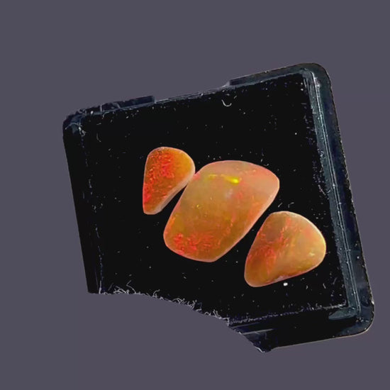 Three fabulous fire opals from Queretara in Mexico, displaying exceptionally opulent and expansive flashes of color, with shifting, almost emotional patterns that reveal themselves beautifully in motion. Truly, truly fine polished fire opals of remarkable visual presence and character.