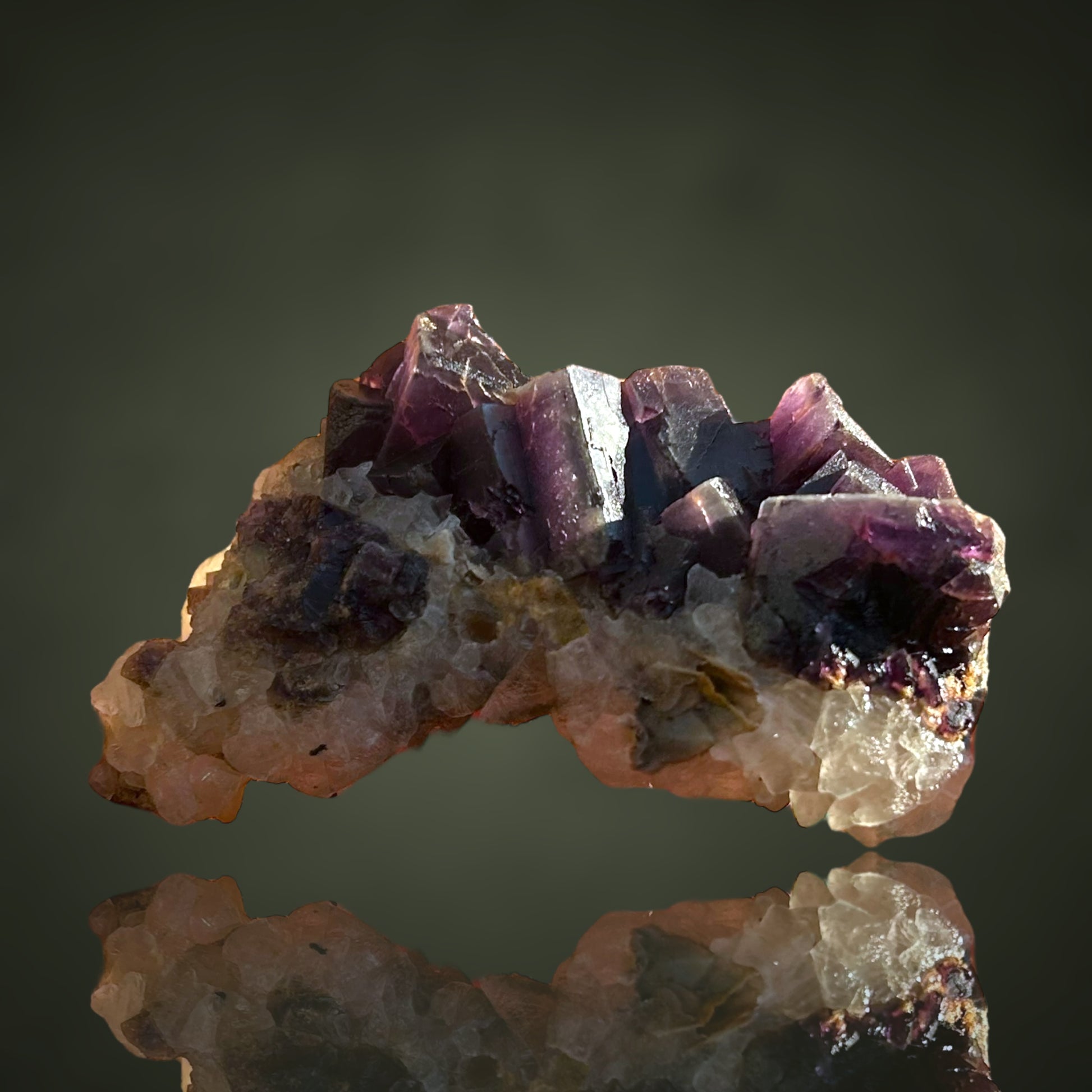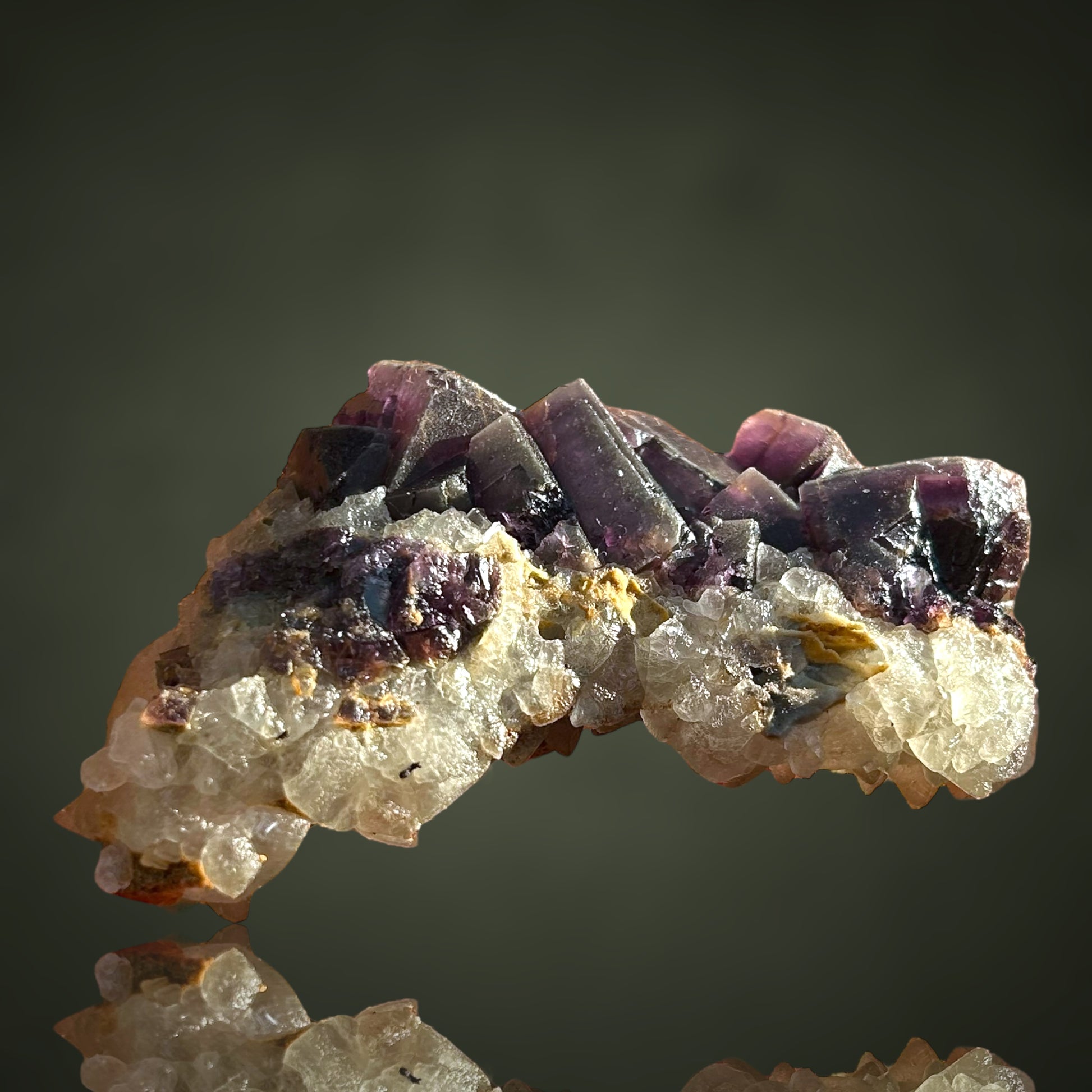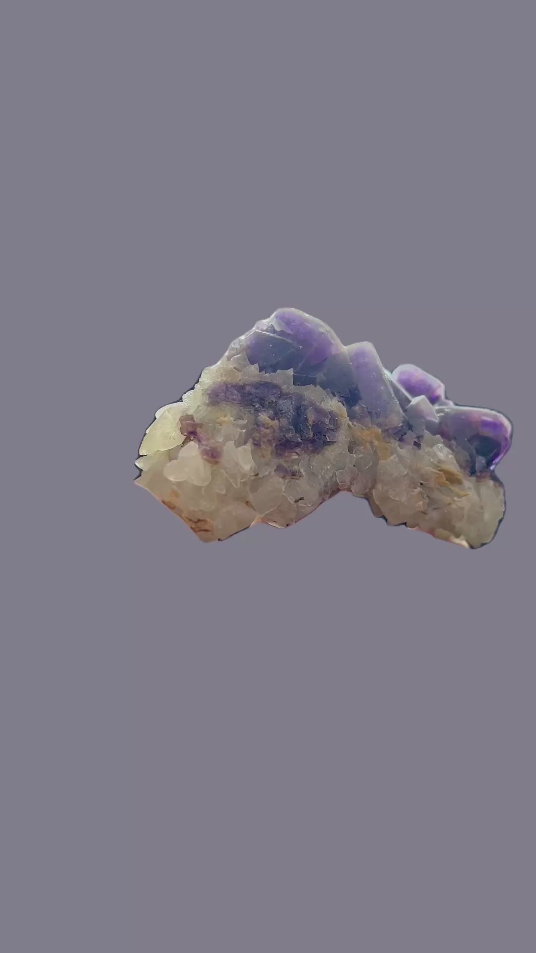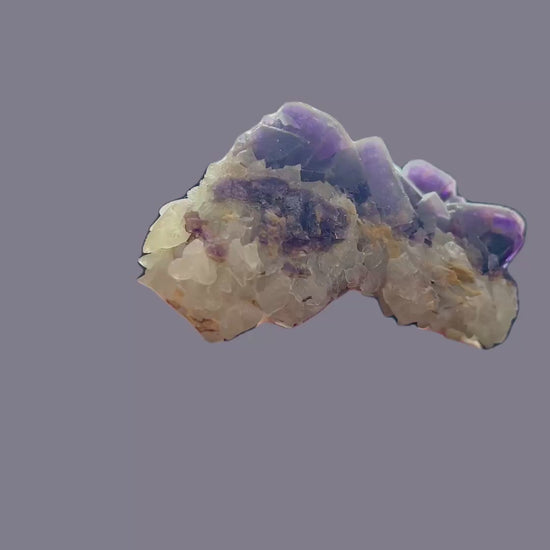 Violet fluorite xx on calcite from the summit cleft at approximately 2700 m, from the permafrost.