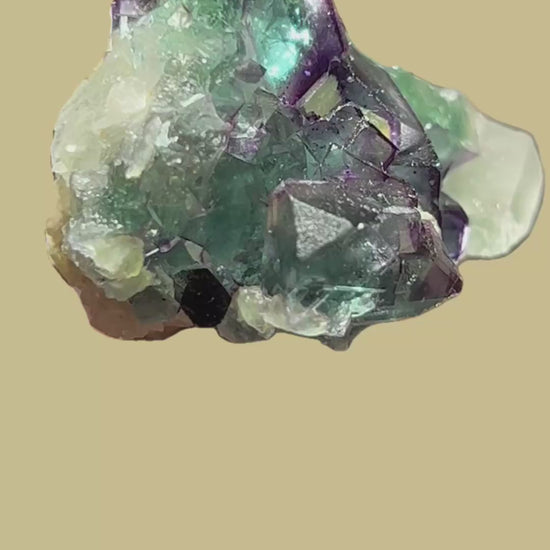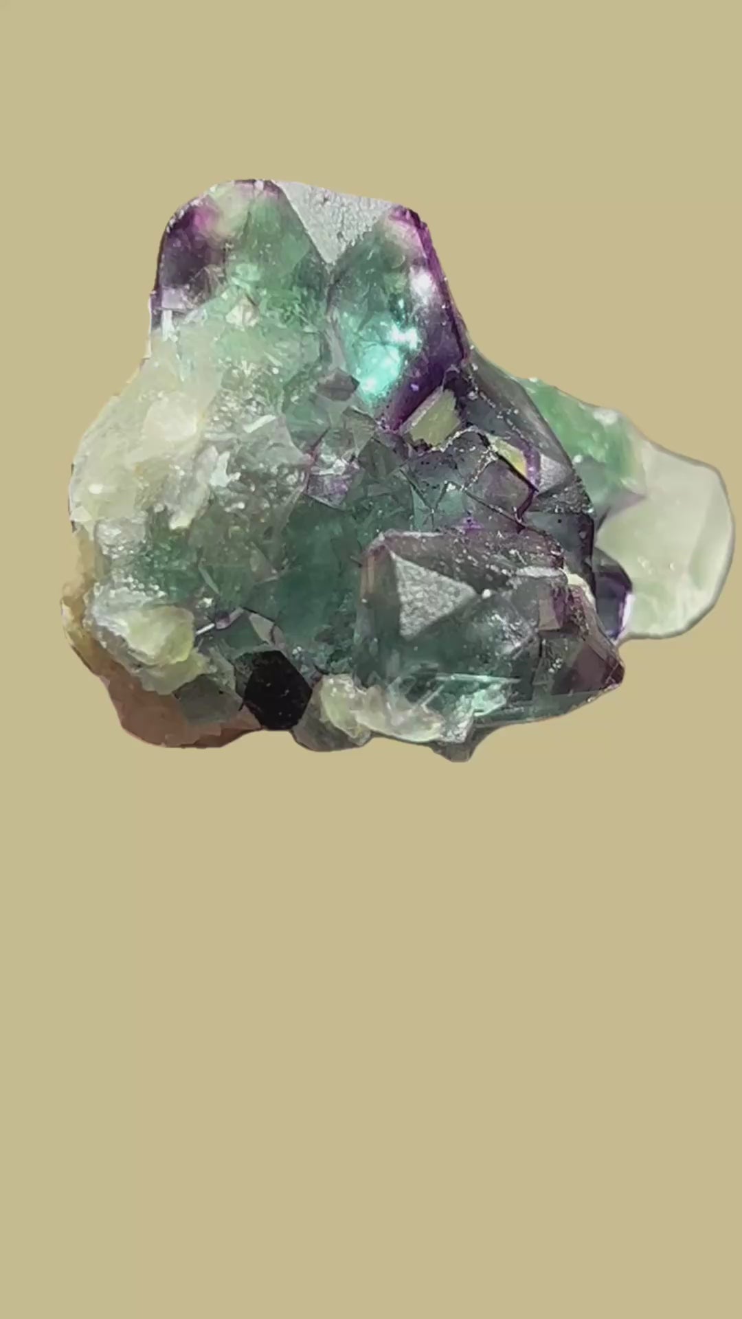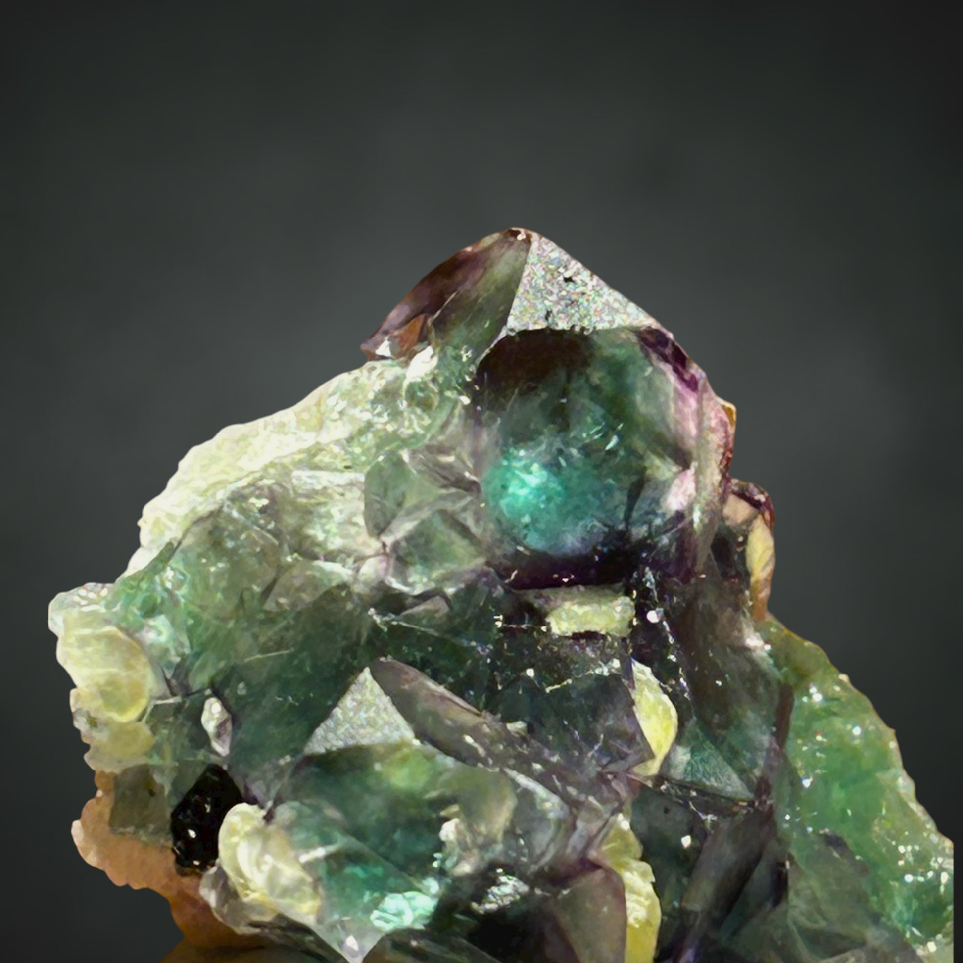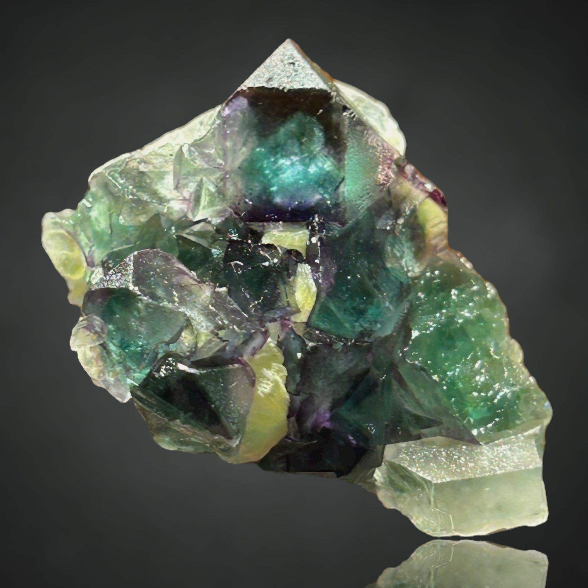 Clear, sharp-edged fluorite crystals showing vivid violet-green color zoning and form a beautifully artistic cluster together with lithium-rich zinwaldite.