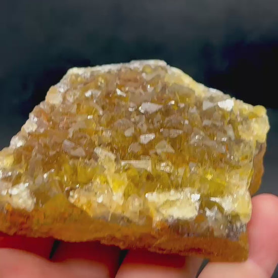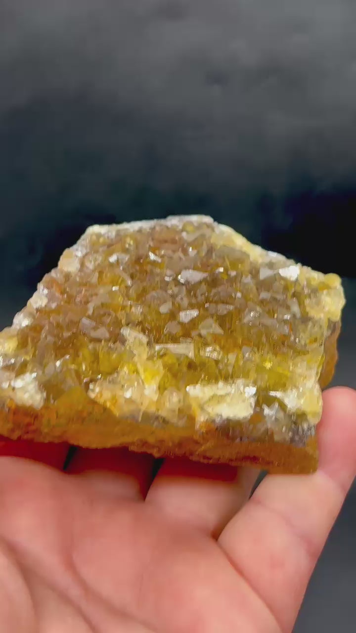 This warm yellow fluorite from the Okorusu mine with its sparkling crystals is incredibly intense and completely transparent on matrix.