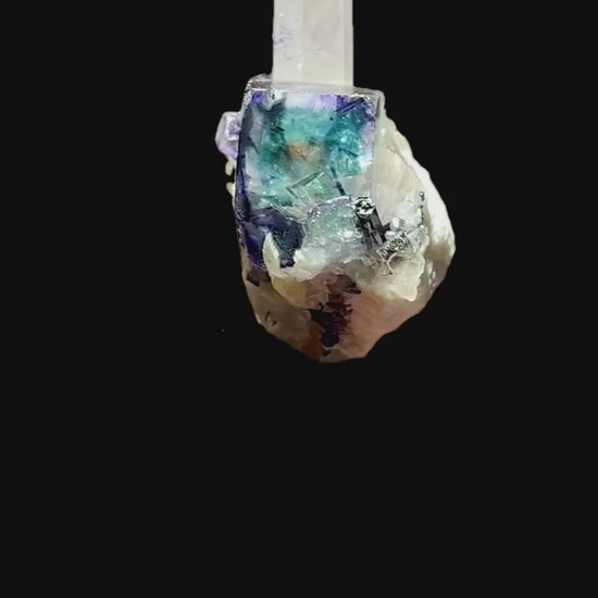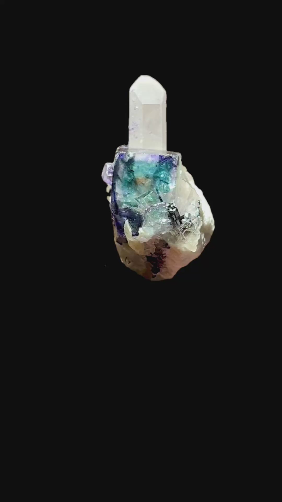 Spectacular Fluorite with intensely coloured, sharply defined phantoms forming a striking contrast to the elongated white Quartz crystal with an undamaged termination.