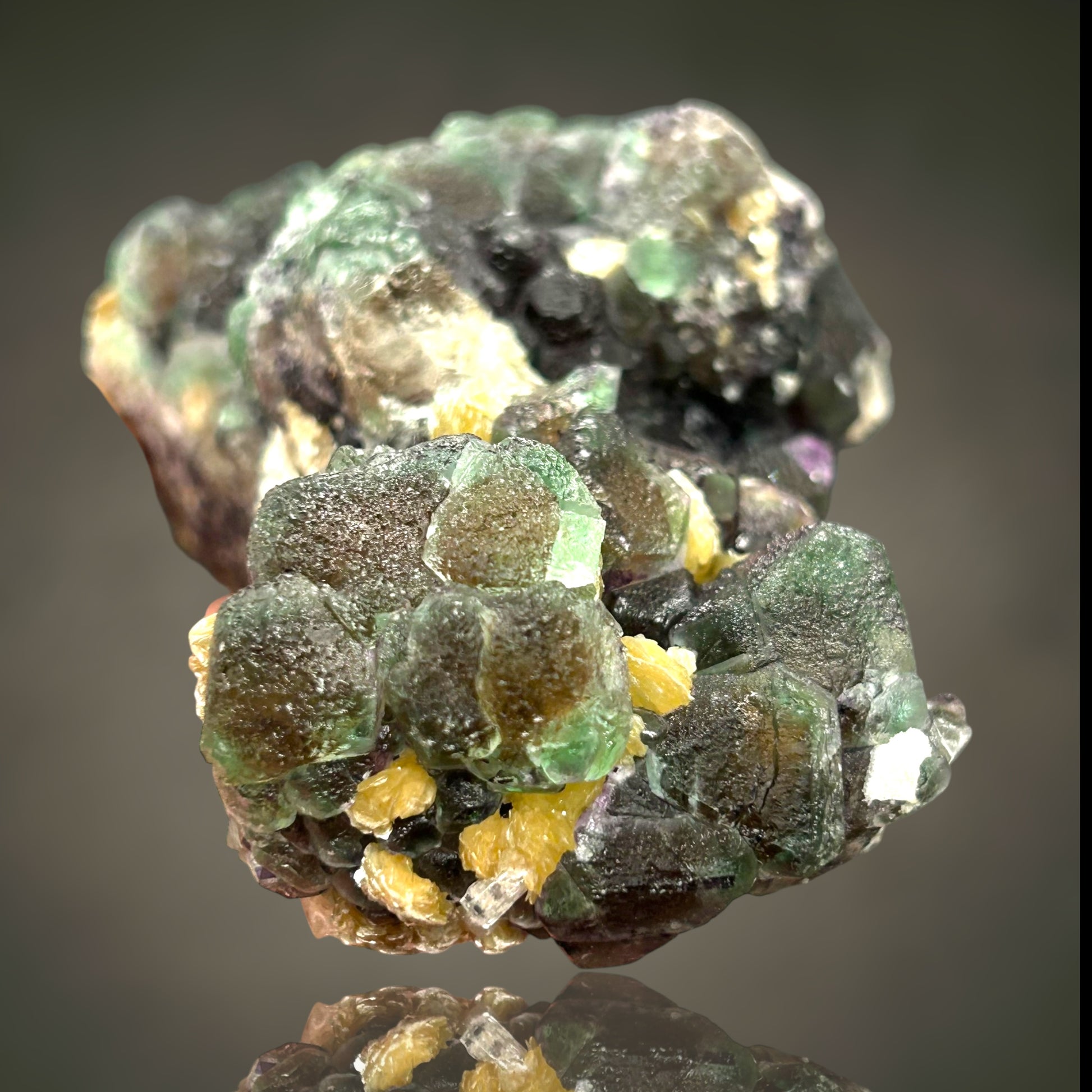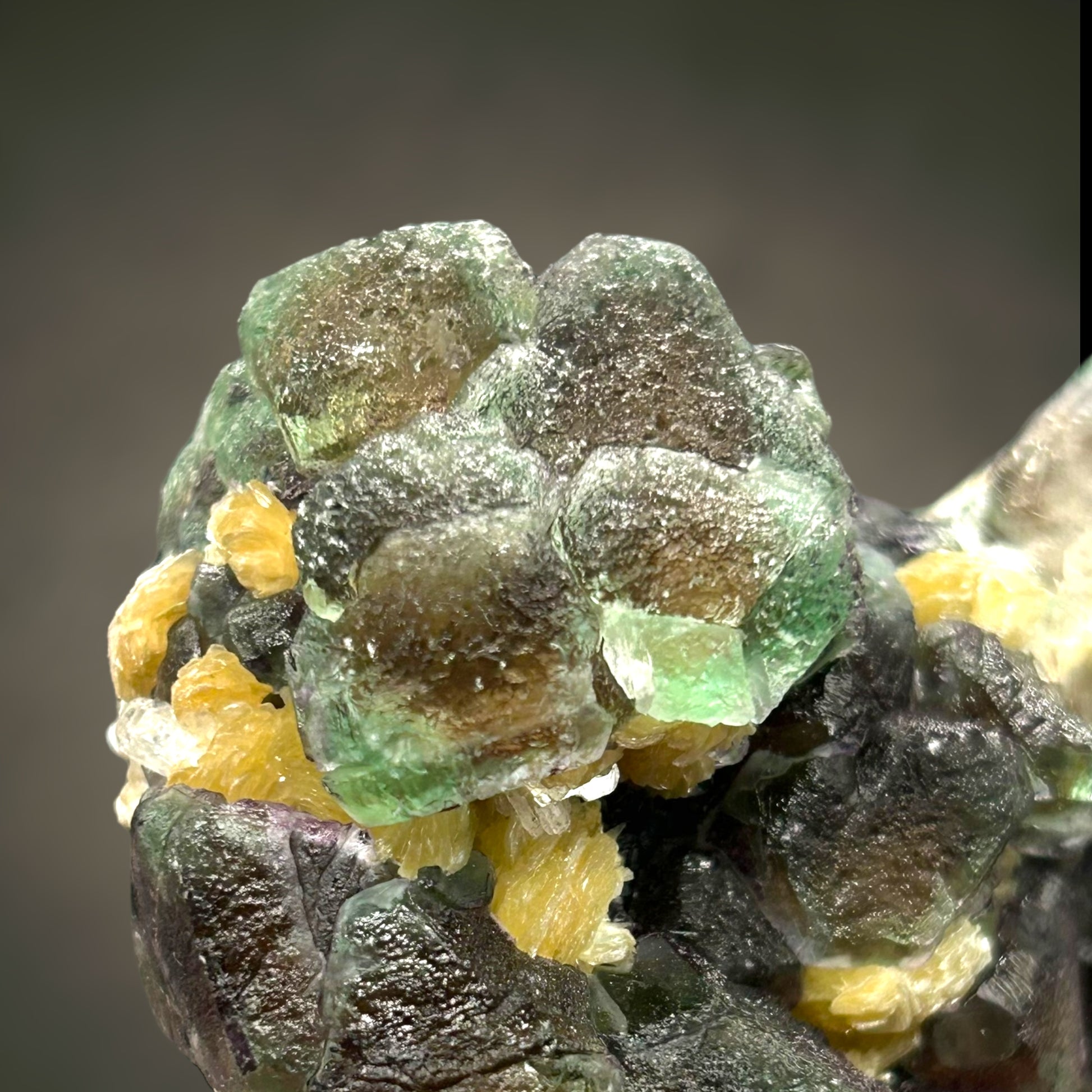 A magical combination specimen featuring green fluorite octahedra with orange phantoms.