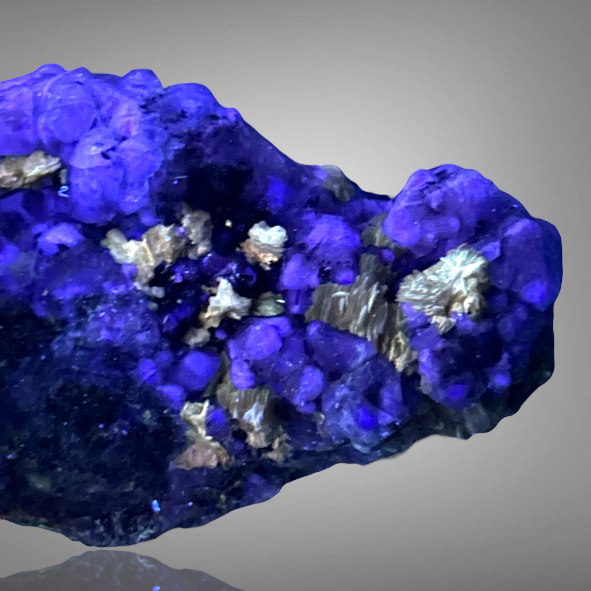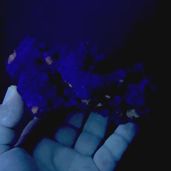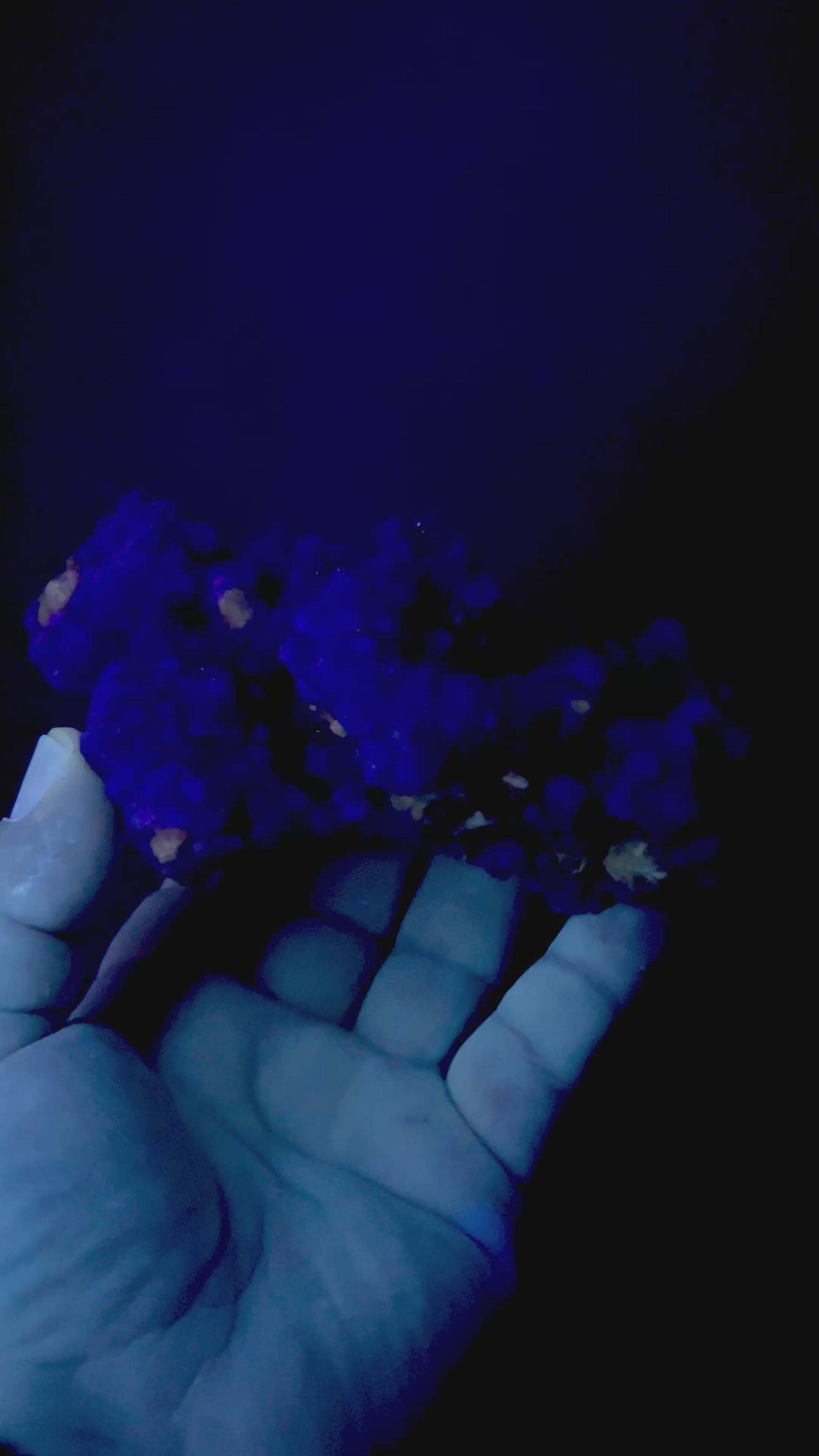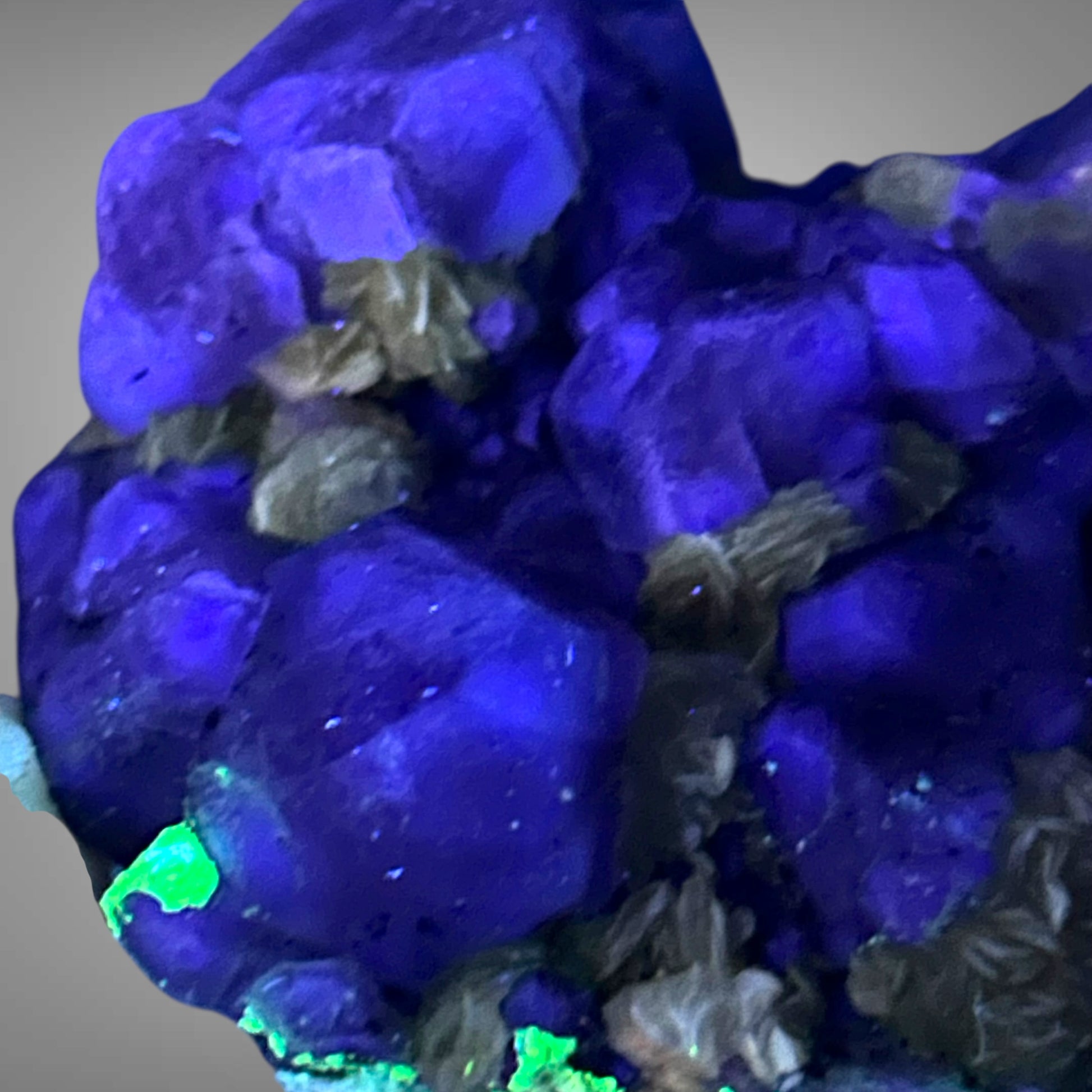 Under UV light, the specimen reveals a completely different color variety: the fluorite turns bright blue and the actual zinnwaldite orange (orange & blue, what a beautiful combination), and at the base of the specimen (a smoky quartz/feldspar matrix), even brighter hyalite appears.