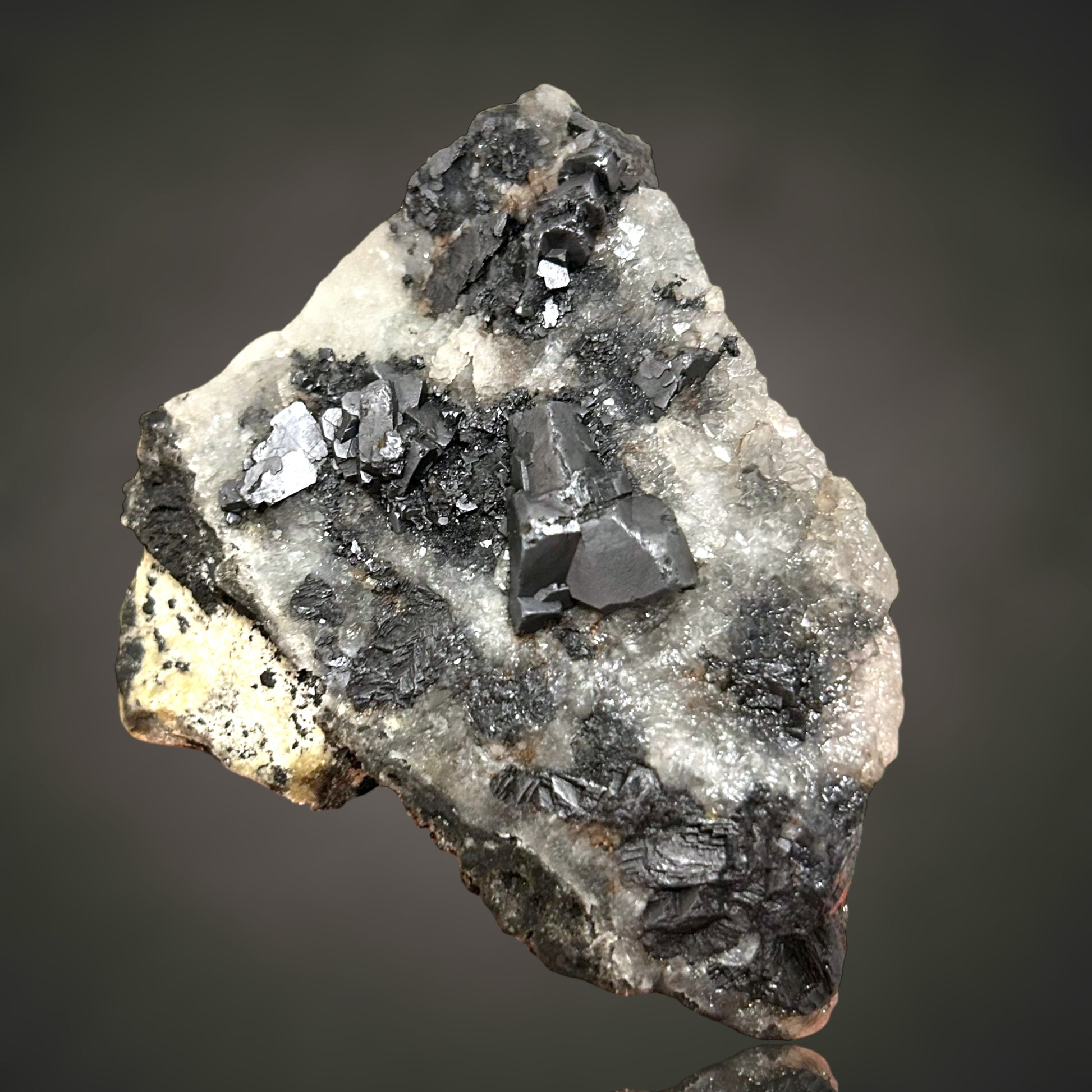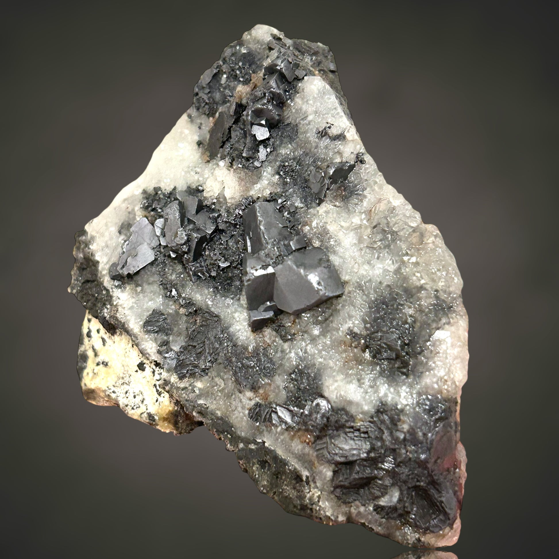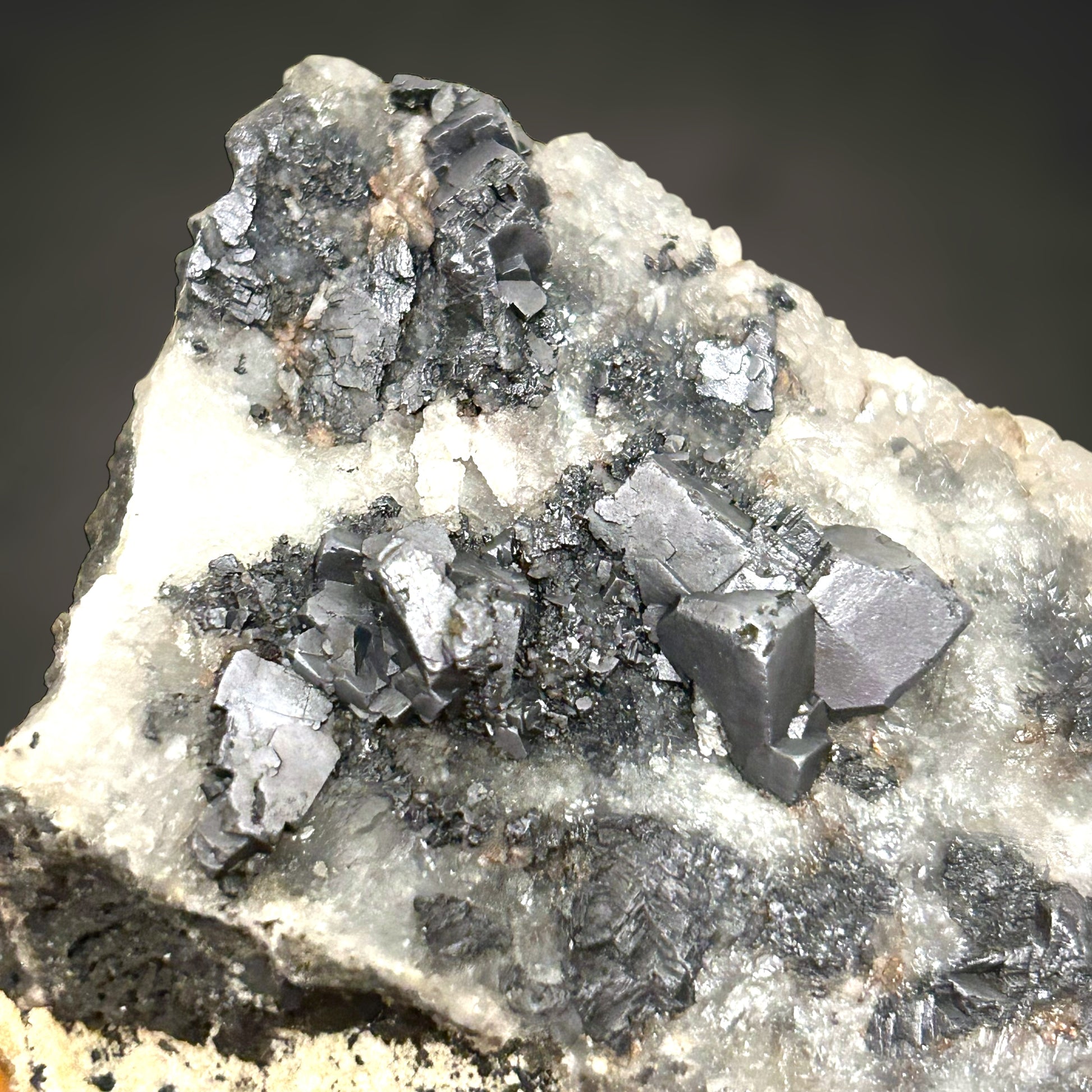 Here we see a richly crystallized assemblage of galena crystals in a variety of well-developed forms. A true classic from the Harz mining district, originating from the Wiemannsbucht Mine in Bad Grund, Germany. The lustrous lead-gray galena crystals are attractively perched on a sparkling carpet of quartz, providing excellent contrast. Along one side of the specimen, minor siderite is present, adding further mineralogical interest and underscoring the typical paragenesis of this renowned locality.
