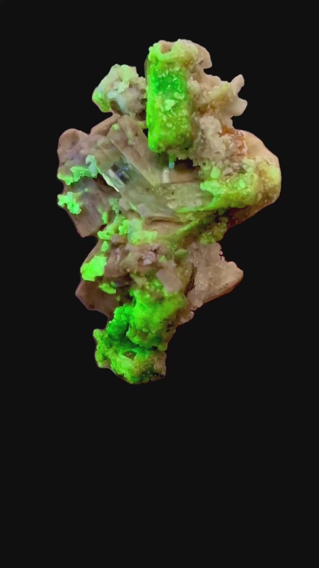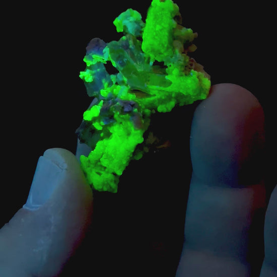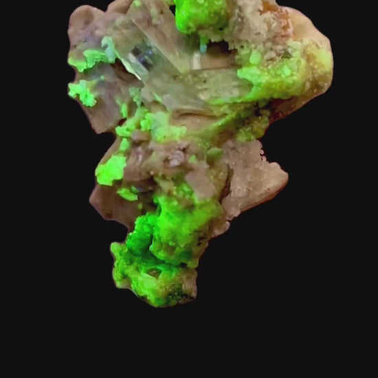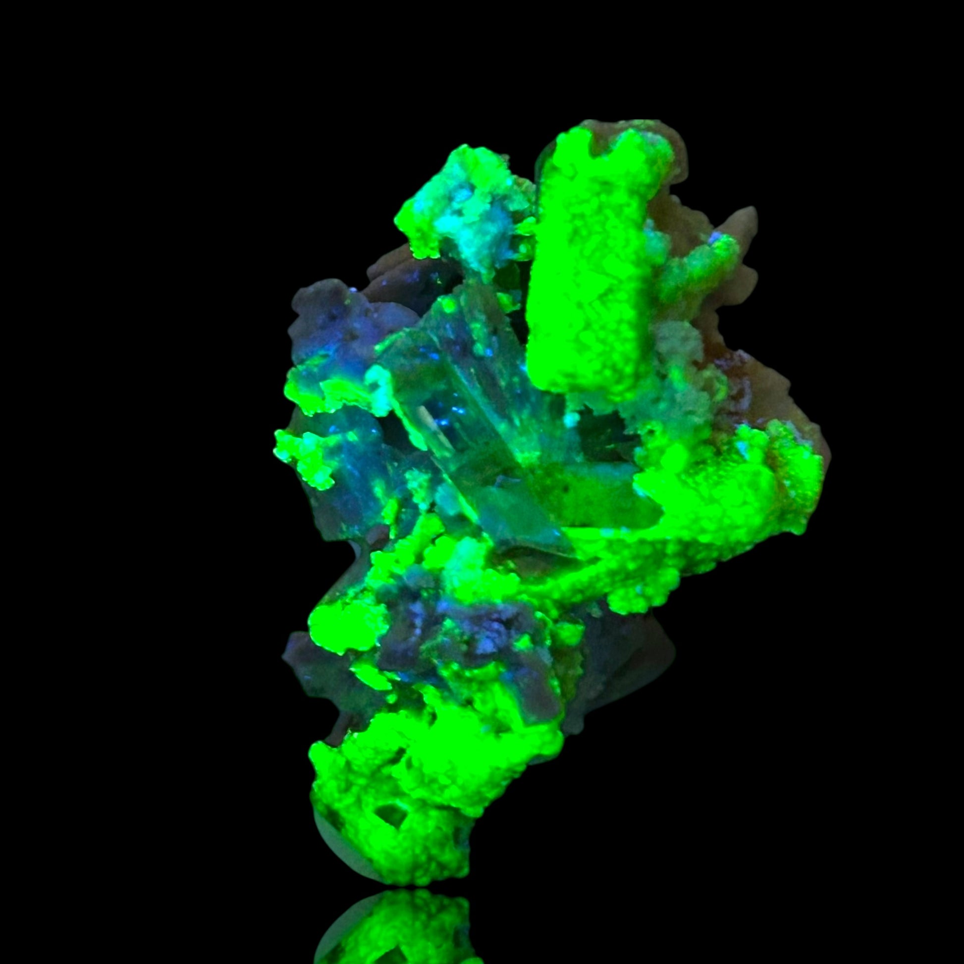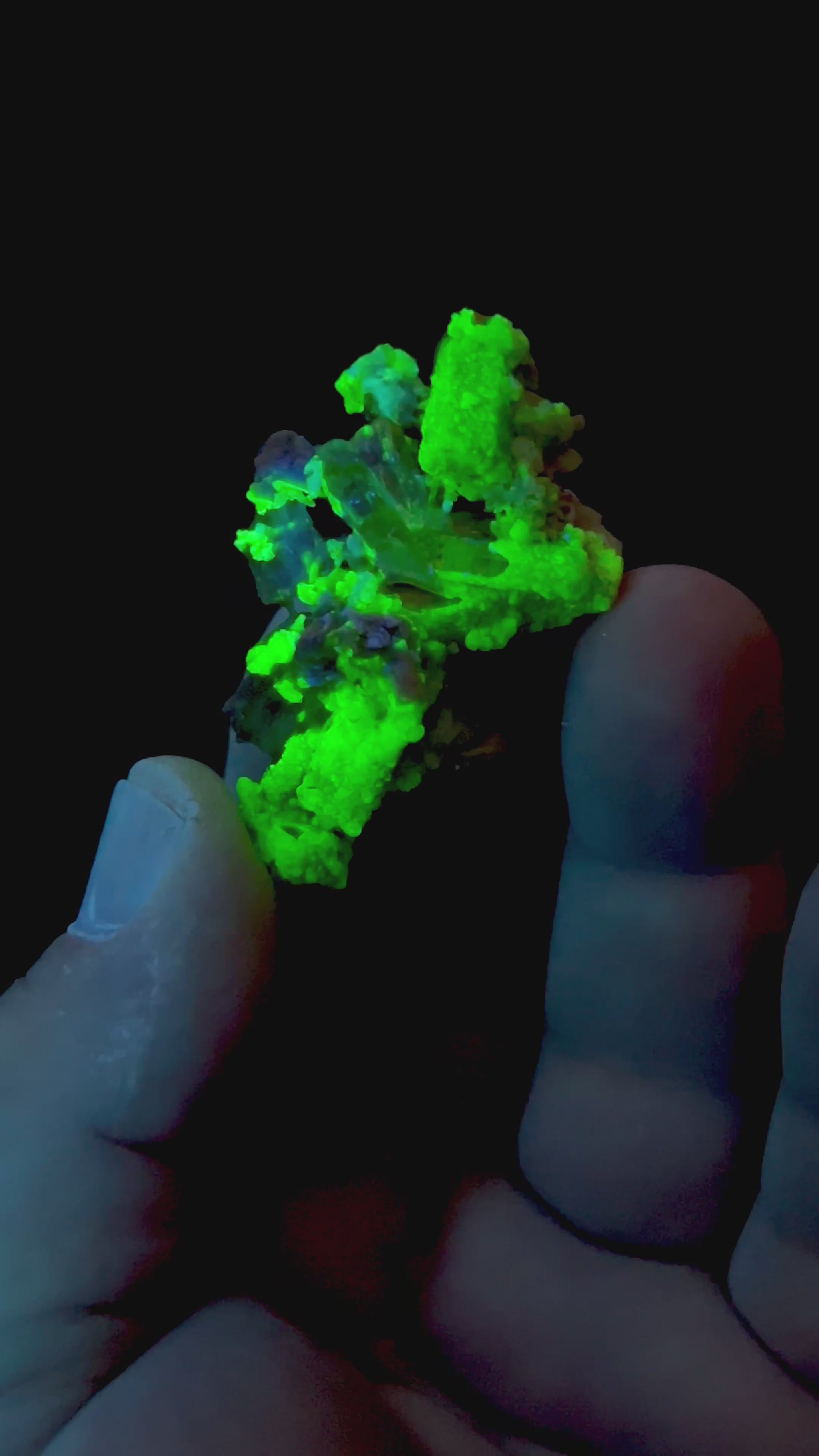 Simply wonderful, this piece comes from a new discovery on the Dobbelsberg farm and features several clear, intense blue aquamarines, one of which is directly coated with hyalite. A stunning effect, and the inexpensive UV light from hardware stores is sufficient for this.