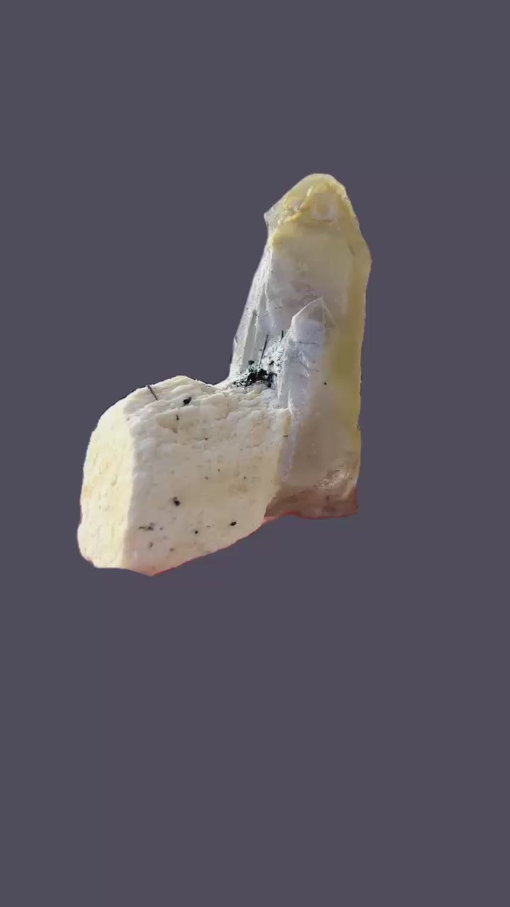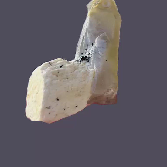Slender quartz crystals on feldspar with a beautiful cape-like coating of hyalite reacting bright neongreen under UV.