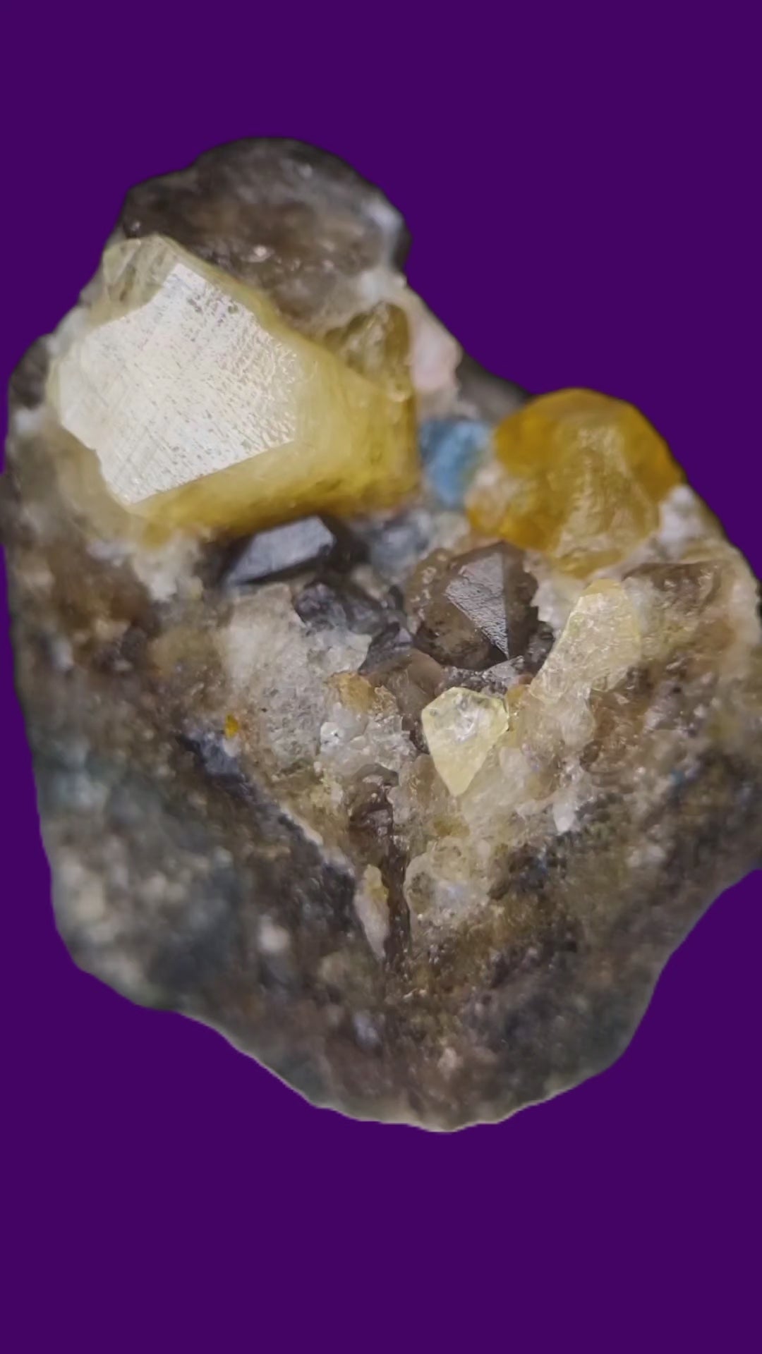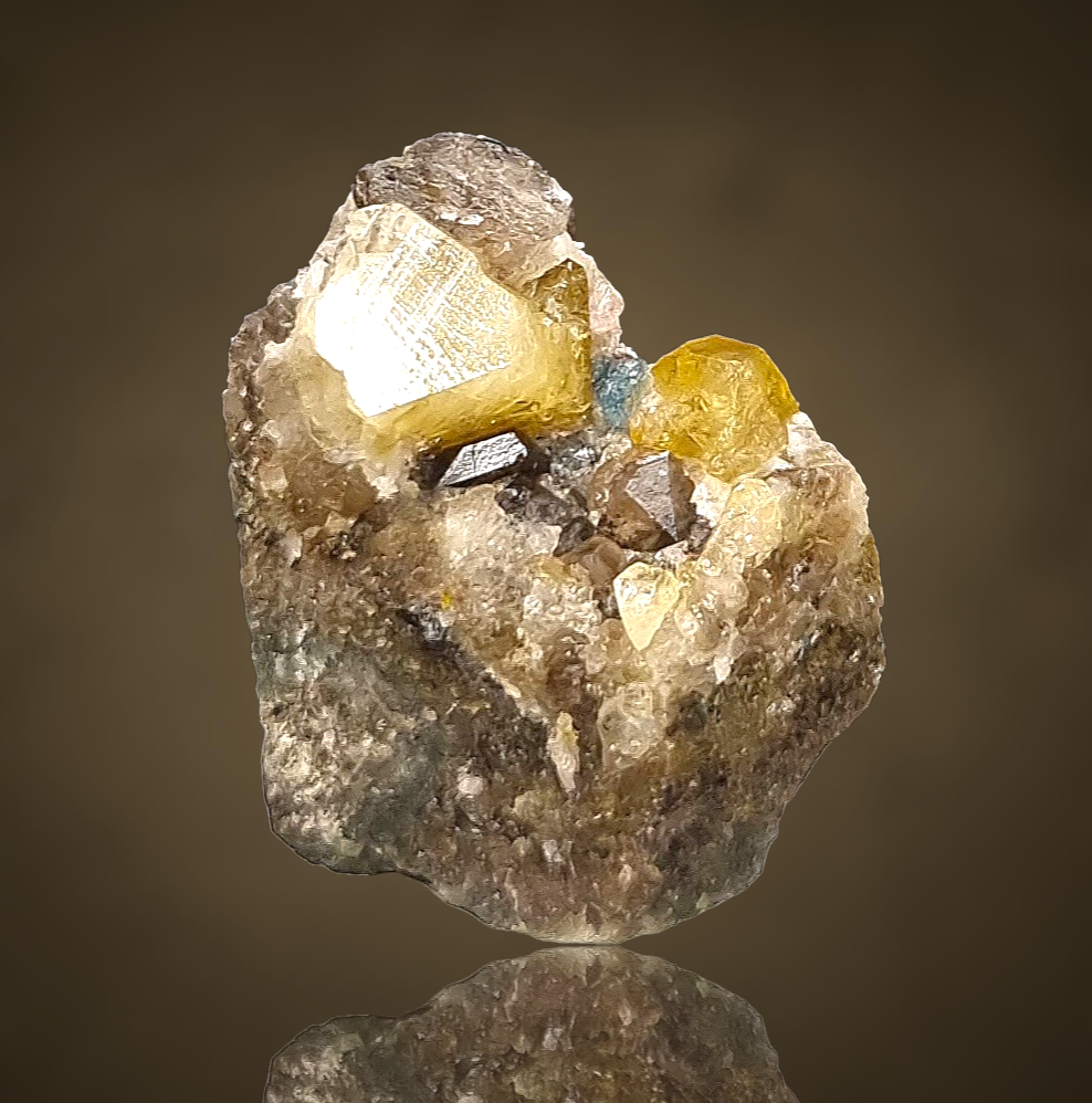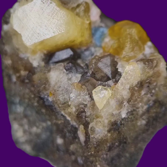 Excellent, gemmy and lustrous sharp londonite crystals in ntense and light yellow on matrix accompanied by smoky quartz crystals and well-contrasting dark blue manganese-bearing fluorapatite from the co-type locality in Madagascar.