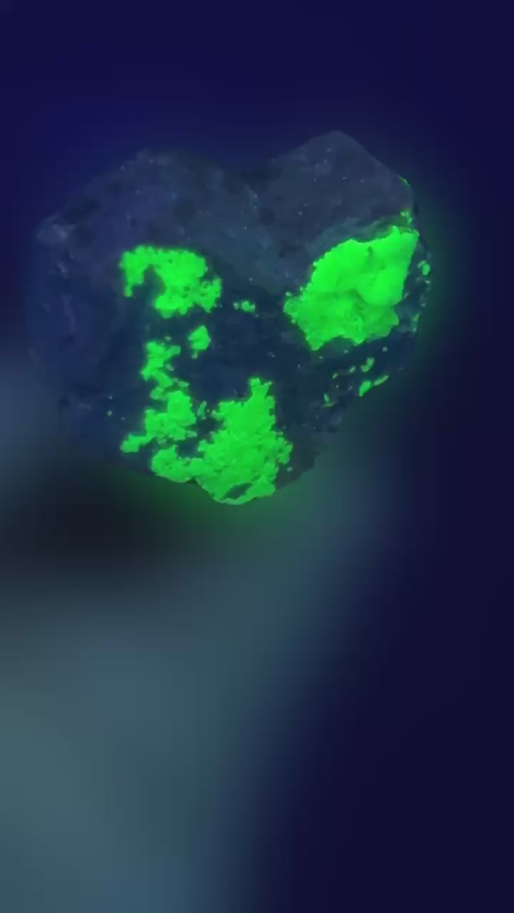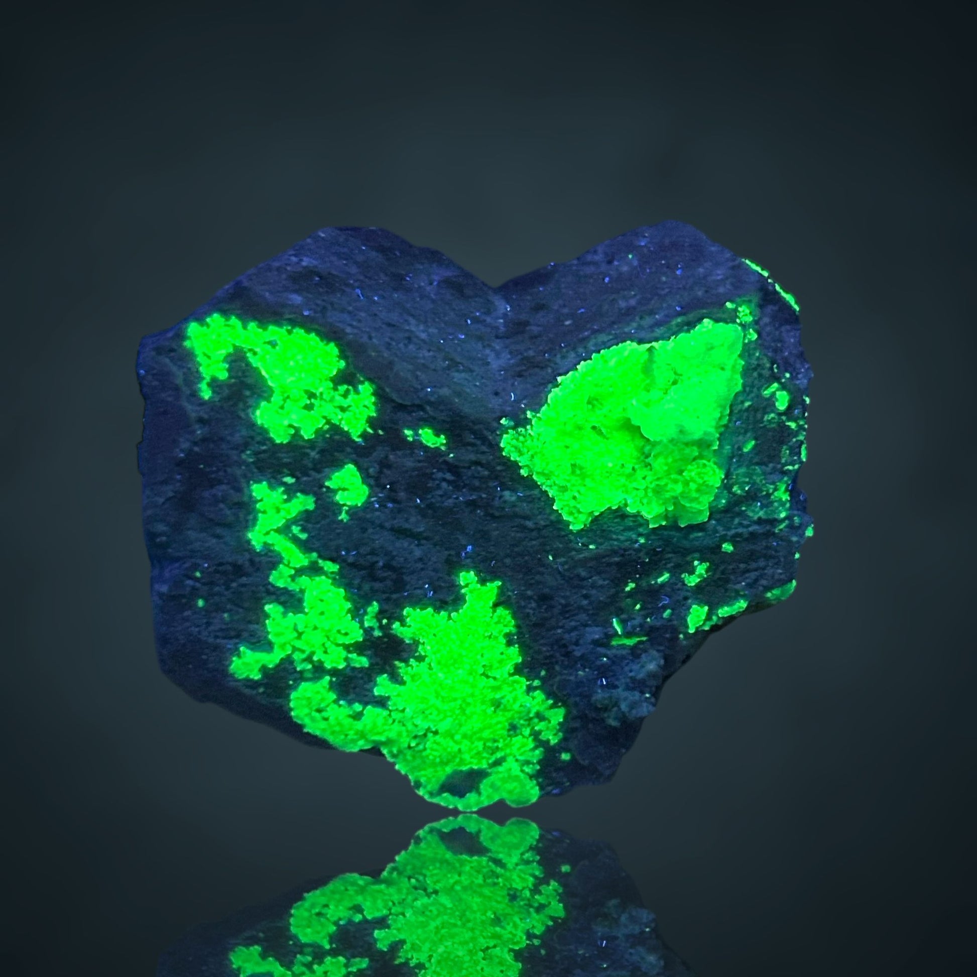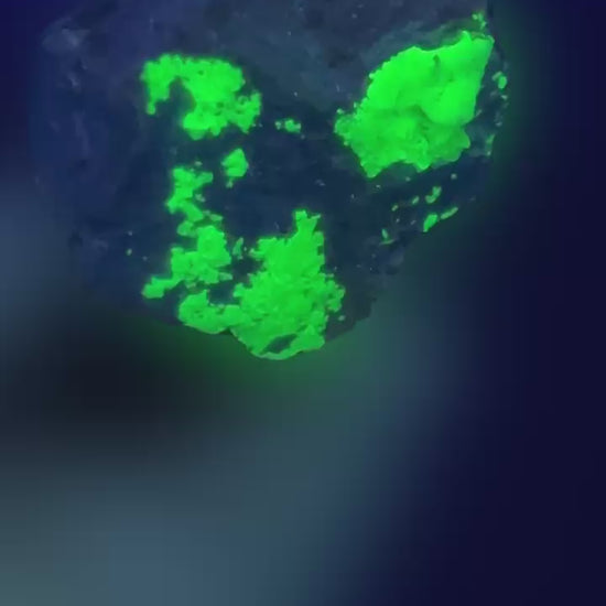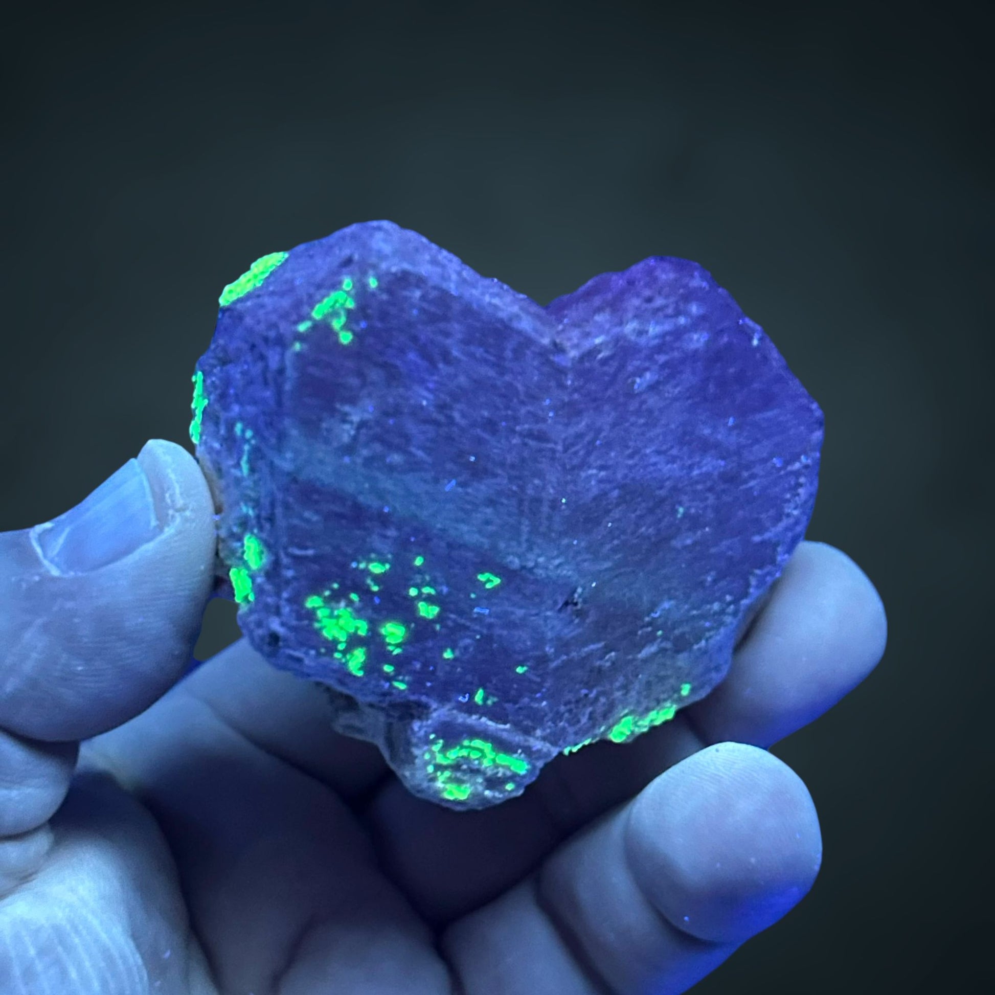 Stunning twinned orthoclase crystal partially draped by hyalite glowing bright green under UV.