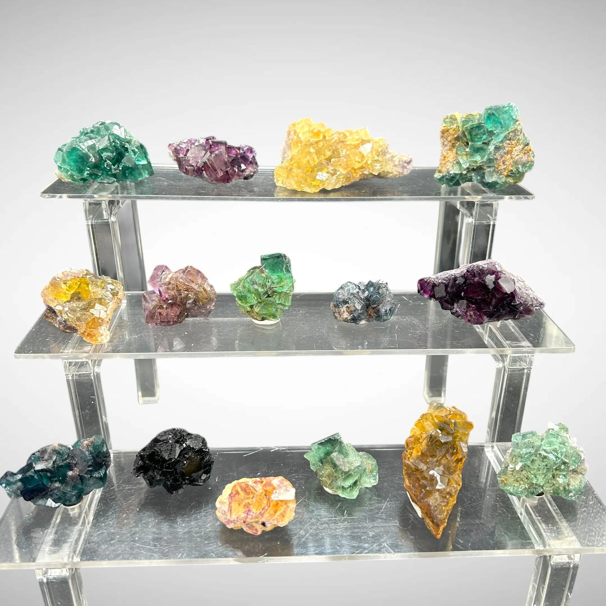 13 mineral specmens from our extensive storage, individually composed and customized to your specifications like certain species, colors, features, varieties, localities and sizes, depending on availability, also upon request for 115 € and 25 specimens for 199 €.