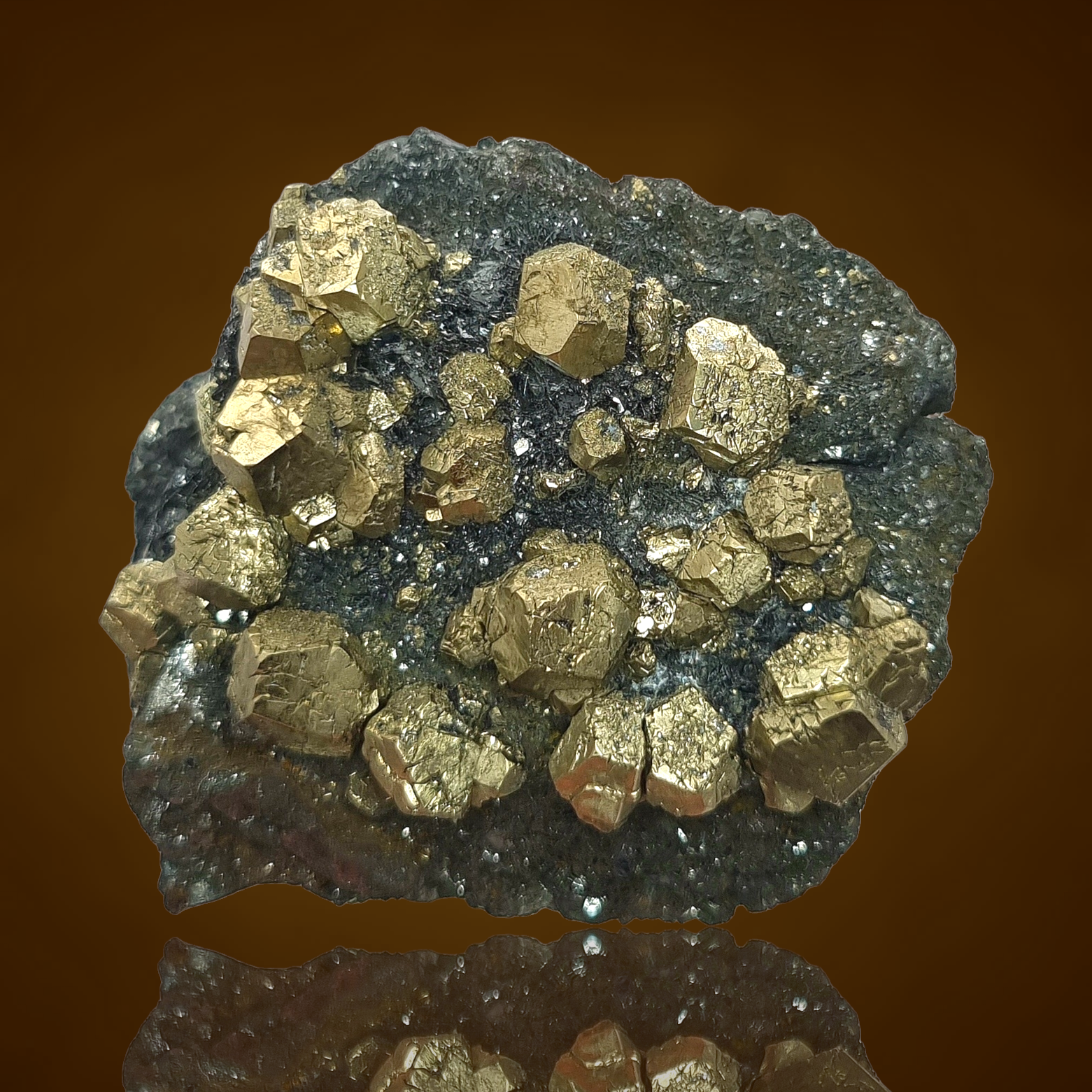 Beautiful, well-formed and lustrous, golden-metallic crystals of pyrite, aesthetically distributed on sparkling, black hematite matrix giving an incredible contrast. From the long closed mines of Rio Marina, Elba, Italy.