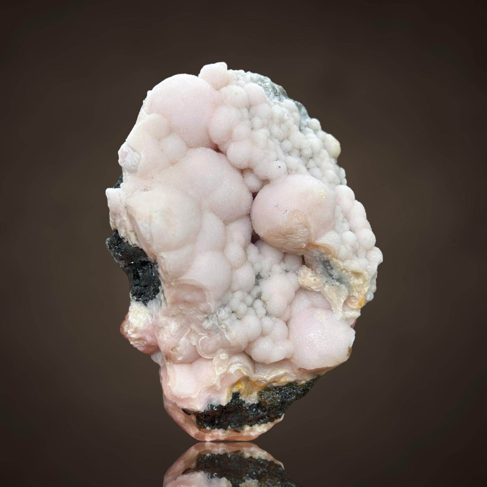 Up to 2.5 cm large rhodochrosite crystals grown as perfect spheres, appearing like floating planets on a layer of sphalerite. An absolute world-class specimen.