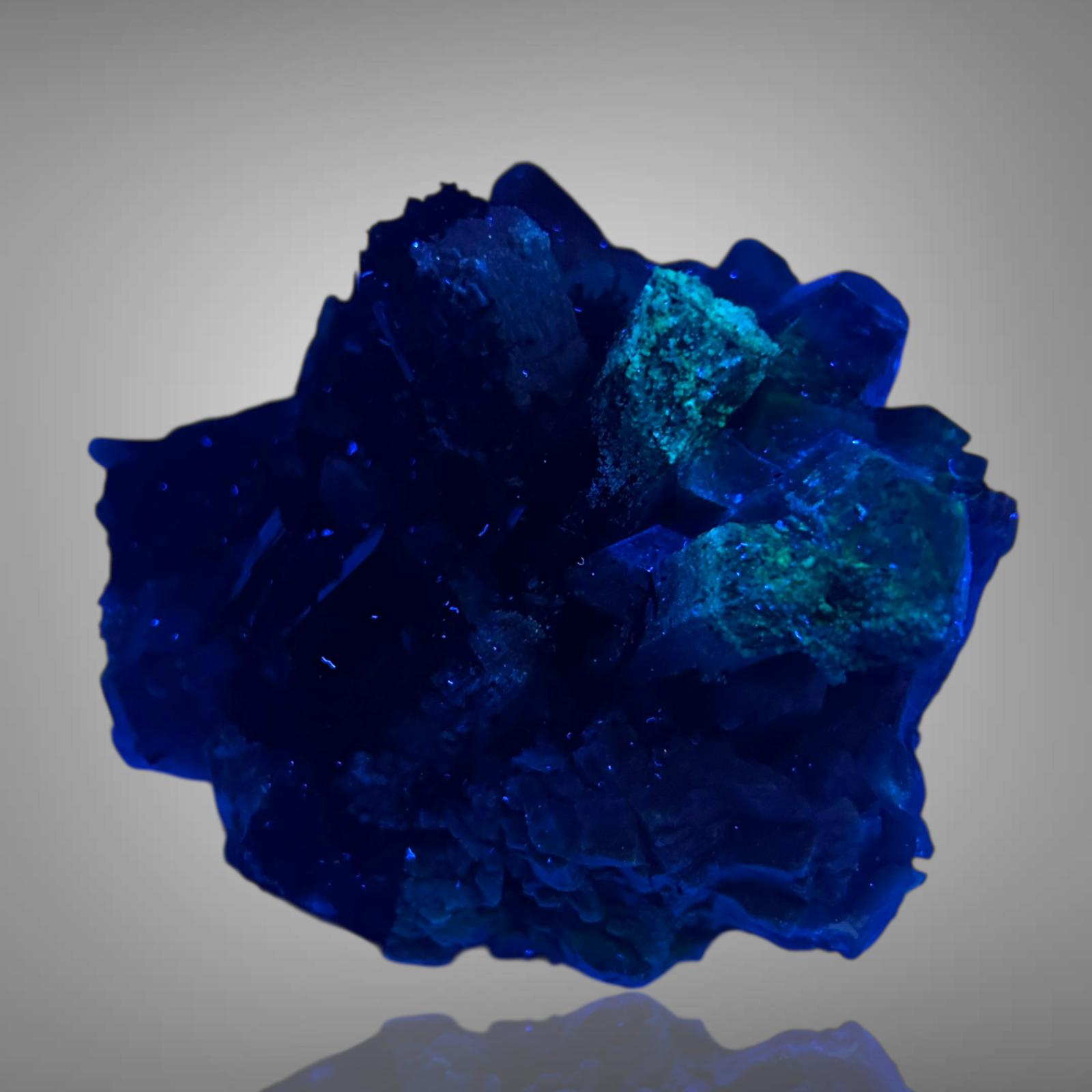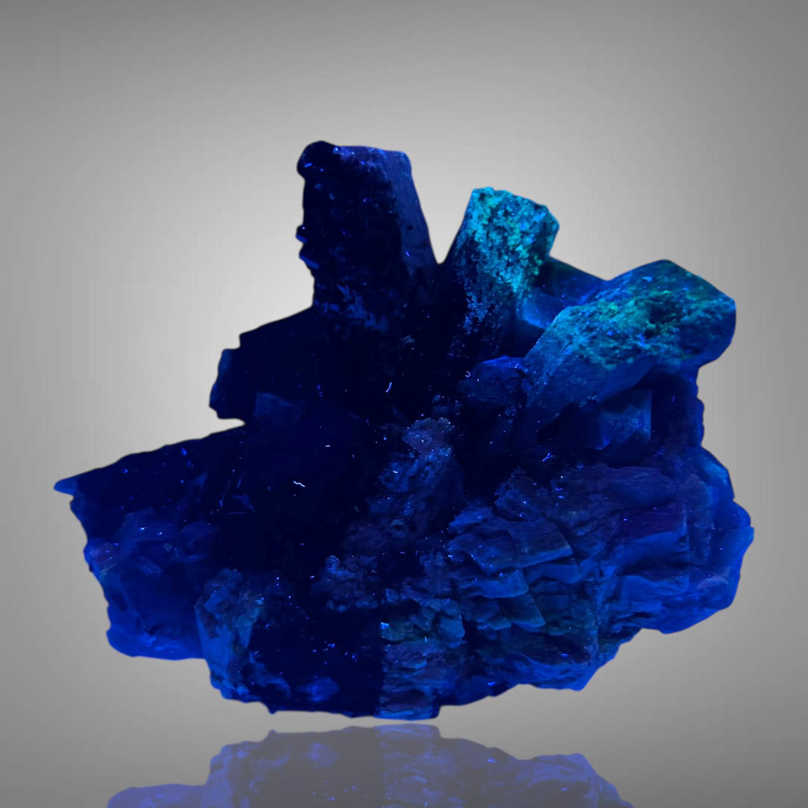 Up to 7 cm long, highly lustrous schorl tourmaline crystals, multifaced, with smoky quartz on orthoclase. Some crystals are adorned with UV-reactive hyalite.