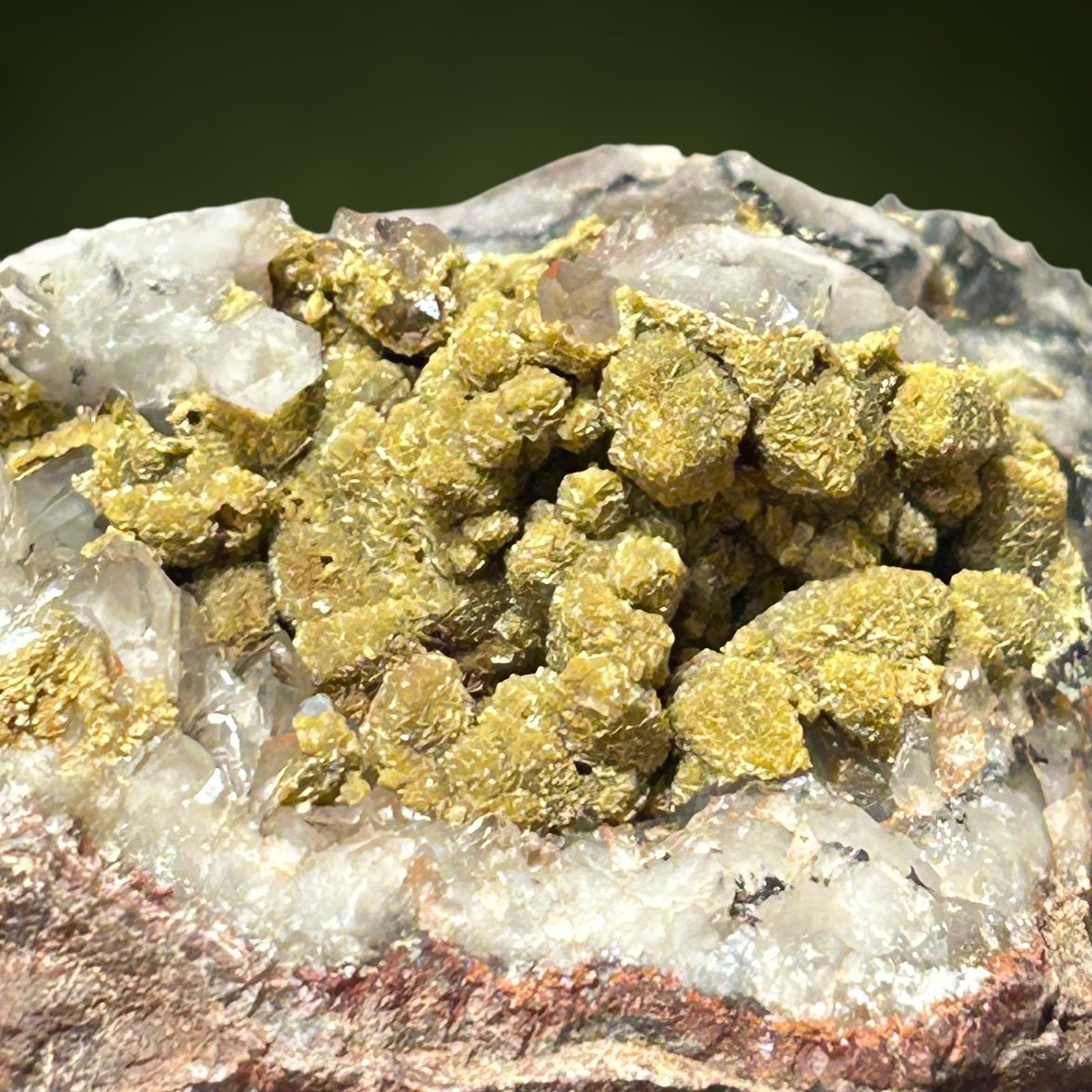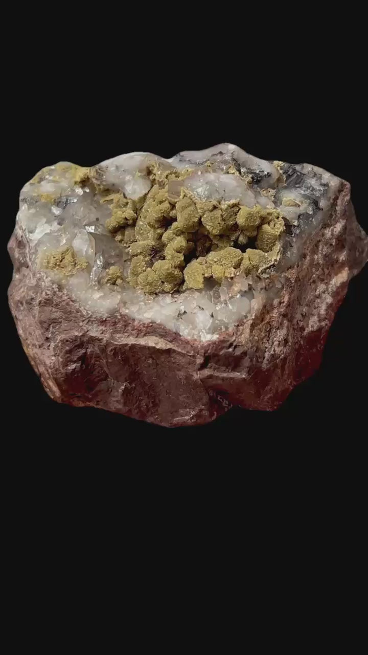 Pretty yellow siderite crystals coating quartz crystals in a vug in andesite matrix.