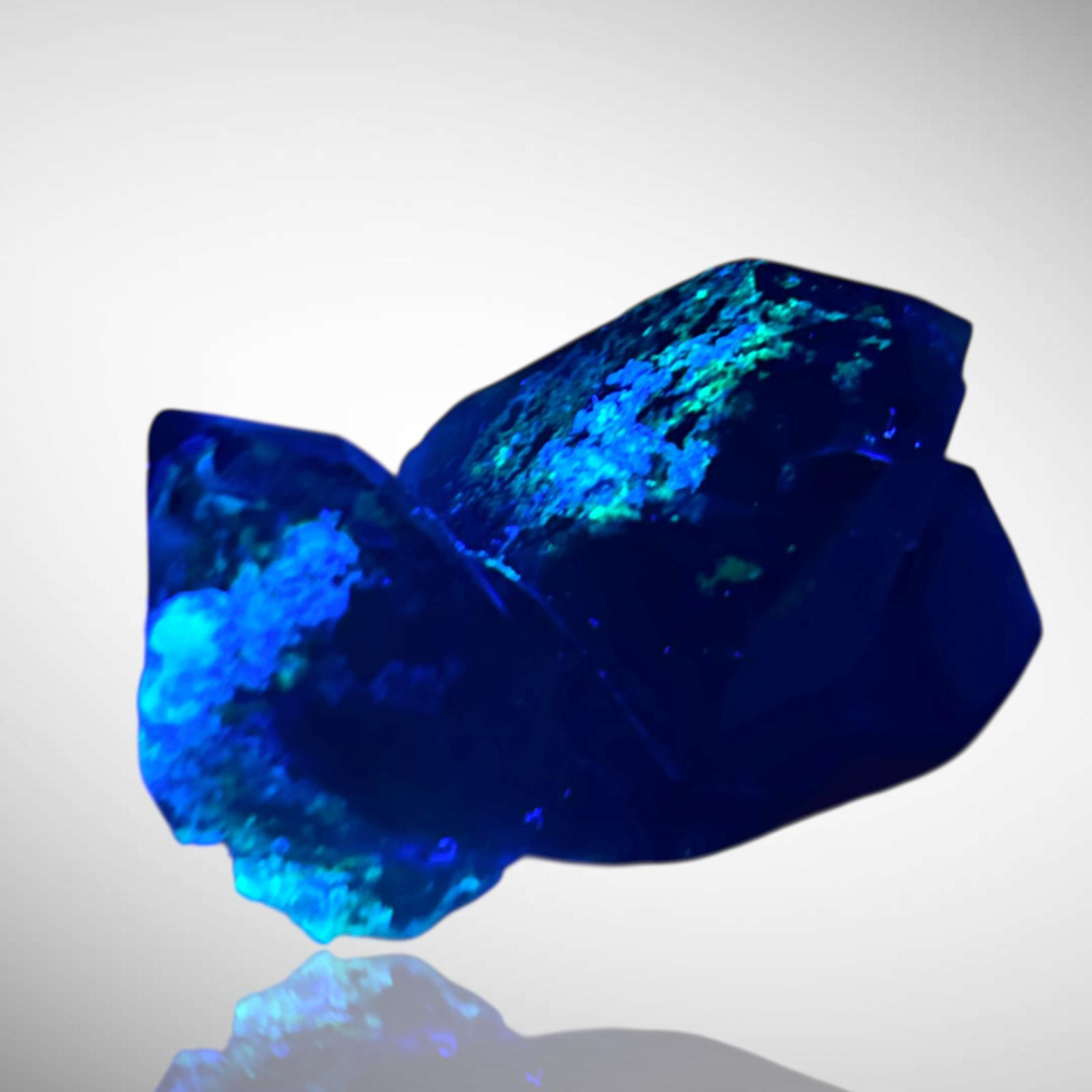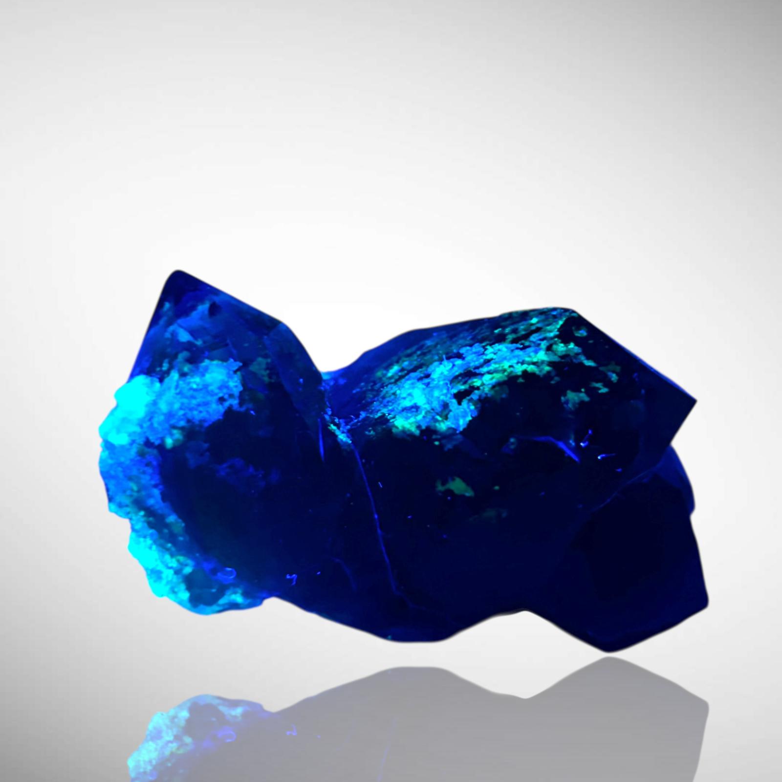 Beautiful gemmy and lustrous brown smoky quartz crystal group accompanied by some hyalite, glowing bright neongreen under UV light.