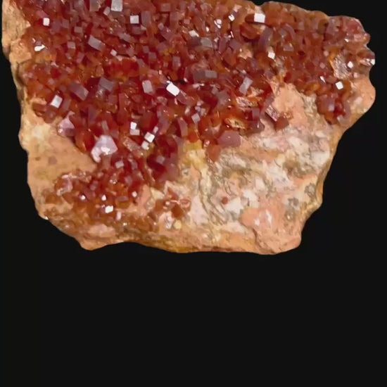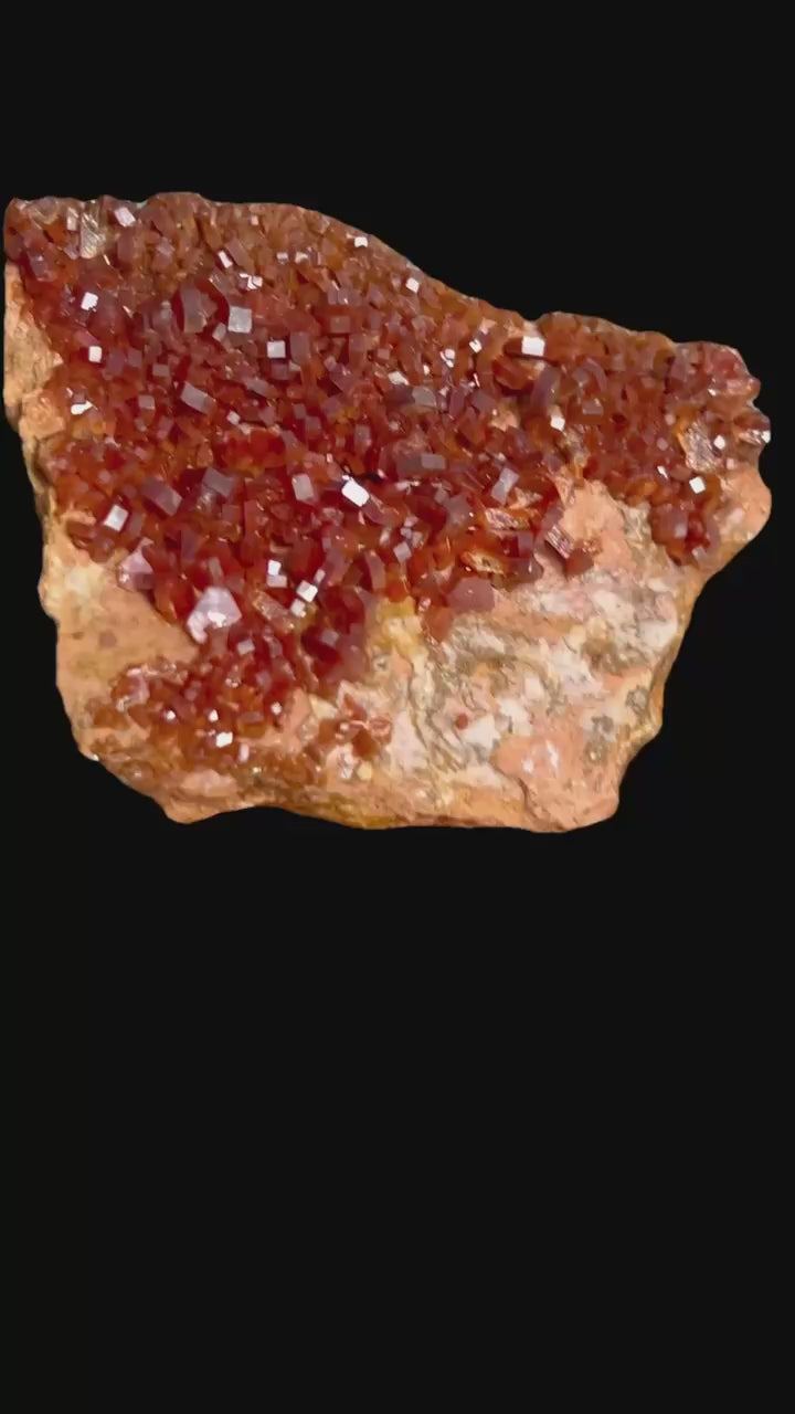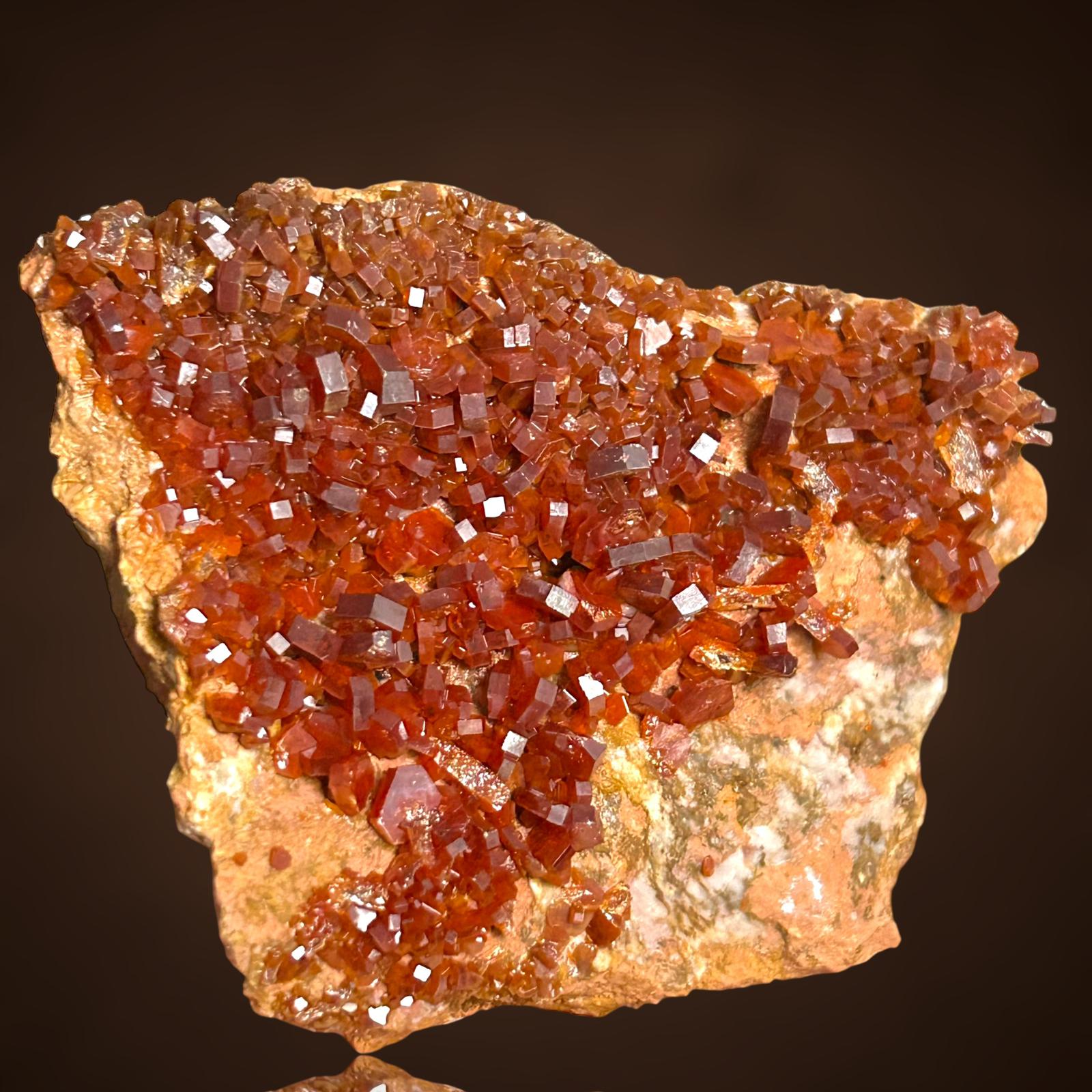 Beautiful, rich specimen of brickred, highly lustrous and sparkling, hexagonal vanadinite crystals on sandstone matrix from the.classic locality Mibladen in Morocco.